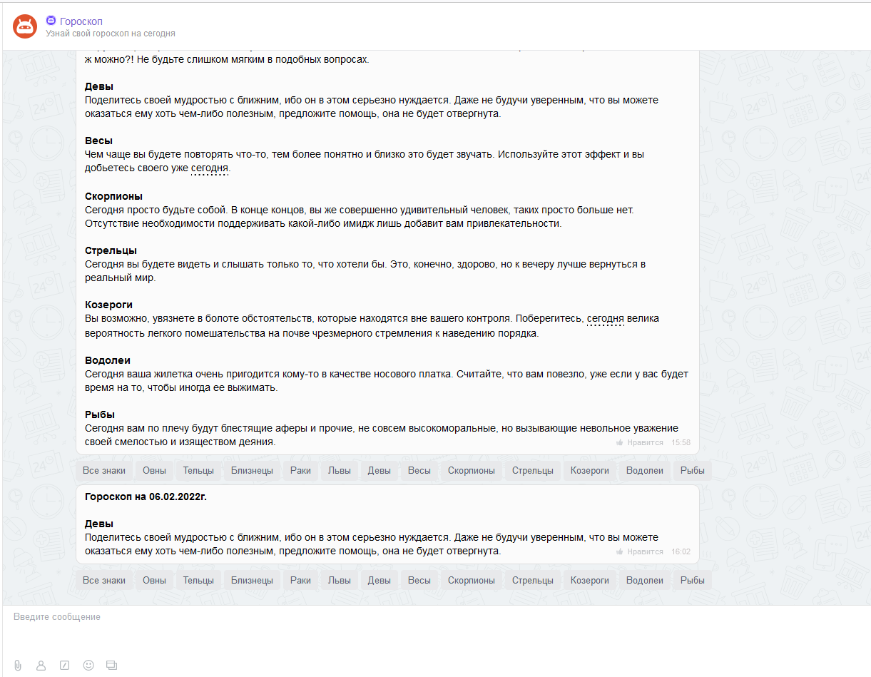 Также мы добавили чат-бот "Гороскоп", через него вы можете узнать гороскоп прямо в чате.