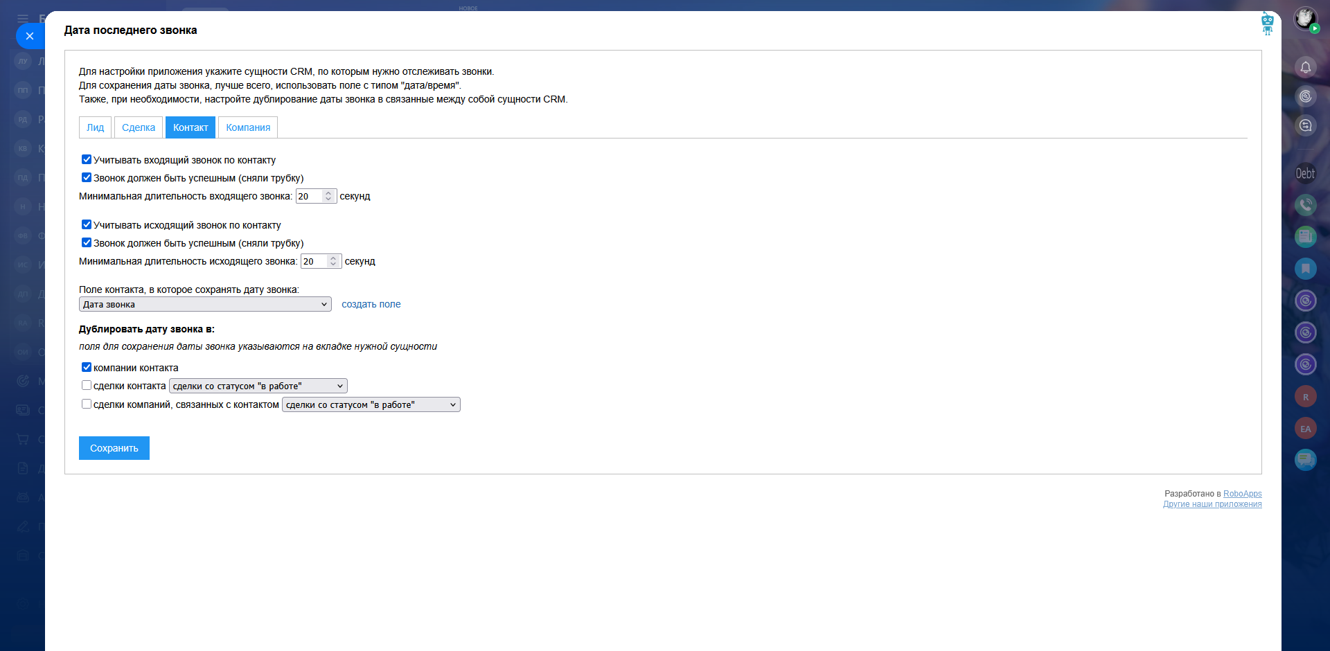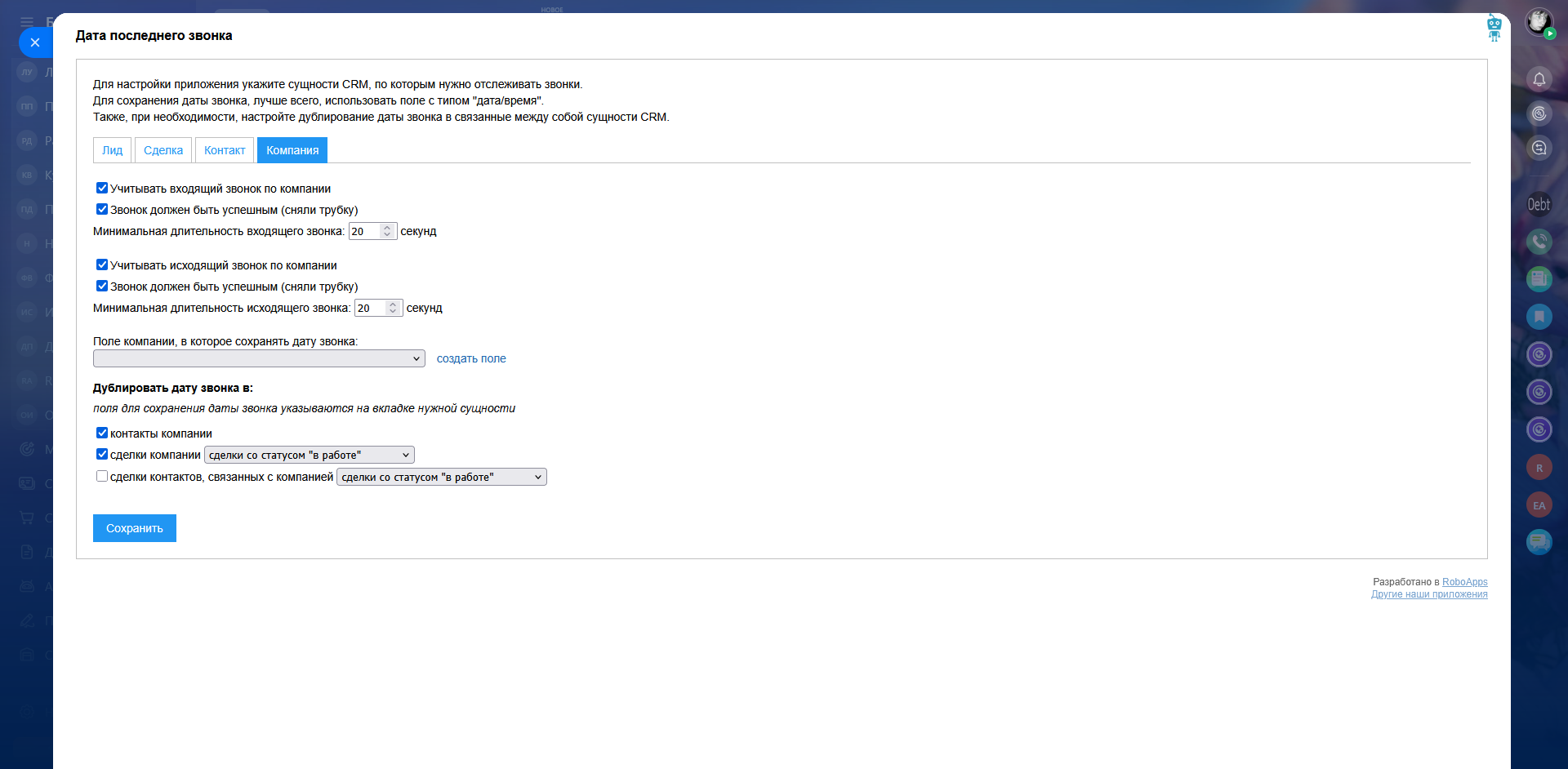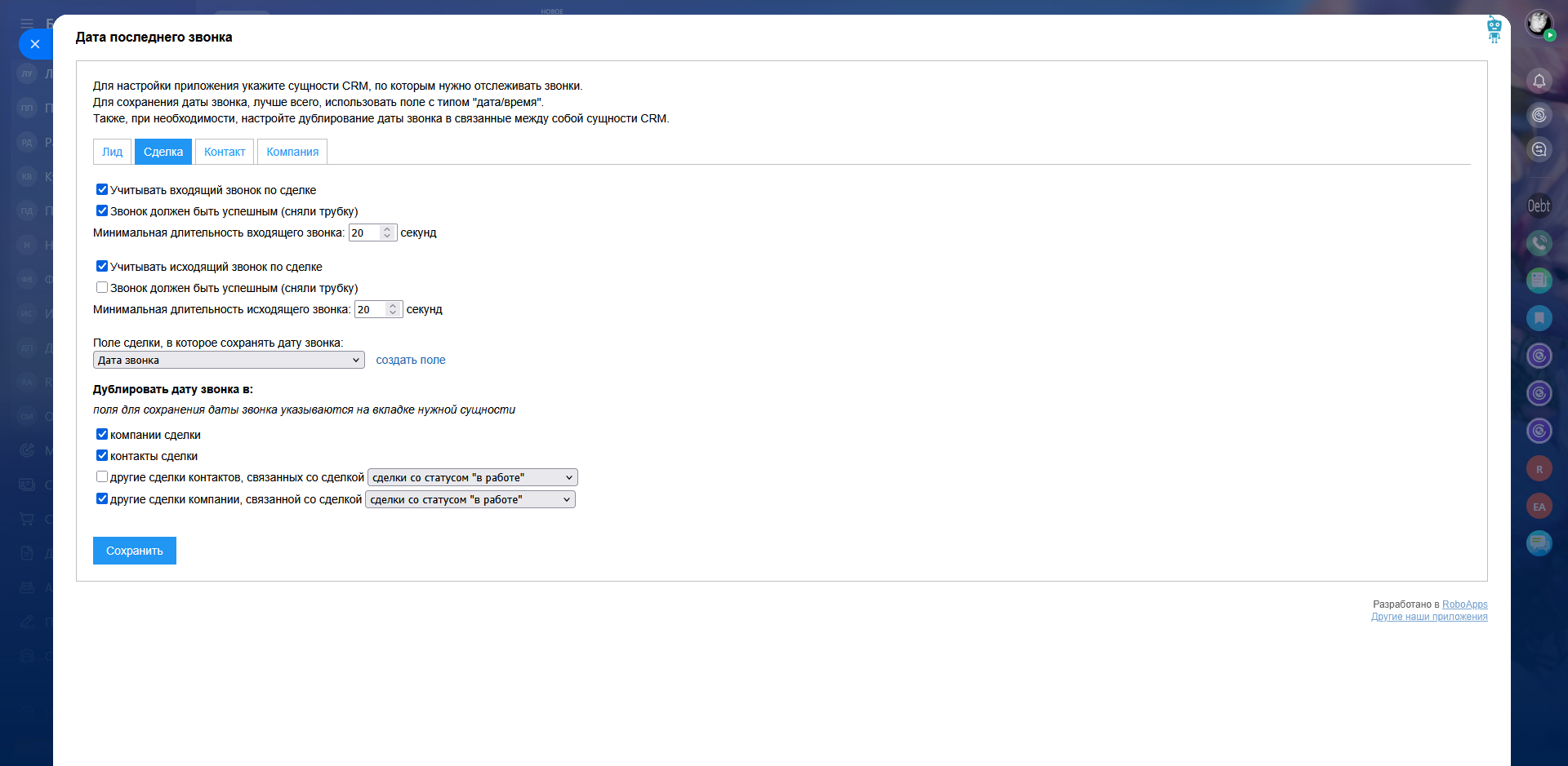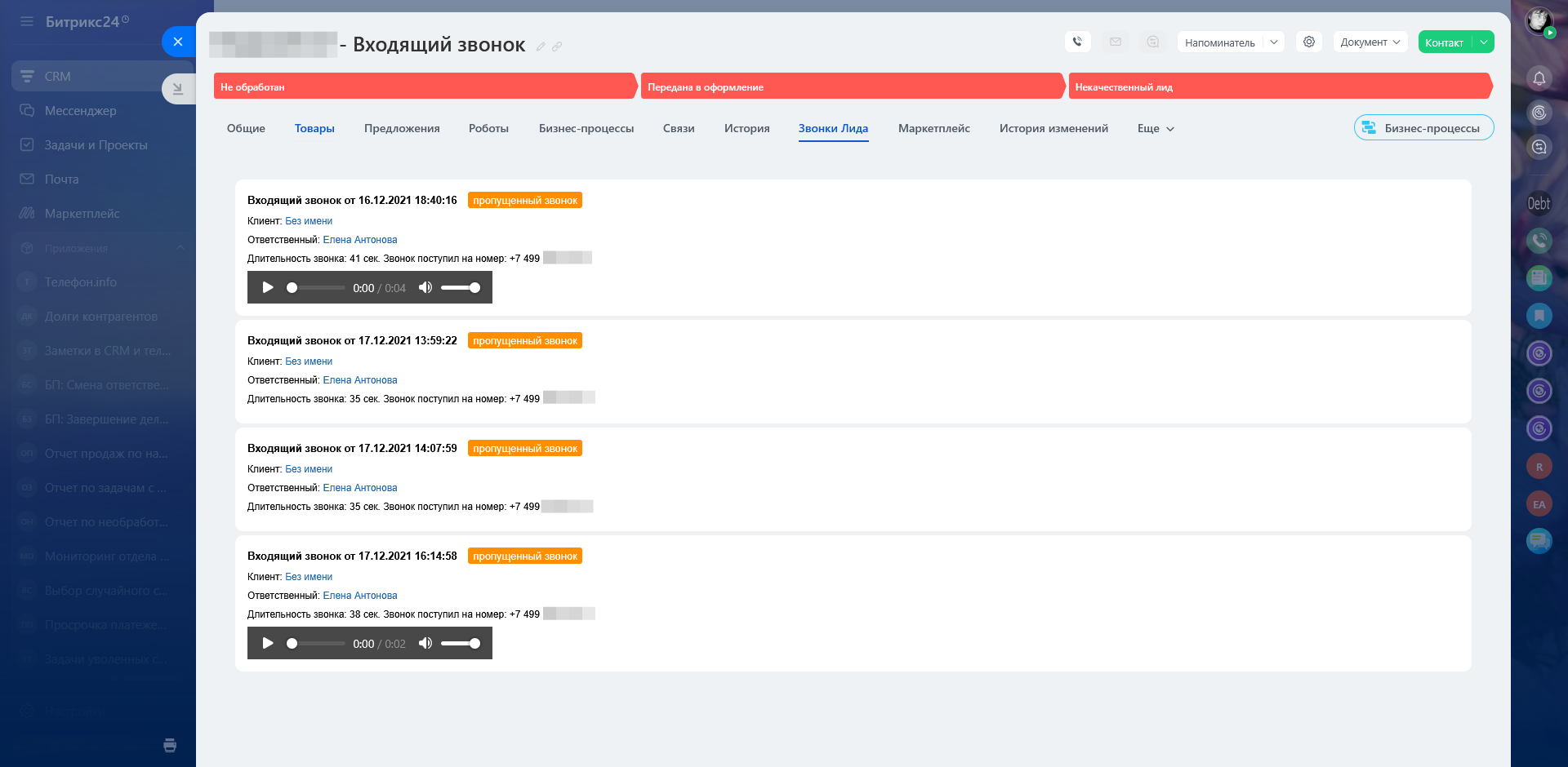 В карточках CRM (лид, сделка, контакт и компания) Вам будет доступна вкладка со списком звонков по этой сущности. В ней Будет базовая информация о звонке, с возможностью прослушать запись разговора.
