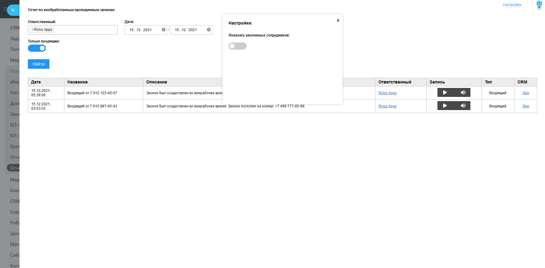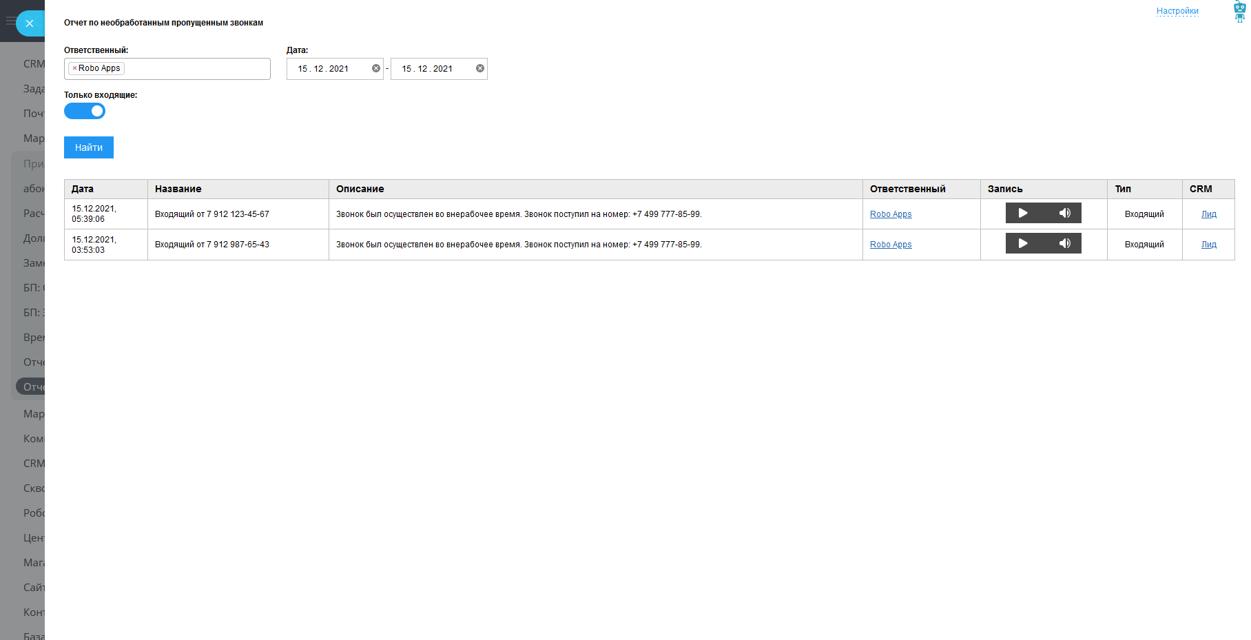 По умолчанию приложение показывает только входящие звонки, но в фильтре вы можете выбрать опцию отображения как входящих, так и исходящих пропущенных звонков. Так же вы можете отфильтровать звонки по ответственному (на кого поступил звонок) и по дате звонка. По умолчанию в списке звонков отображаются звонки за текущий день.