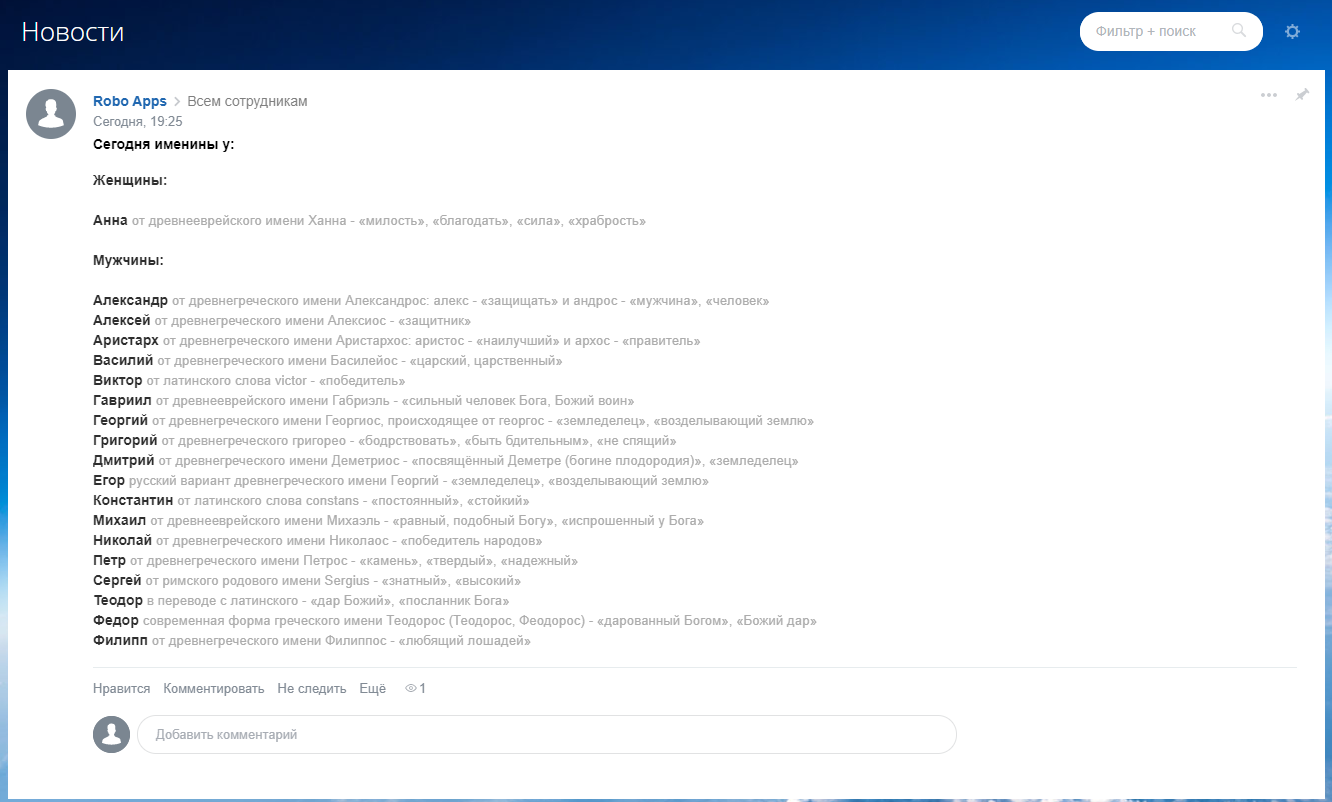 Благодаря приложению "Именины в живую ленту" вы будете ежедневно получать список именин на текущий день в живую ленту вашего Битрикс24.