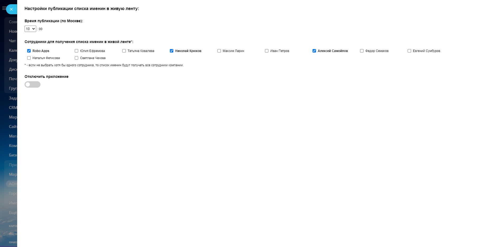 - выбрать получателей списка именин (сотрудников компании) в живой ленте.