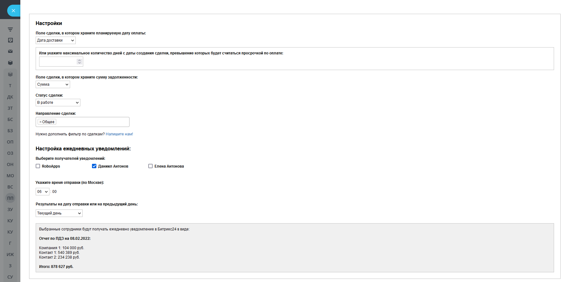- Поле сделки, в котором храните сумму задолженности. Если вы храните в сделке сумму, которую осталось оплатить клиенту, то это поле нужно указать. Оно и будет являться суммой ПДЗ. В противном случае будет выводится сумма сделки.