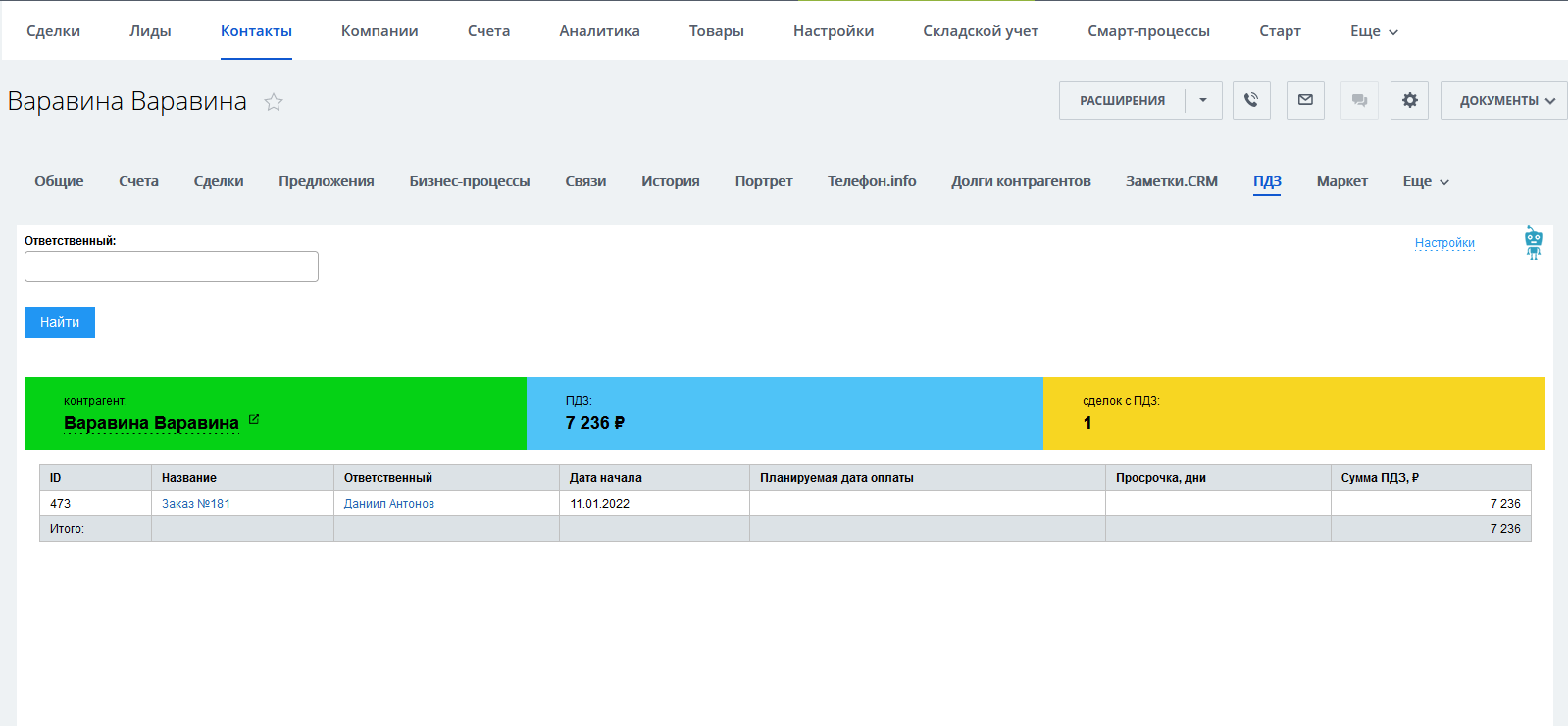 Приложение встраивается в карточку компании и контакта. Таким образом, прямо из карточки вы можете увидеть текущее состояние по ПДЗ с данным контрагентом.