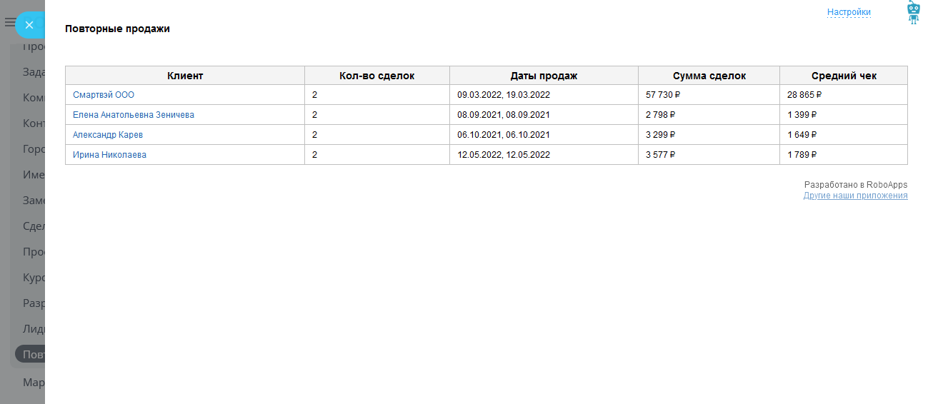 Приложение позволяет найти клиентов в Вашем Битрикс24, которые совершали повторные покупки.
