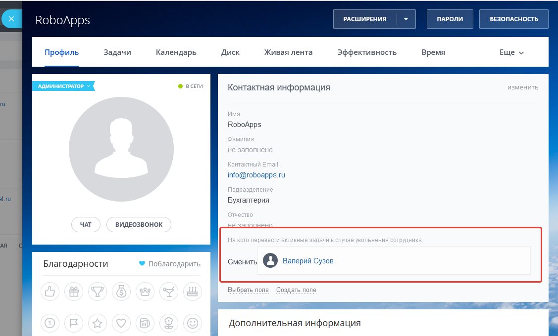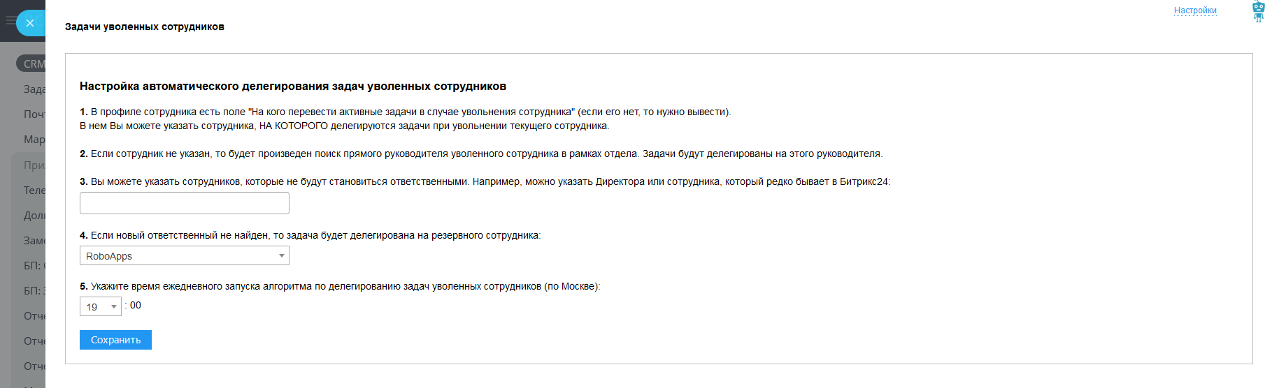 Приложение показывает задачи по уволенным сотрудникам с возможностью сменить ответственного или закрыть задачи. Есть возможность настроить автоматическую смену ответственного задачи уволенного сотрудника.
