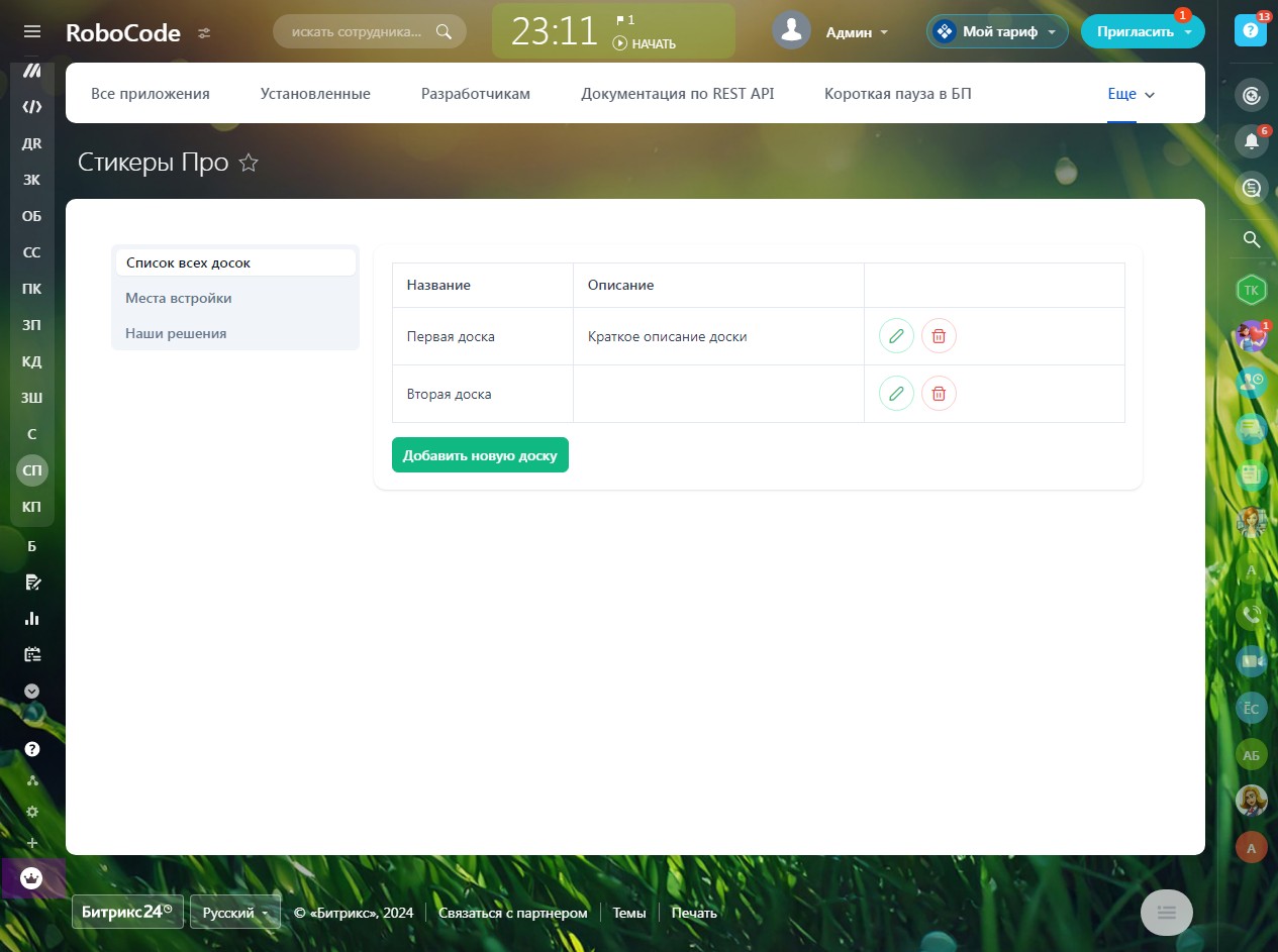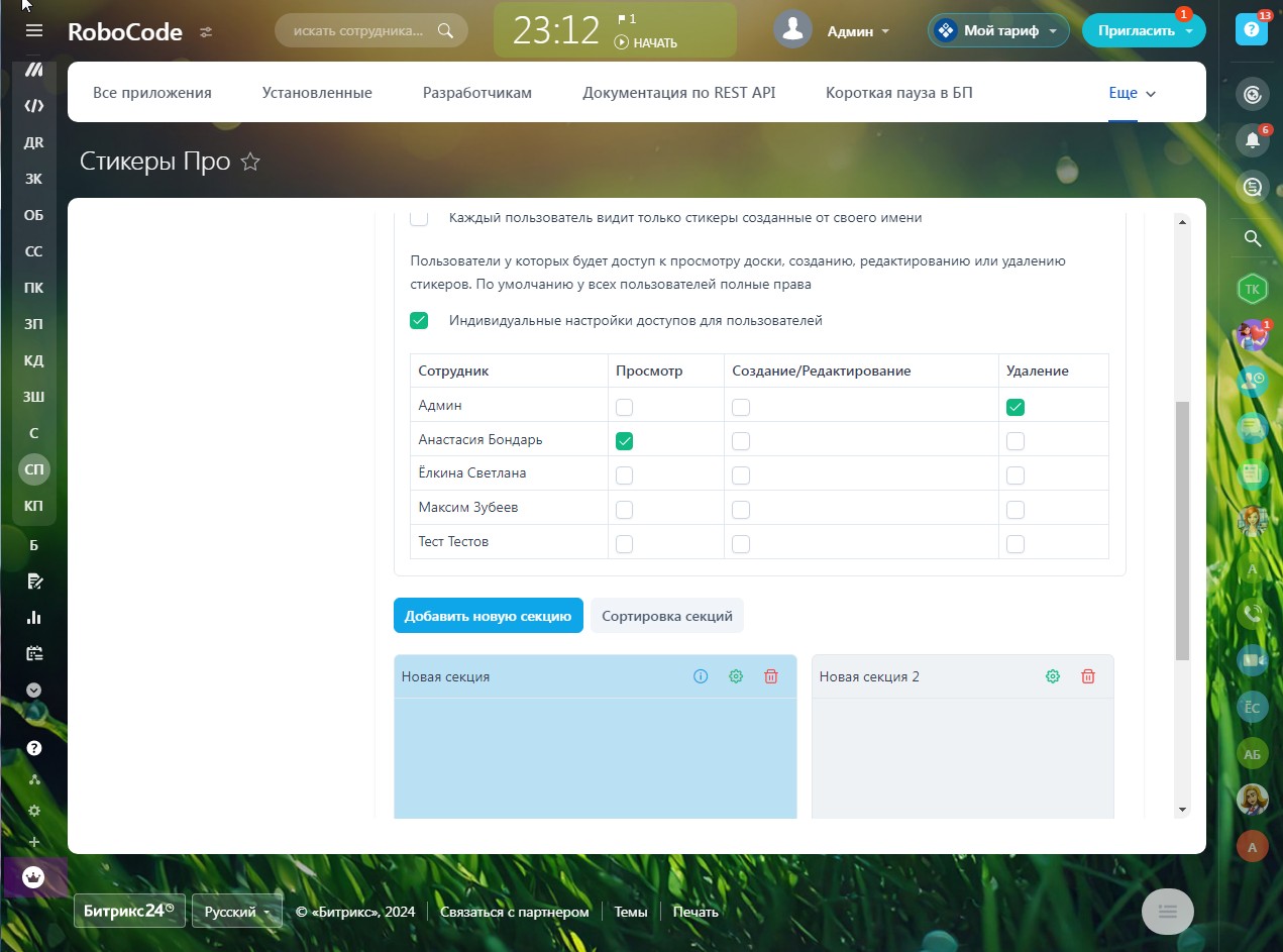 - Индивидуальные настройки прав доступа пользователей для досок