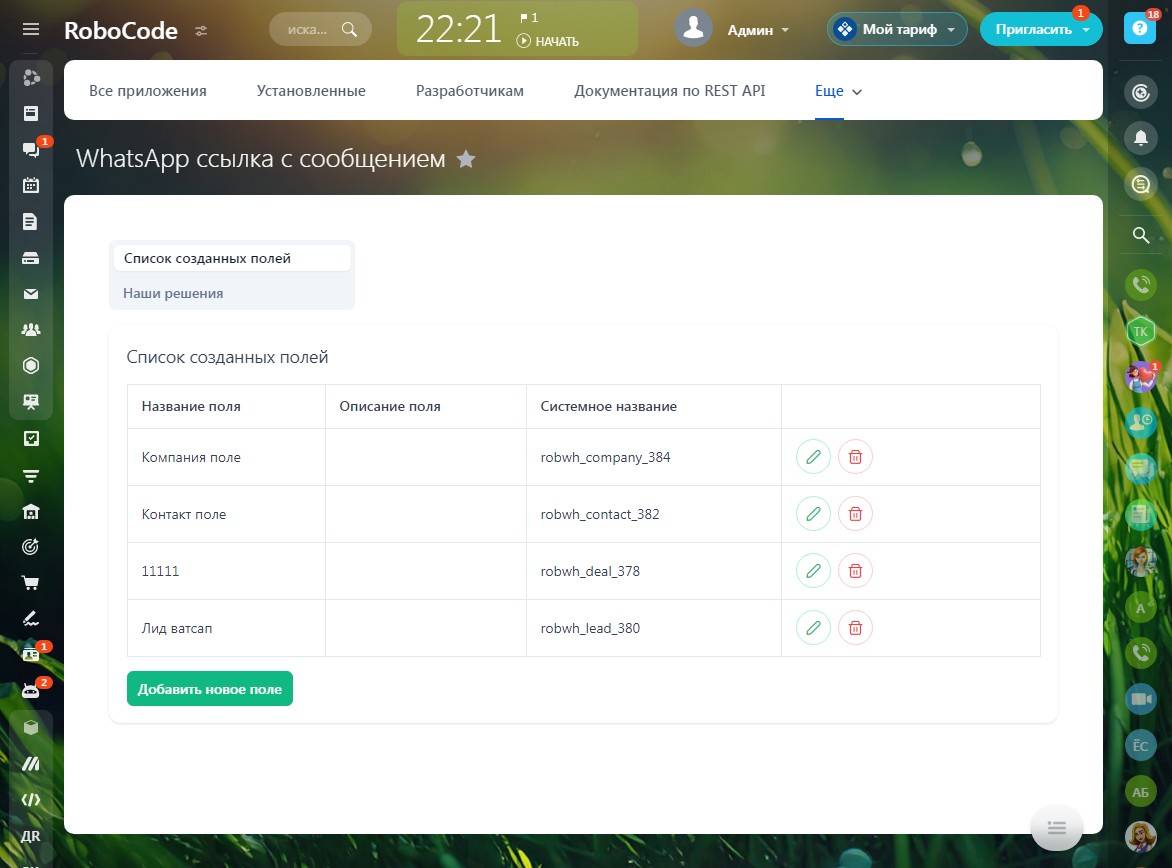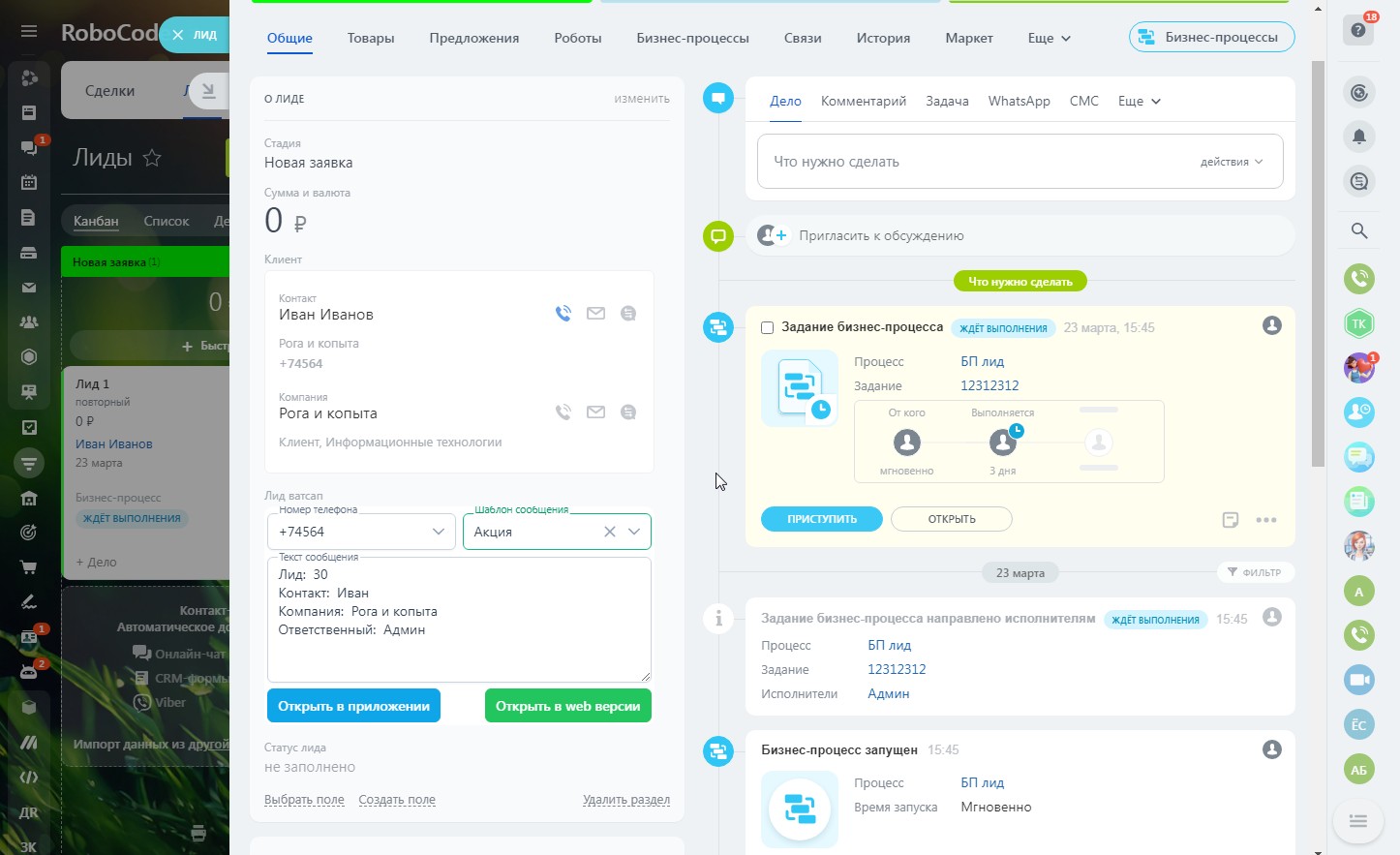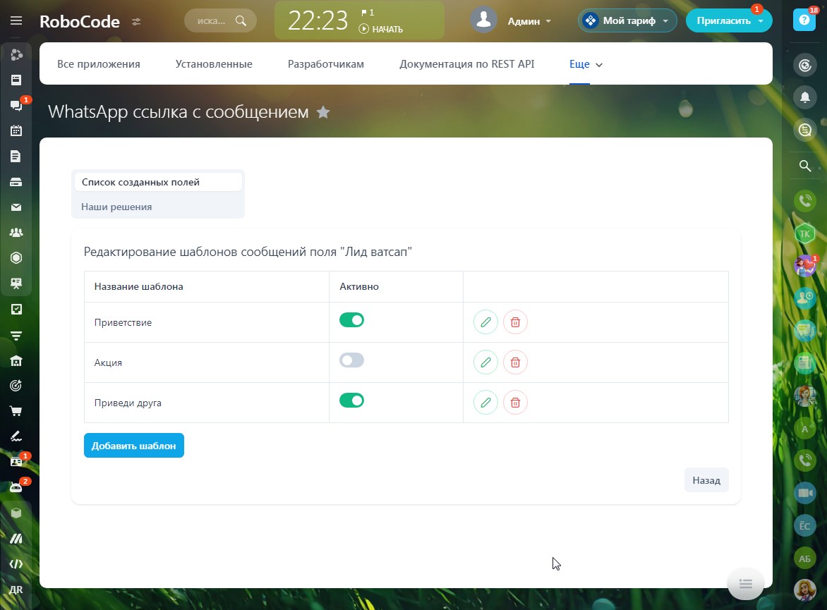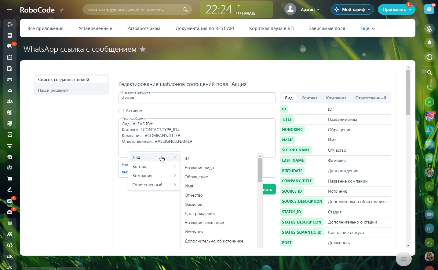 Приложение позволяет бесплатно отправлять сообщение клиентам из карточек Сделки, Контакта, Компании или Лида. После настройки приложения в карточке появляется новое поле с текстом сообщения и кнопками для перехода в веб-версию или приложение WhatsApp.