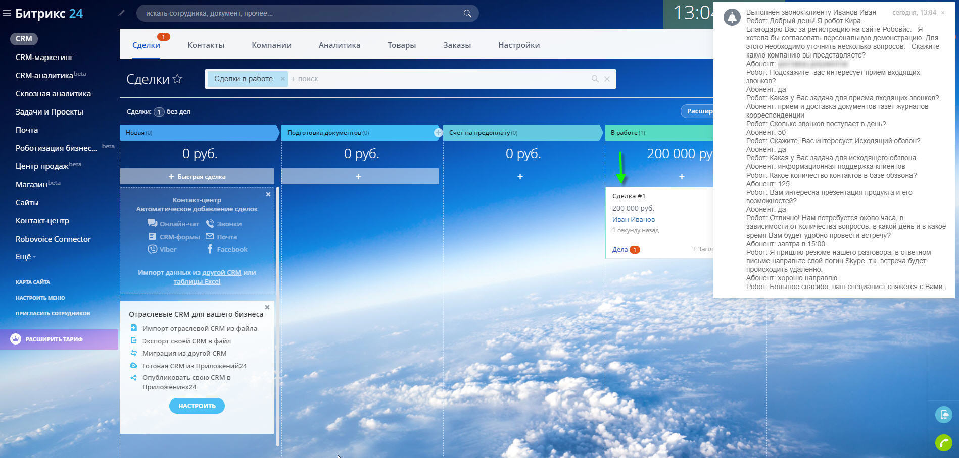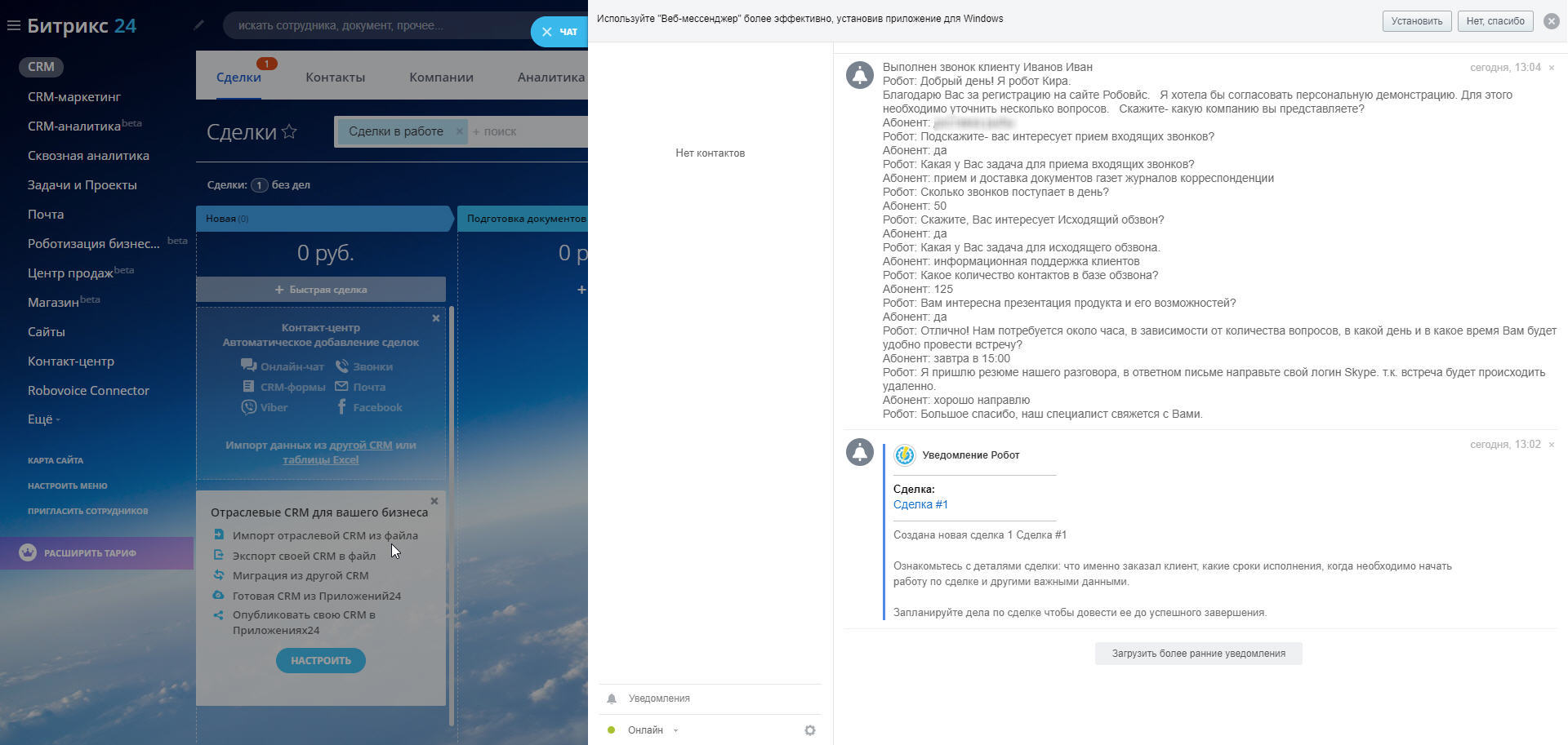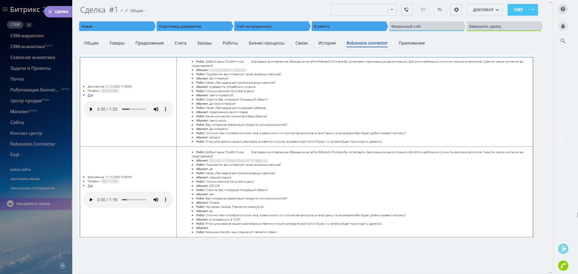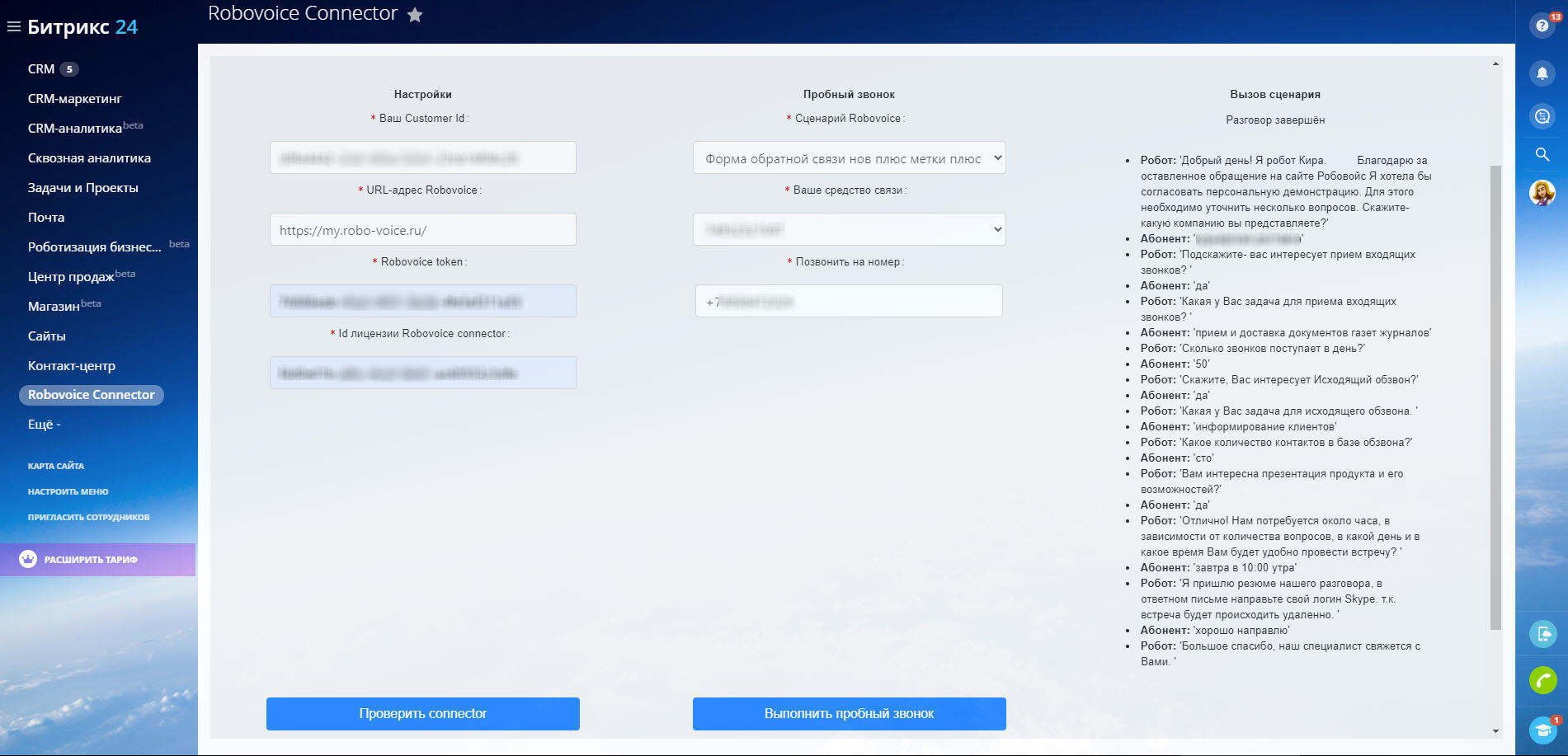 Вы пользуетесь CRM Bitrix24 и хотите попробовать подключить к разговорам с клиентами голосового бота? Специально для вас мы разработали бесплатный коннектор, позволяющий пользоваться всеми возможностями Robovoice прямо из интерфейса Битрикс! Вы просто устанавливаете наше расширение, активируете его и работаете с голосовым ботом в привычной CRM.