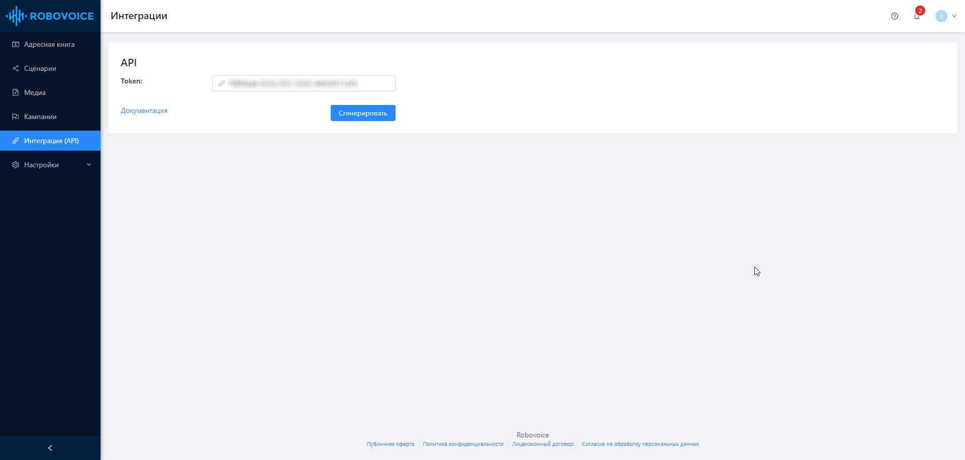 1. Генерируете токен в личном кабинете Robovoice API и получаете у менеджера ключ лицензии (бесплатный);