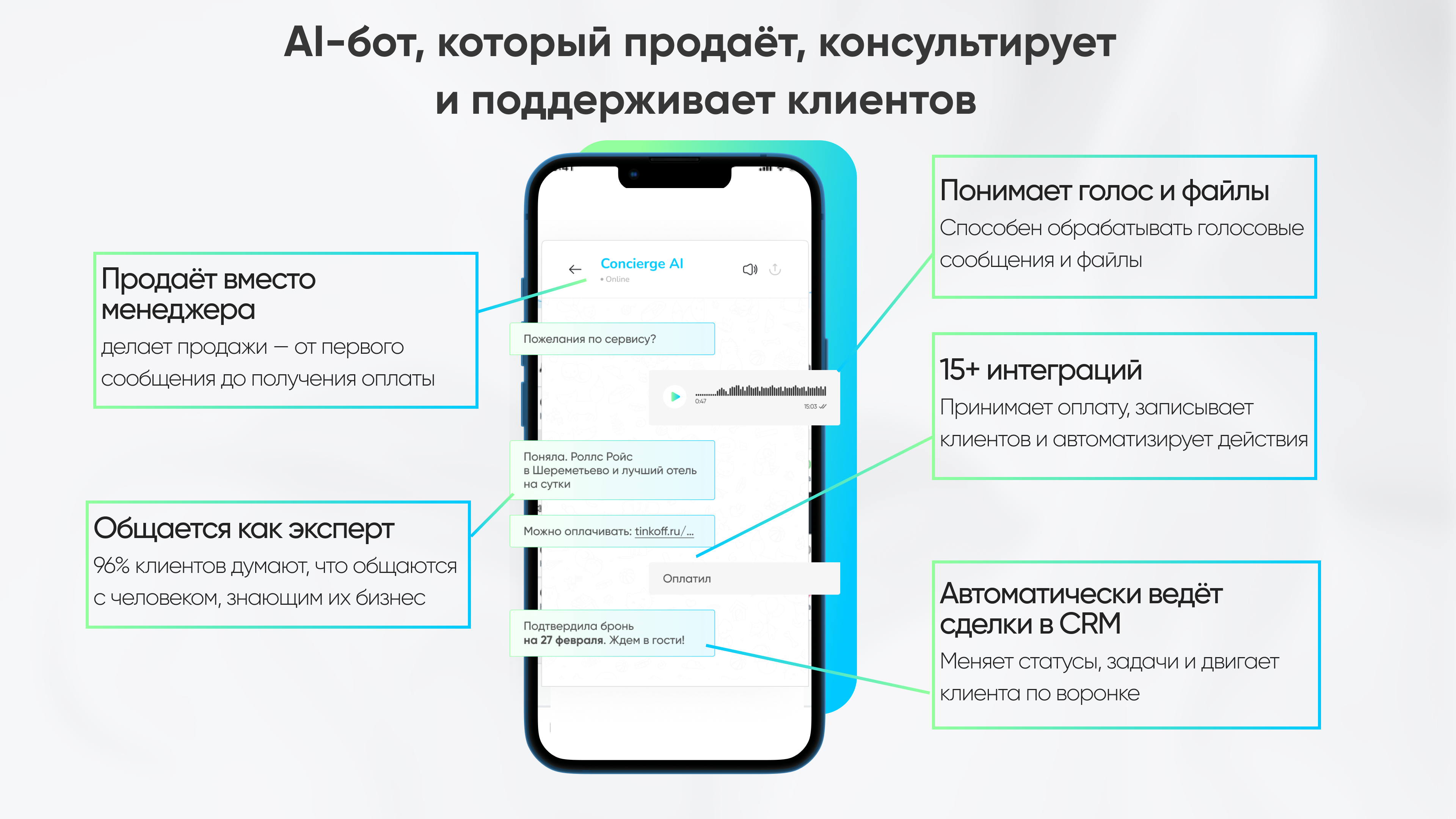 Он мгновенно отвечает клиентам 24/7, фиксирует лиды прямо в CRM и помогает менеджерам быстрее закрывать сделки.