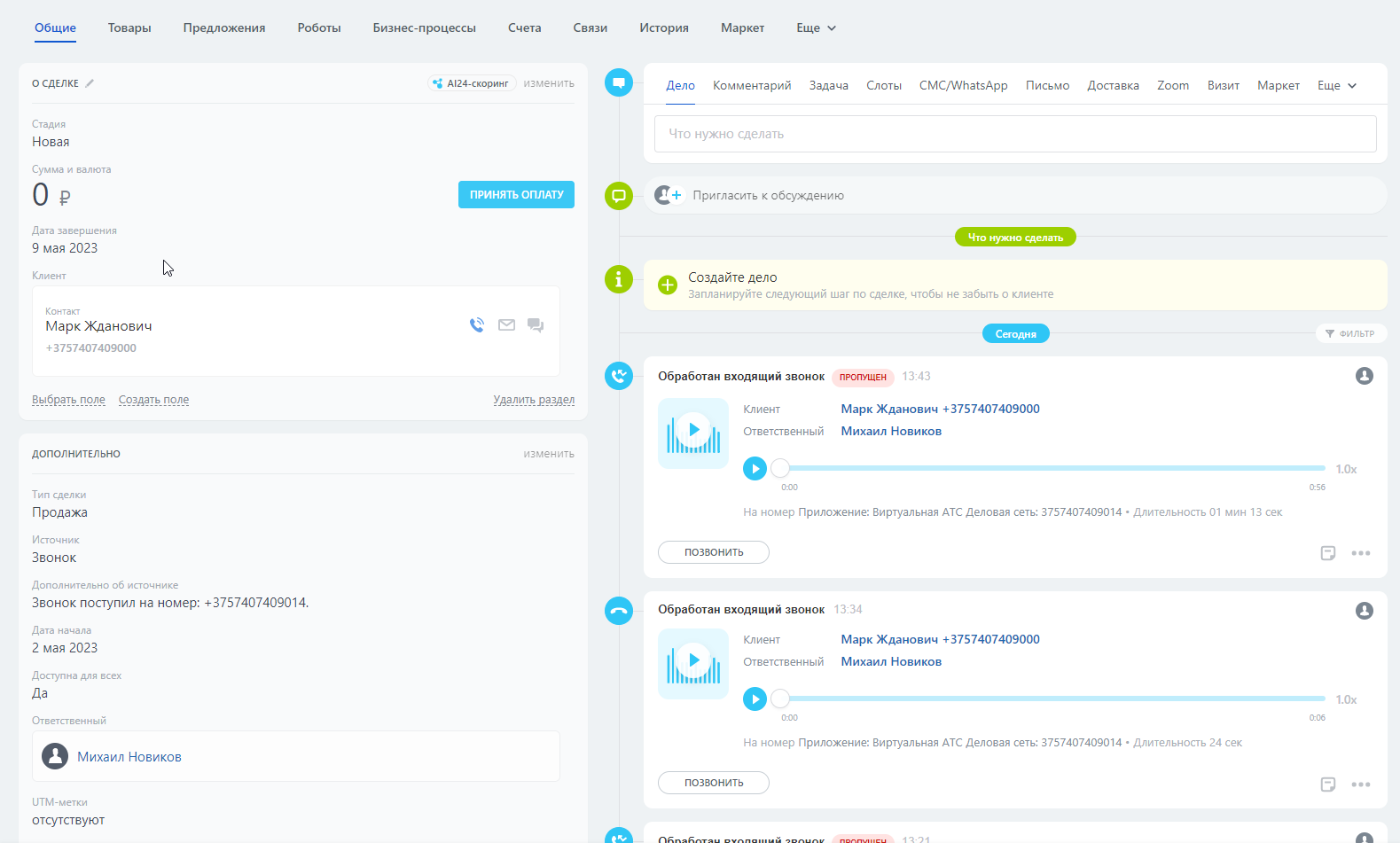 - Автоматическое создание лидов при входящем или исходящем звонке;
