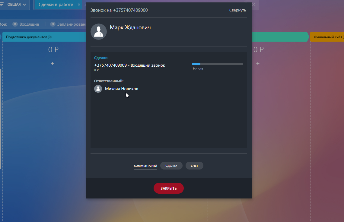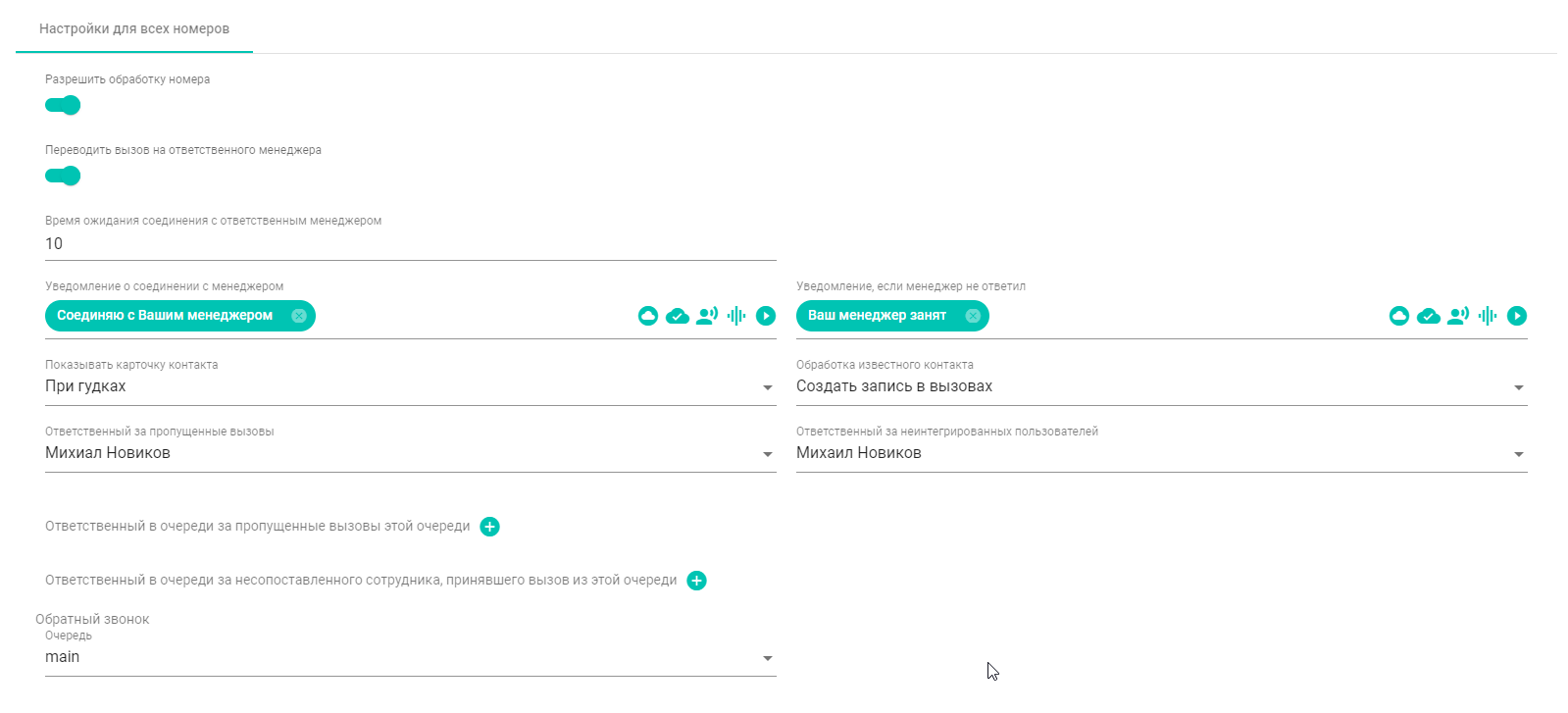 - Распределение звонков на ответственного менеджера;