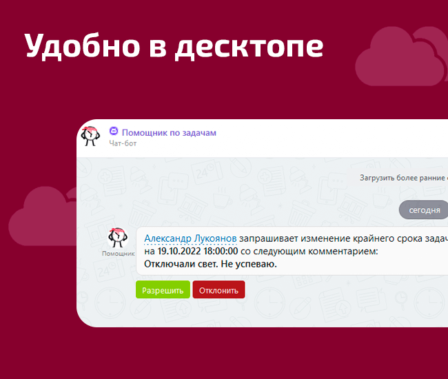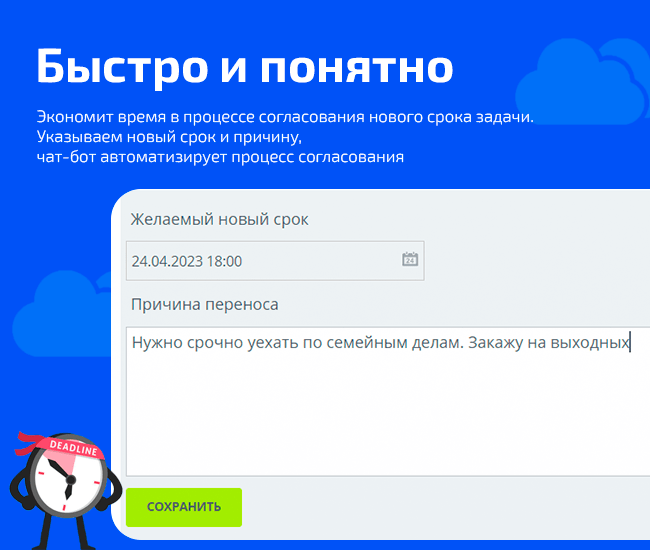 Экономит время в процессе согласования нового срока задачи. Указываем новый срок и причину, чат-бот автоматизирует процесс согласования.