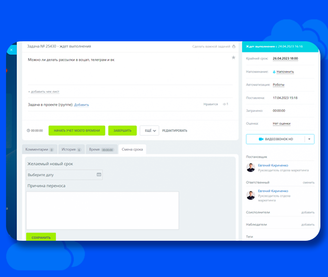 Для того, чтобы информация о причинах смены срока не потерялась в чатах, мы дублируем её в виде комментариев к задаче.Особенно заметно удобство для руководителя при работе с мобильного телефона