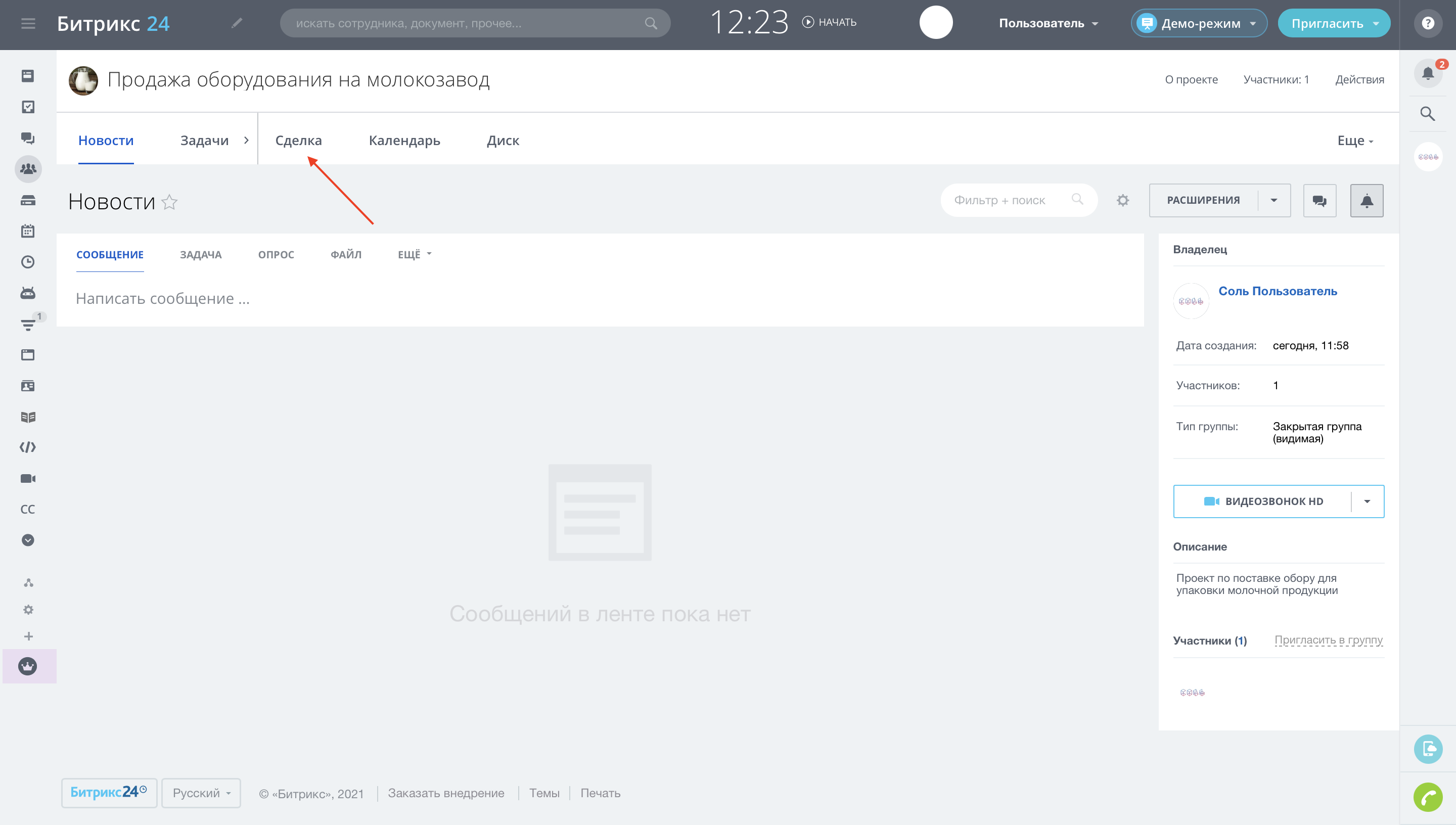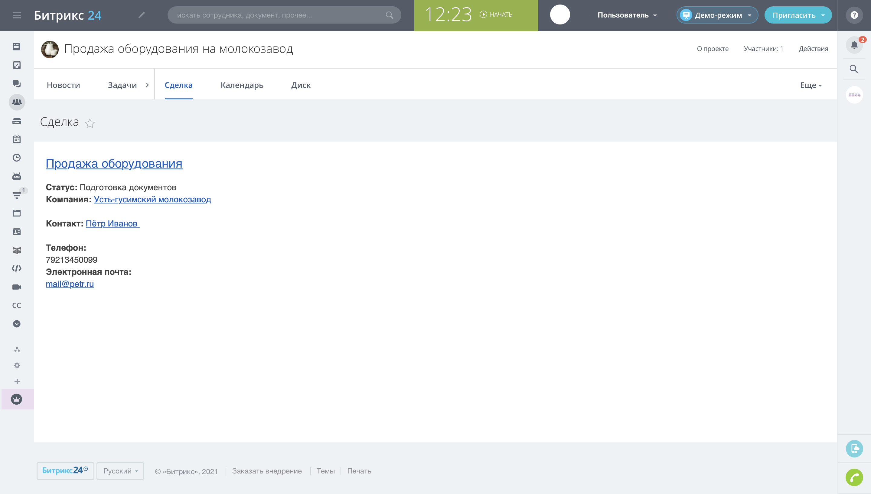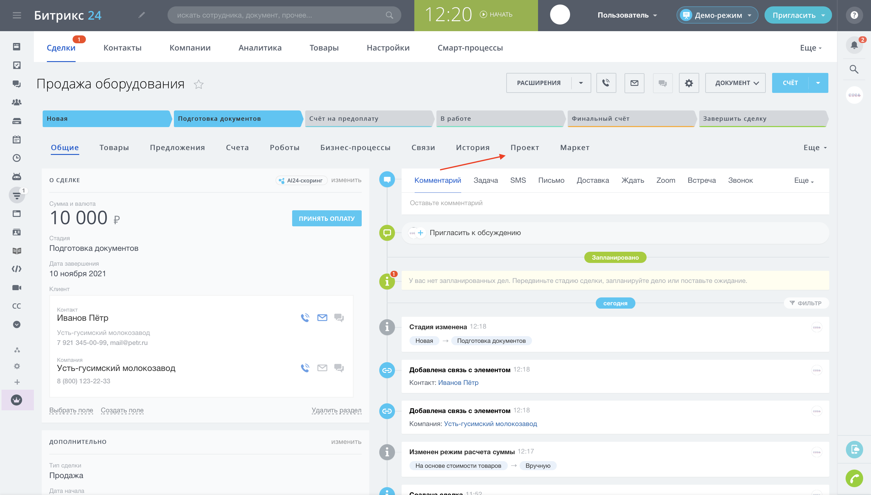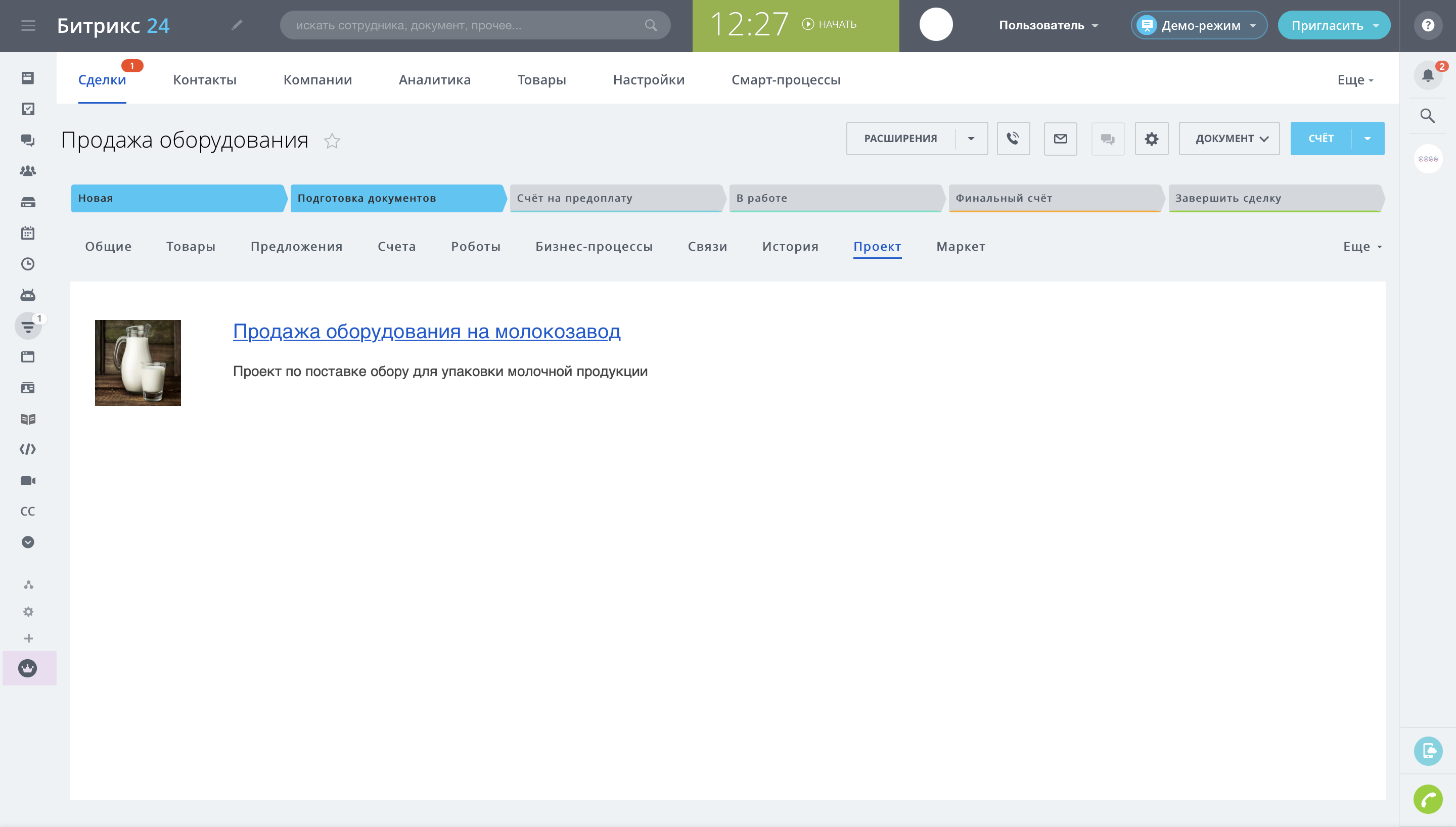 В то же время, в карточке проекта, так же, в горизонтальном меню, создаётся пункт "Сделка". В нём предлагается привязать сделку к проекту, если она ещё не привязана. А если сделка привязана - выводится информация о названии сделки (со ссылкой на неё), стадии, компании и контактные данные основного контактного лица по сделке.