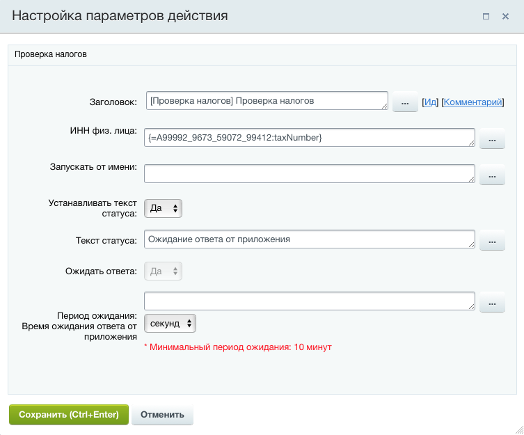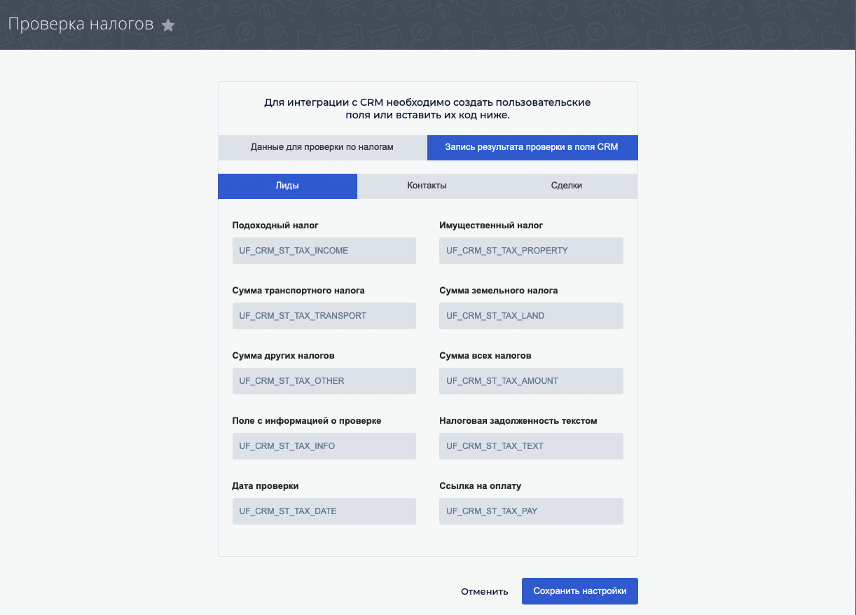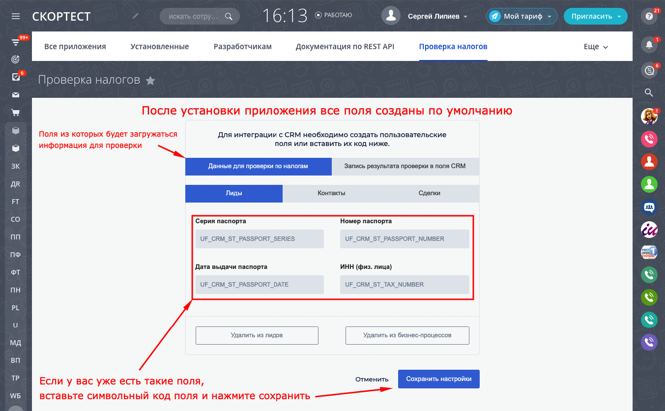 Приложение по умолчанию встраивается в CRM и бизнес-процессы. Создает все необходимые поля для проверки и записи результата. Изменить поля вы можете в настройках приложения. Для этого нужно вставить символьный код поля и нажать сохранить.