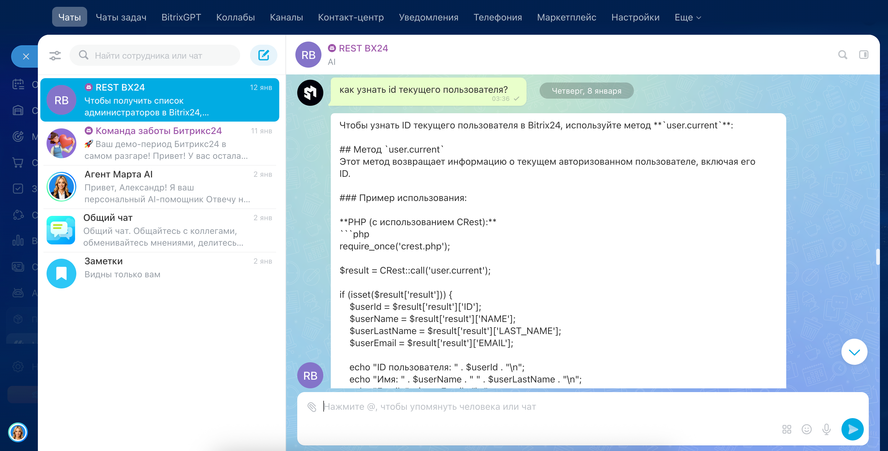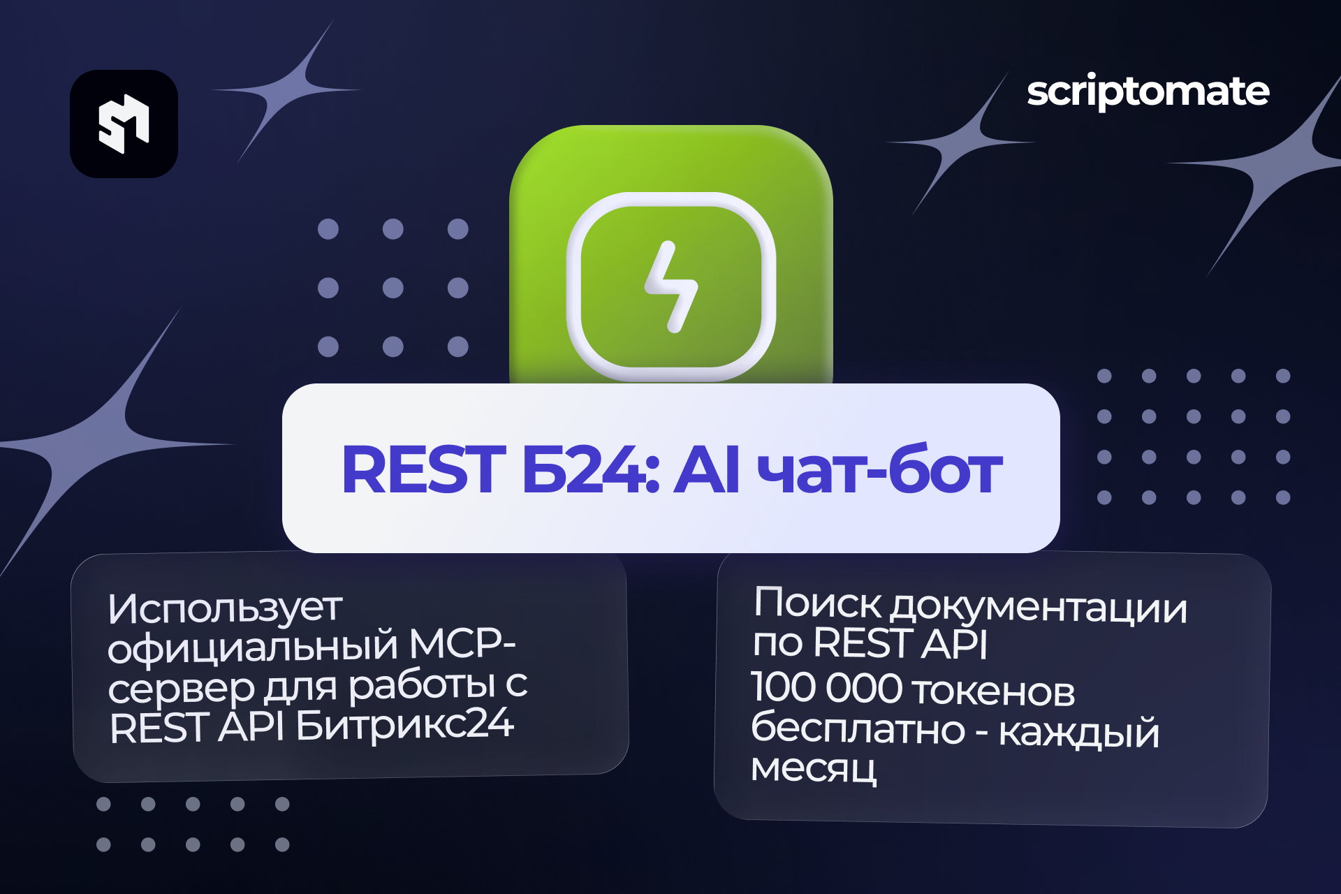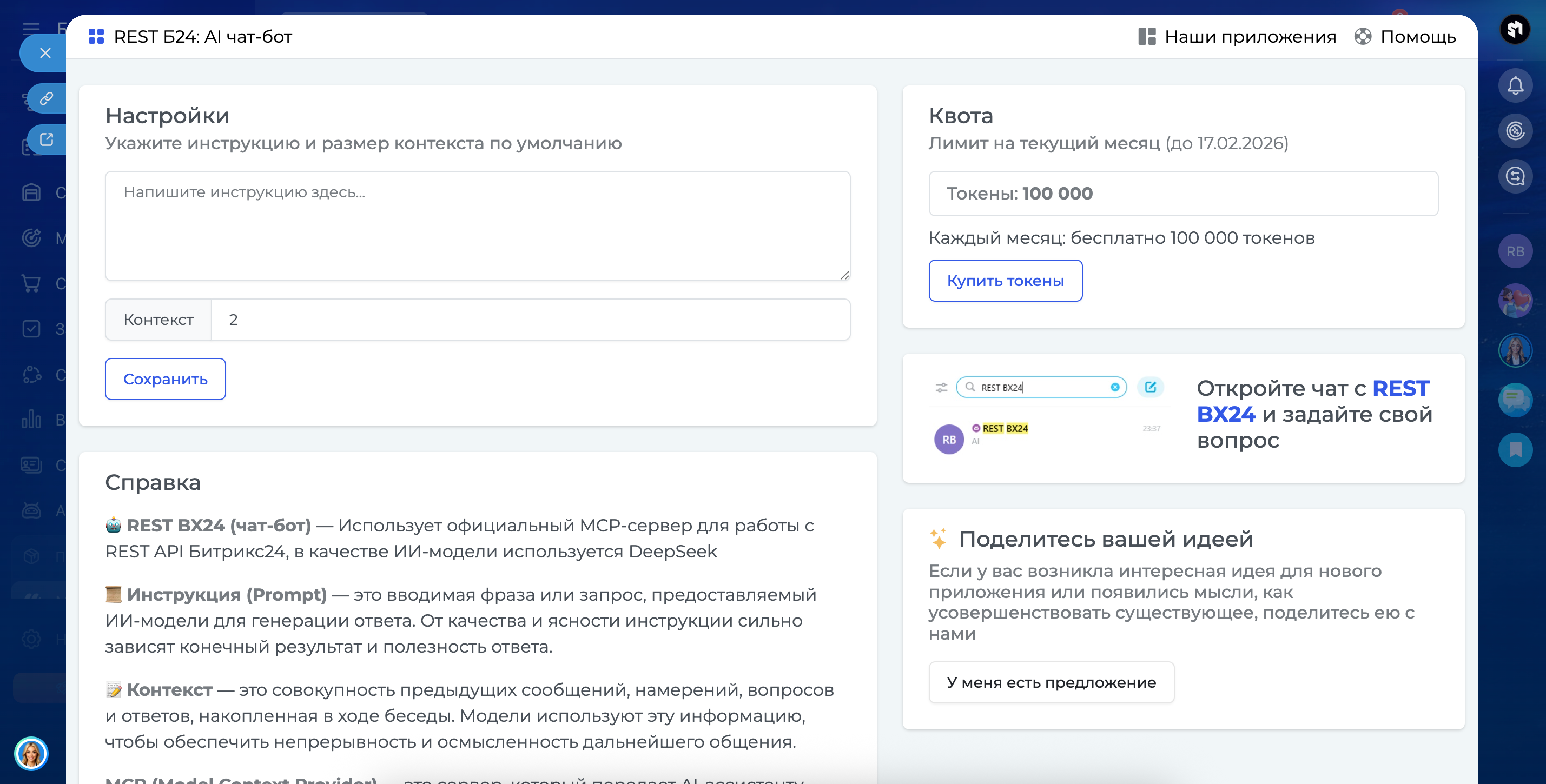 Чат-бот представляет собой удобный инструмент для разработчиков, позволяющий быстро получать необходимую документацию по работе с REST API Битрикс24 прямо внутри корпоративного чата. Приложение интегрировано с официальным сервером MCP Битрикс24 и позволяет запрашивать конкретные методы, описания классов и общие рекомендации по интеграции.