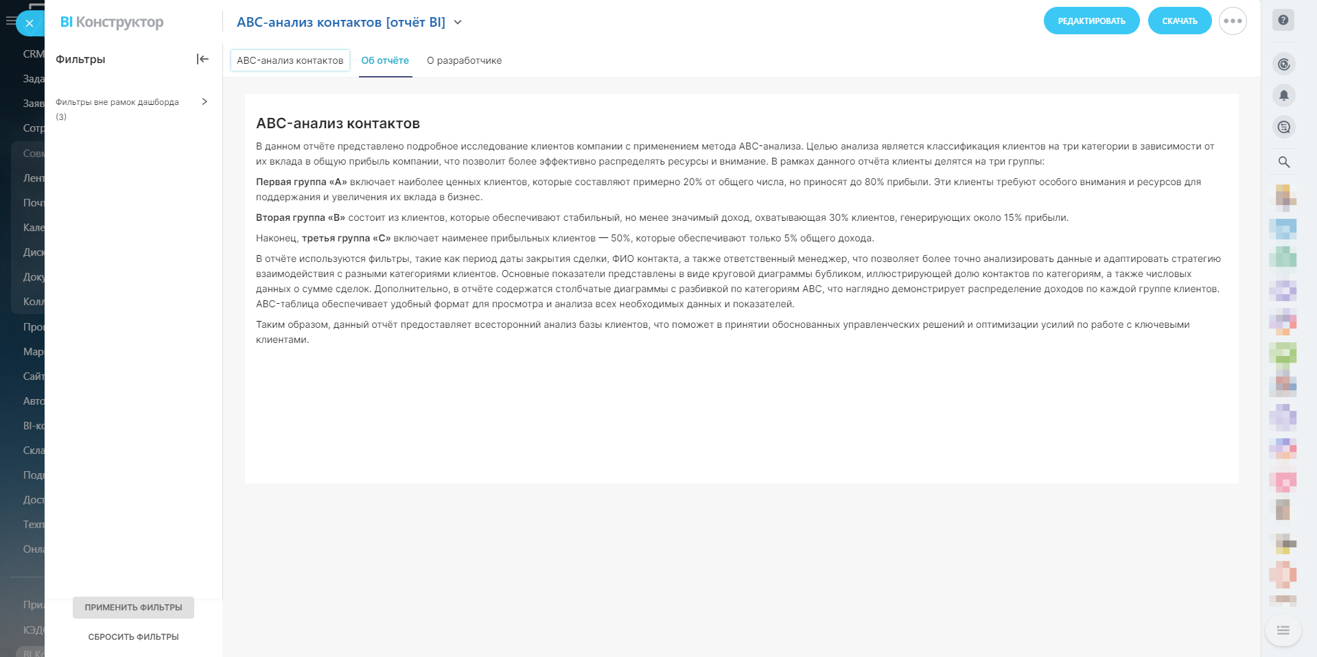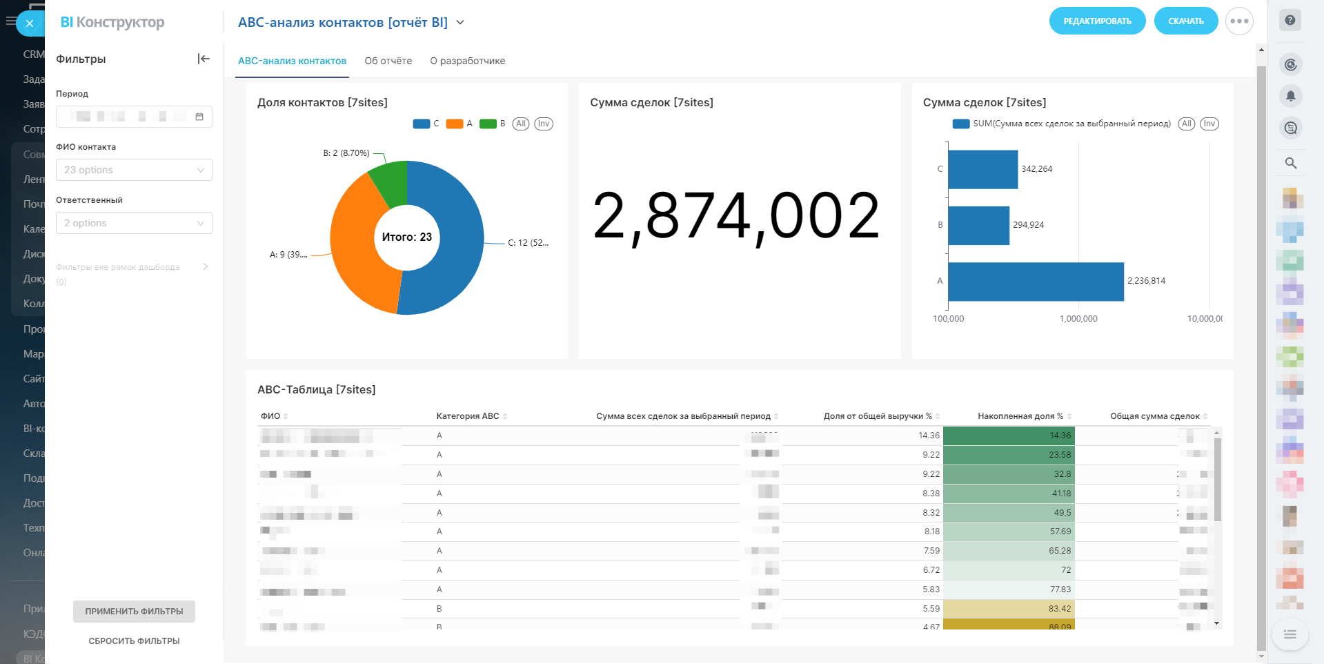 В отчёте используются фильтры, такие как период даты закрытия сделки, ФИО контакта, а также ответственный менеджер, что позволяет более точно анализировать данные и адаптировать стратегию взаимодействия с разными категориями клиентов. Основные показатели представлены в виде круговой диаграммы бубликом, иллюстрирующей долю контактов по категориям, а также числовых данных о сумме сделок. Дополнительно, в отчёте содержатся столбчатые диаграммы с разбивкой по категориям ABC, что наглядно демонстрирует распределение доходов по каждой группе клиентов. ABC-таблица обеспечивает удобный формат для просмотра и анализа всех необходимых данных и показателей.