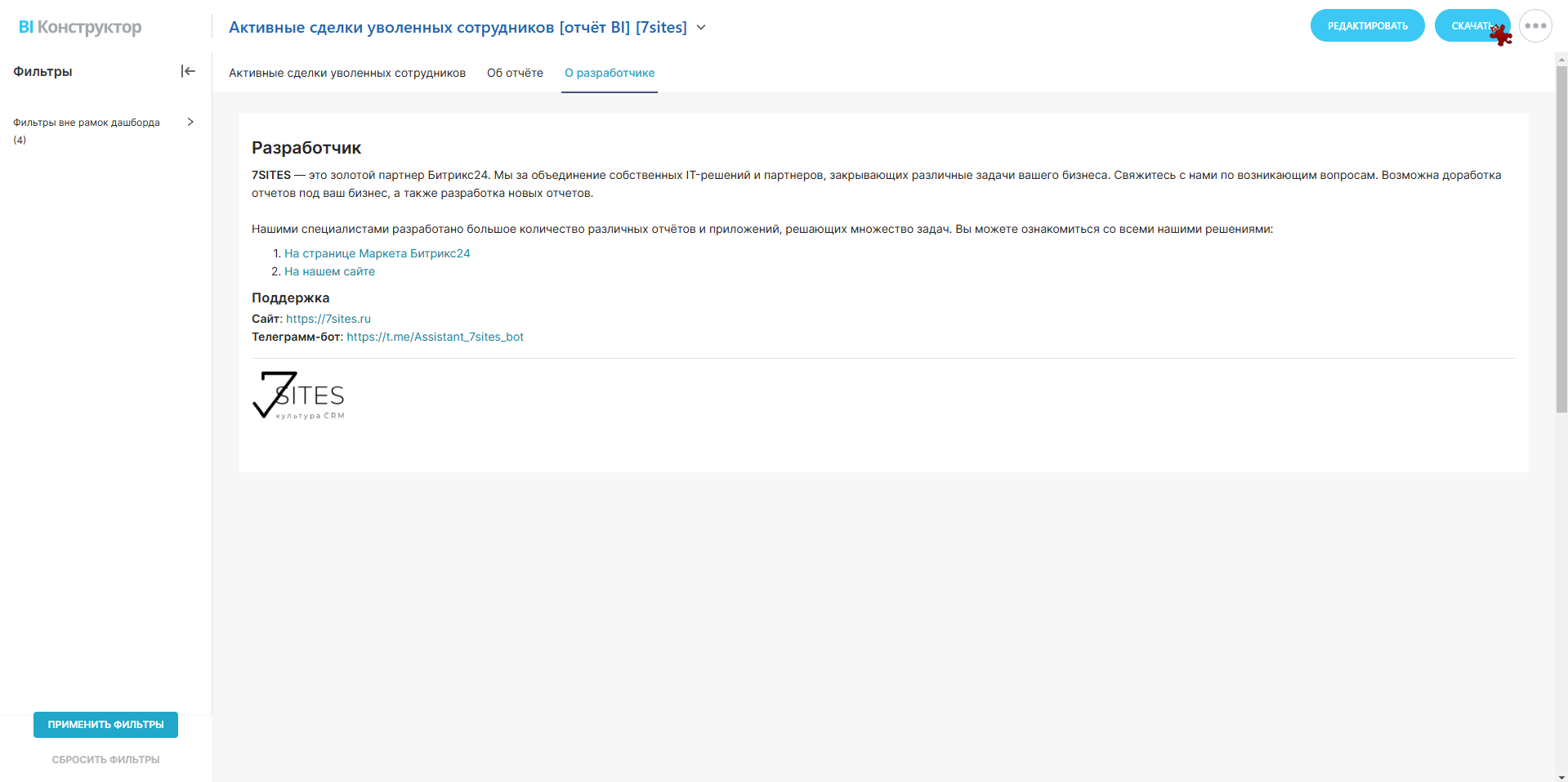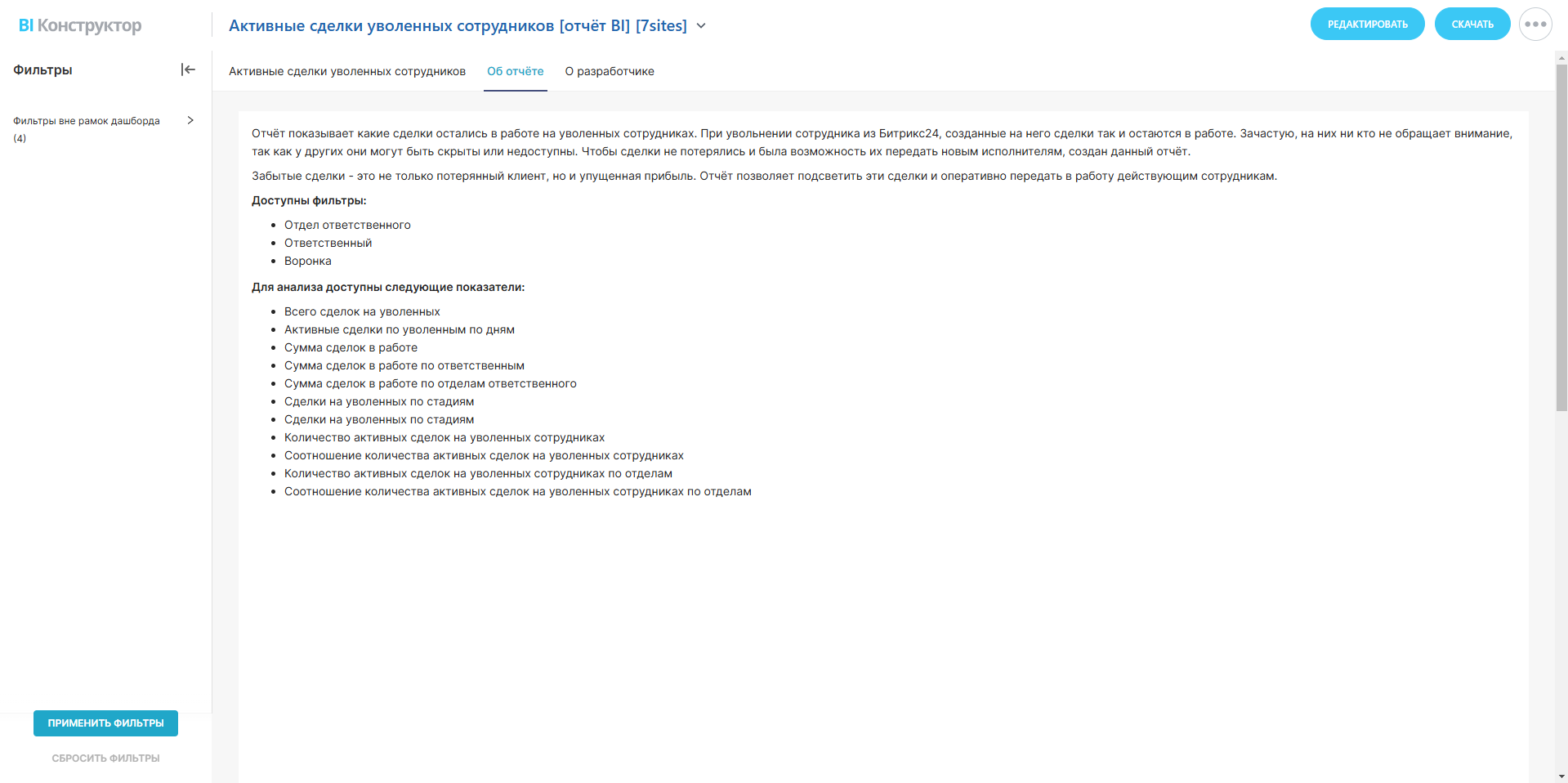 Отчёт показывает, какие сделки остались в работе на уволенных сотрудниках. При увольнении сотрудника из Битрикс24 созданные на него сделки так и остаются в работе. Зачастую на них никто не обращает внимание, так как у других они могут быть скрыты или недоступны. Чтобы сделки не потерялись и была возможность их передать новым исполнителям, создан данный отчёт.