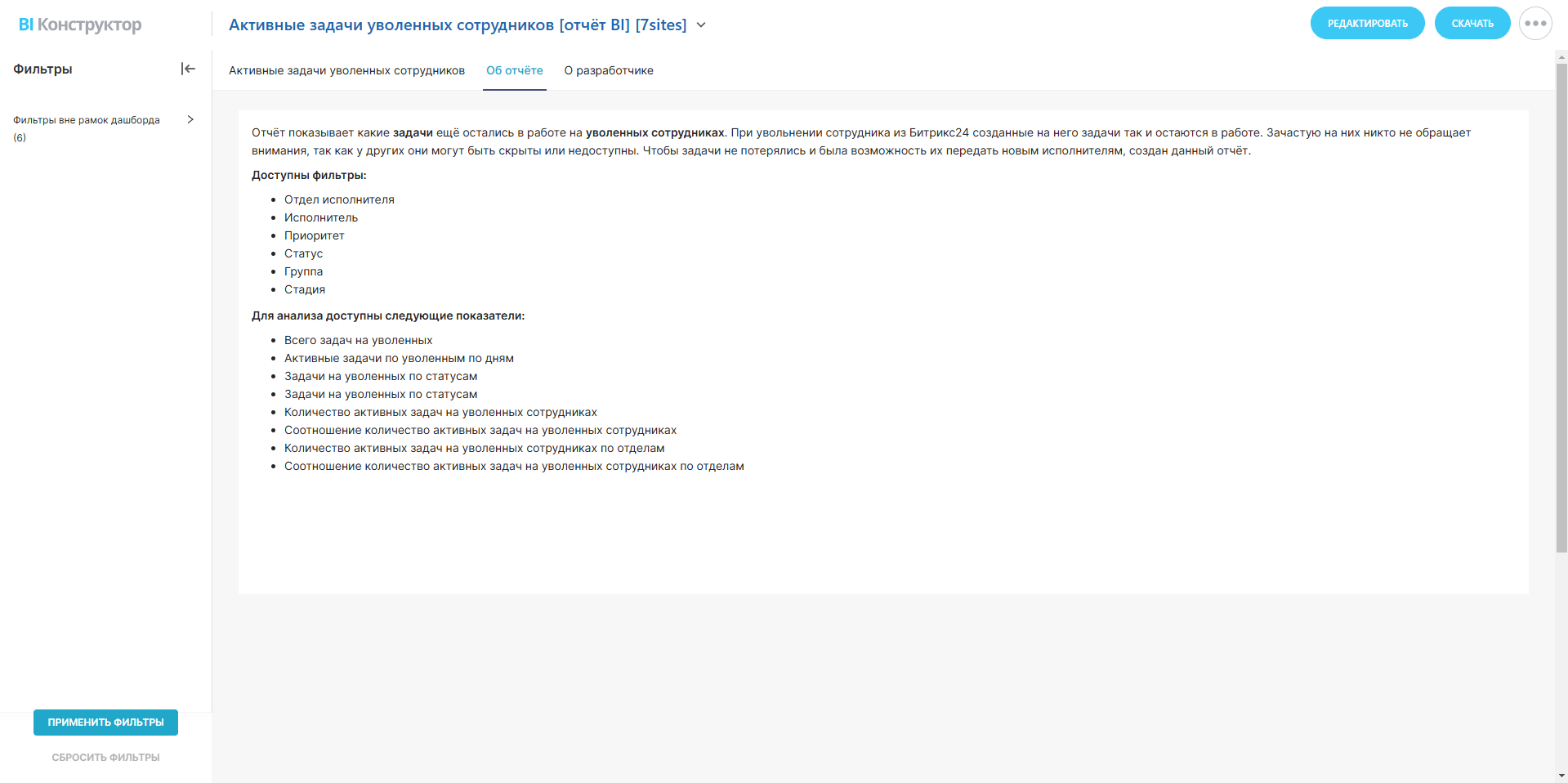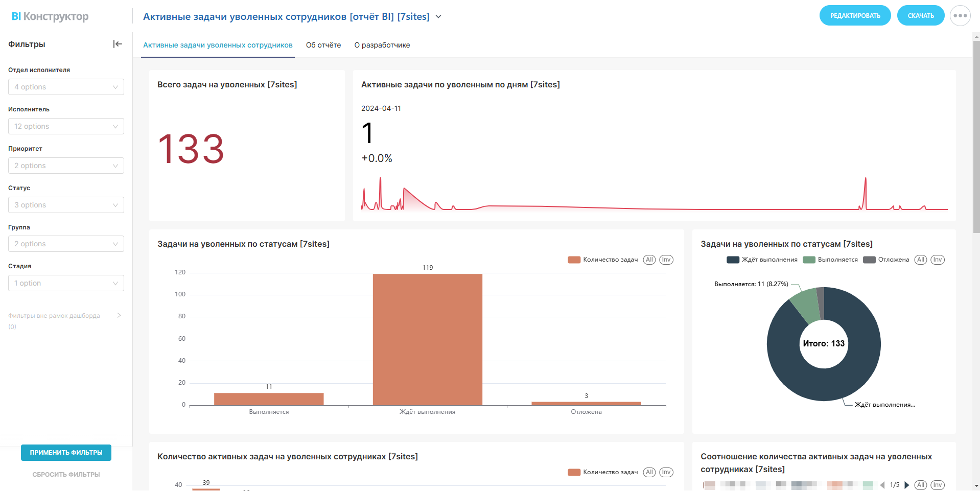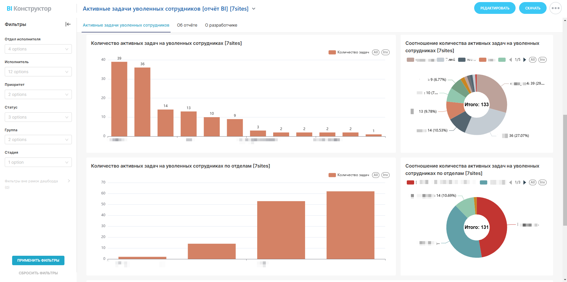 - Соотношение количество активных задач на уволенных сотрудниках по отделам