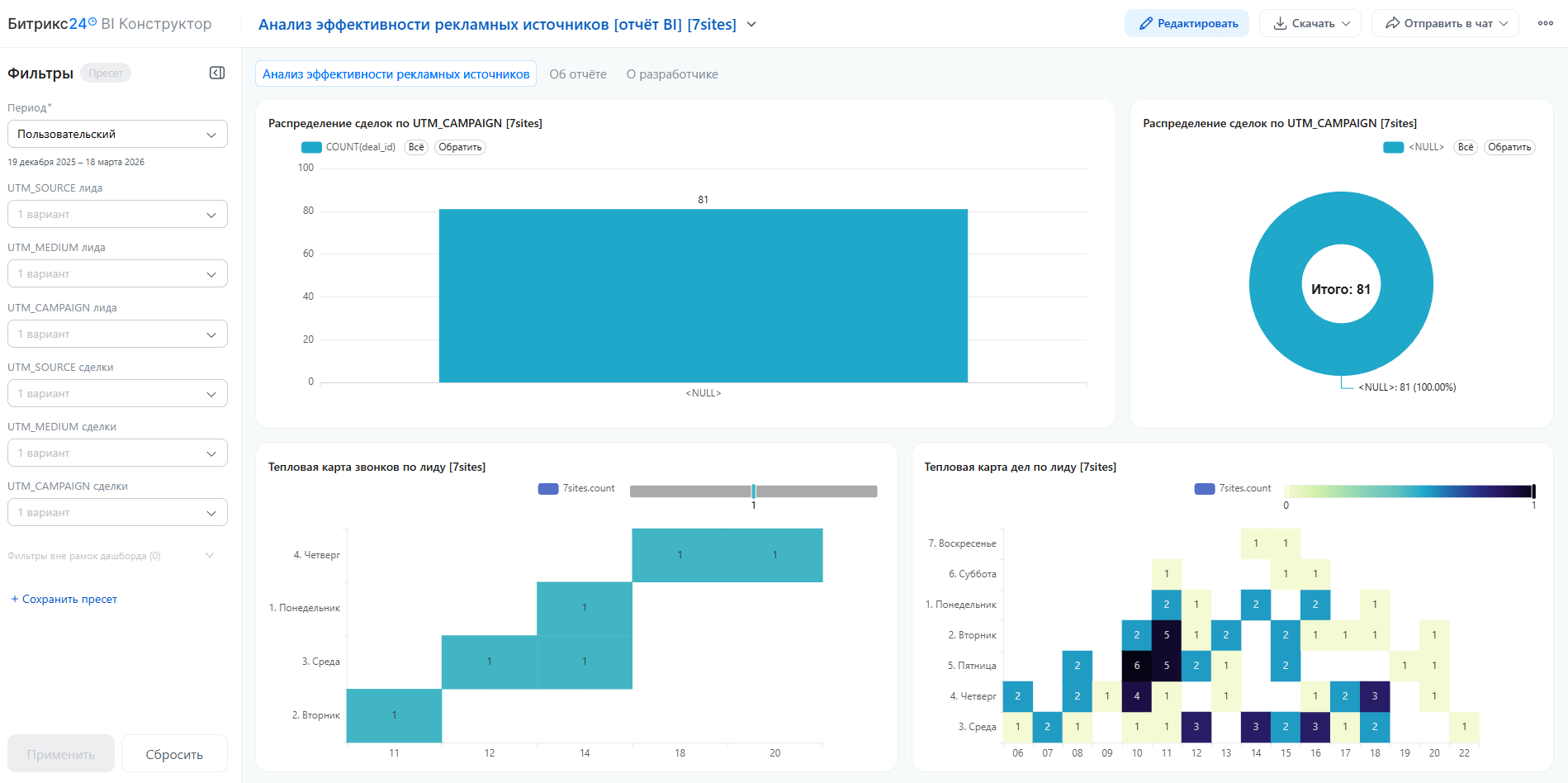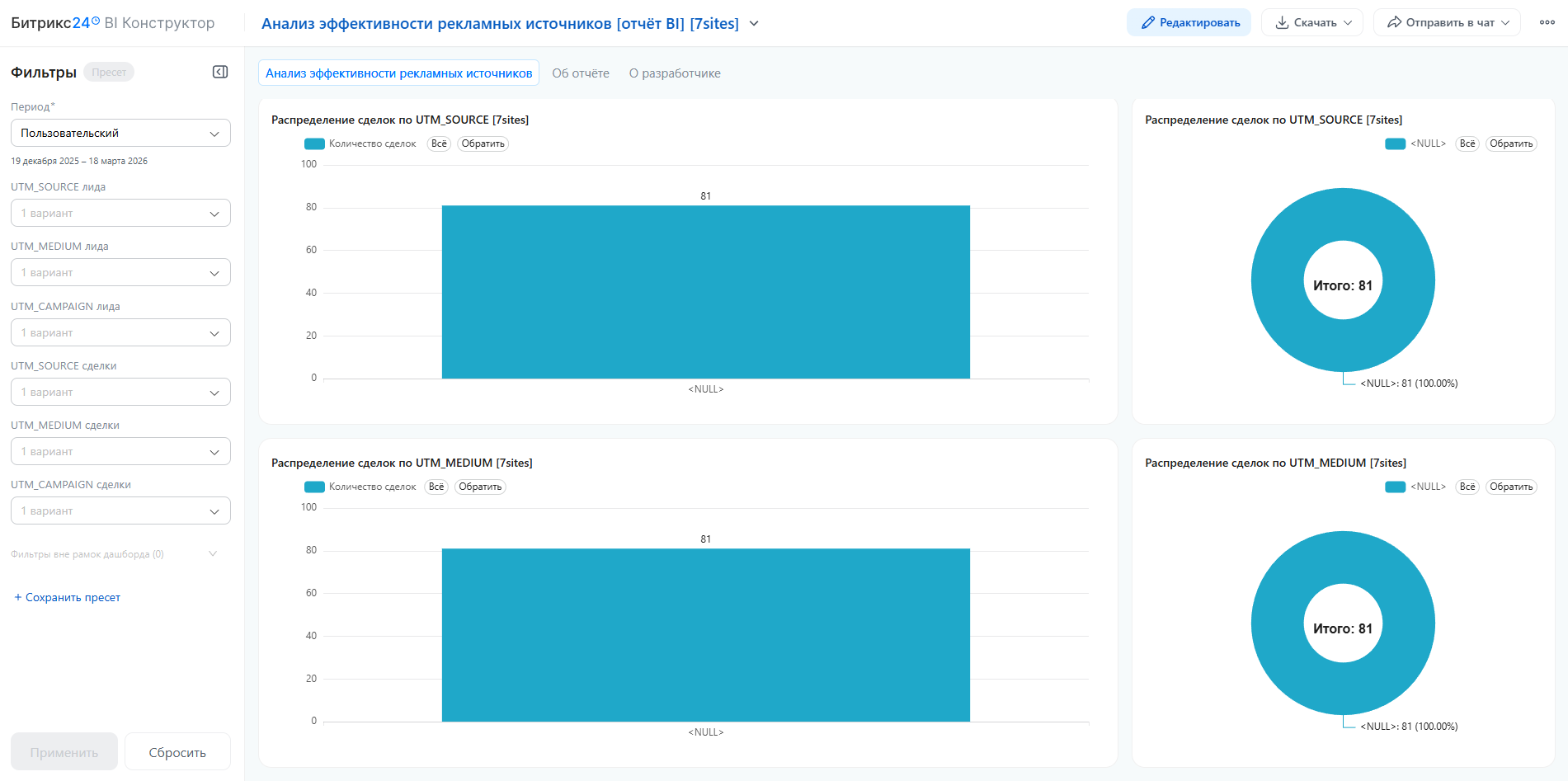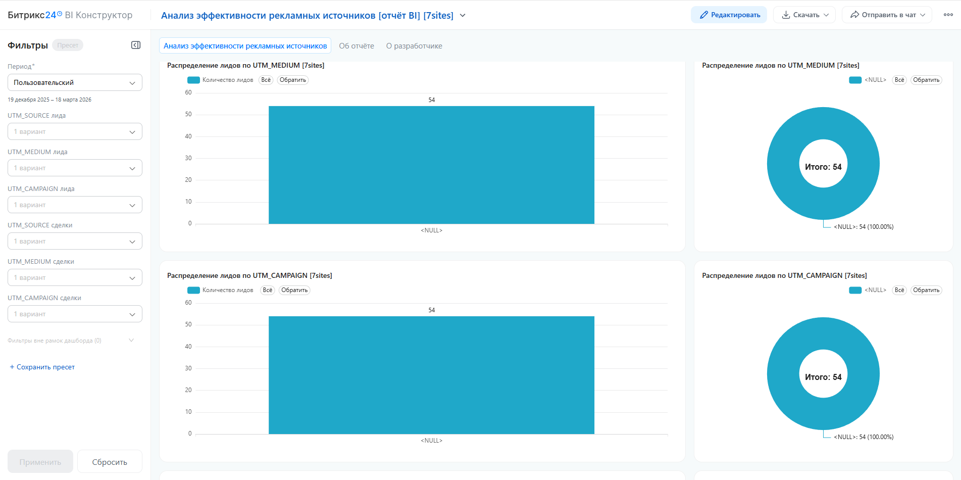 • Анализирует UTM-метки (UTM_SOURCE, UTM_MEDIUM, UTM_CAMPAIGN) для оценки эффективности каналов.