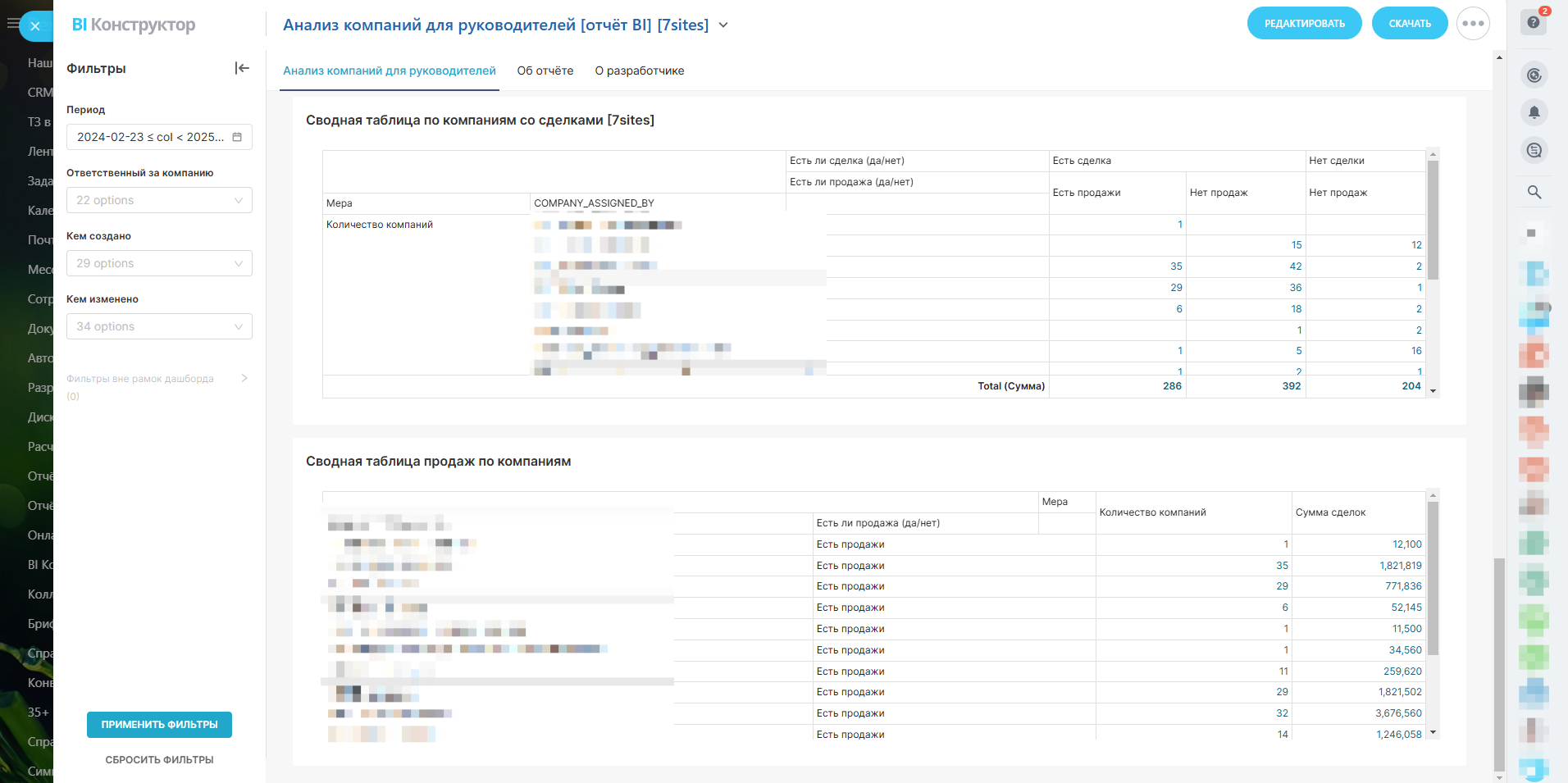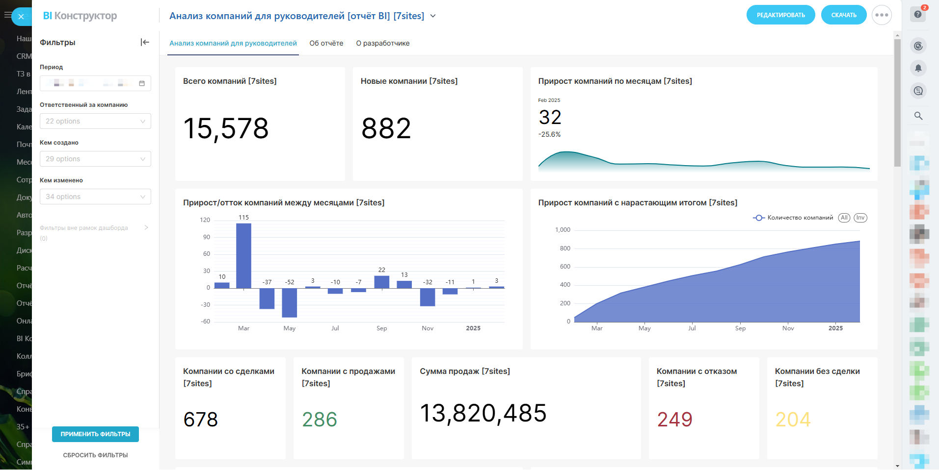 Отчёт предоставляет руководителям комплексный инструмент для анализа работы с компаниями в Битрикс24, фокусируясь на их динамике, эффективности взаимодействия и финансовых результатах.