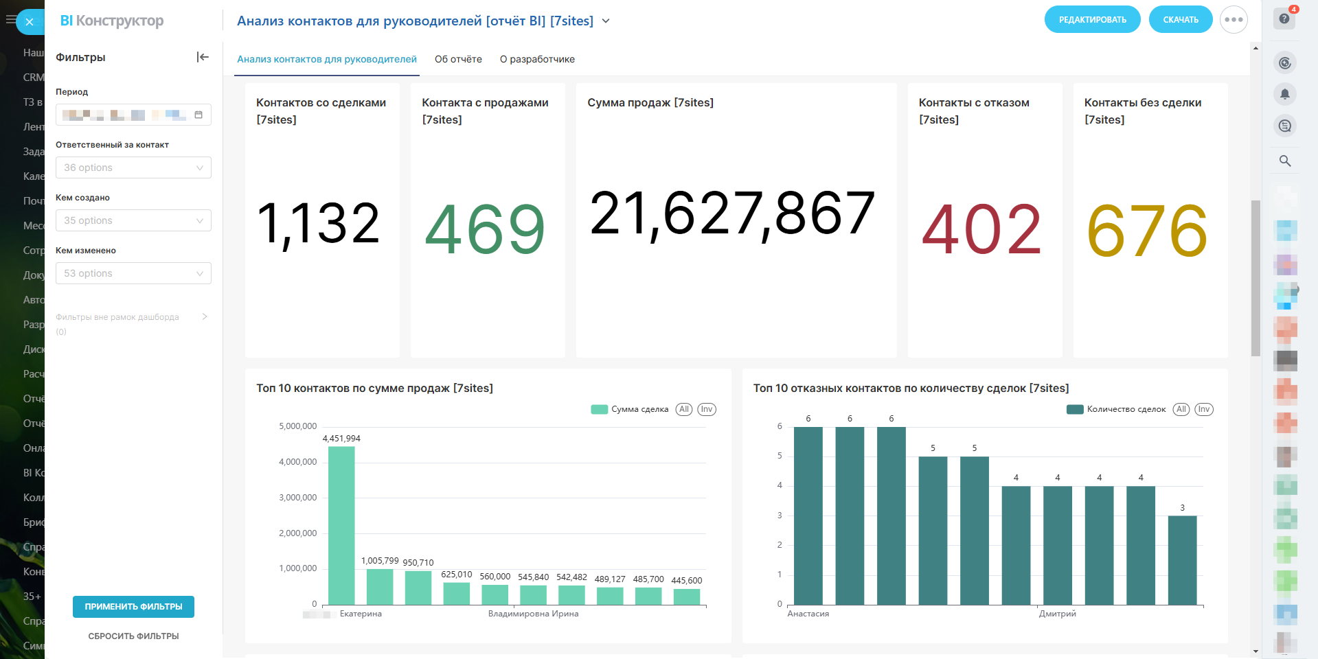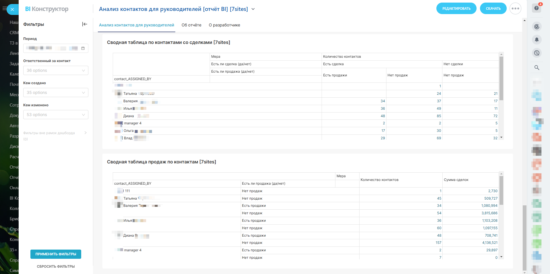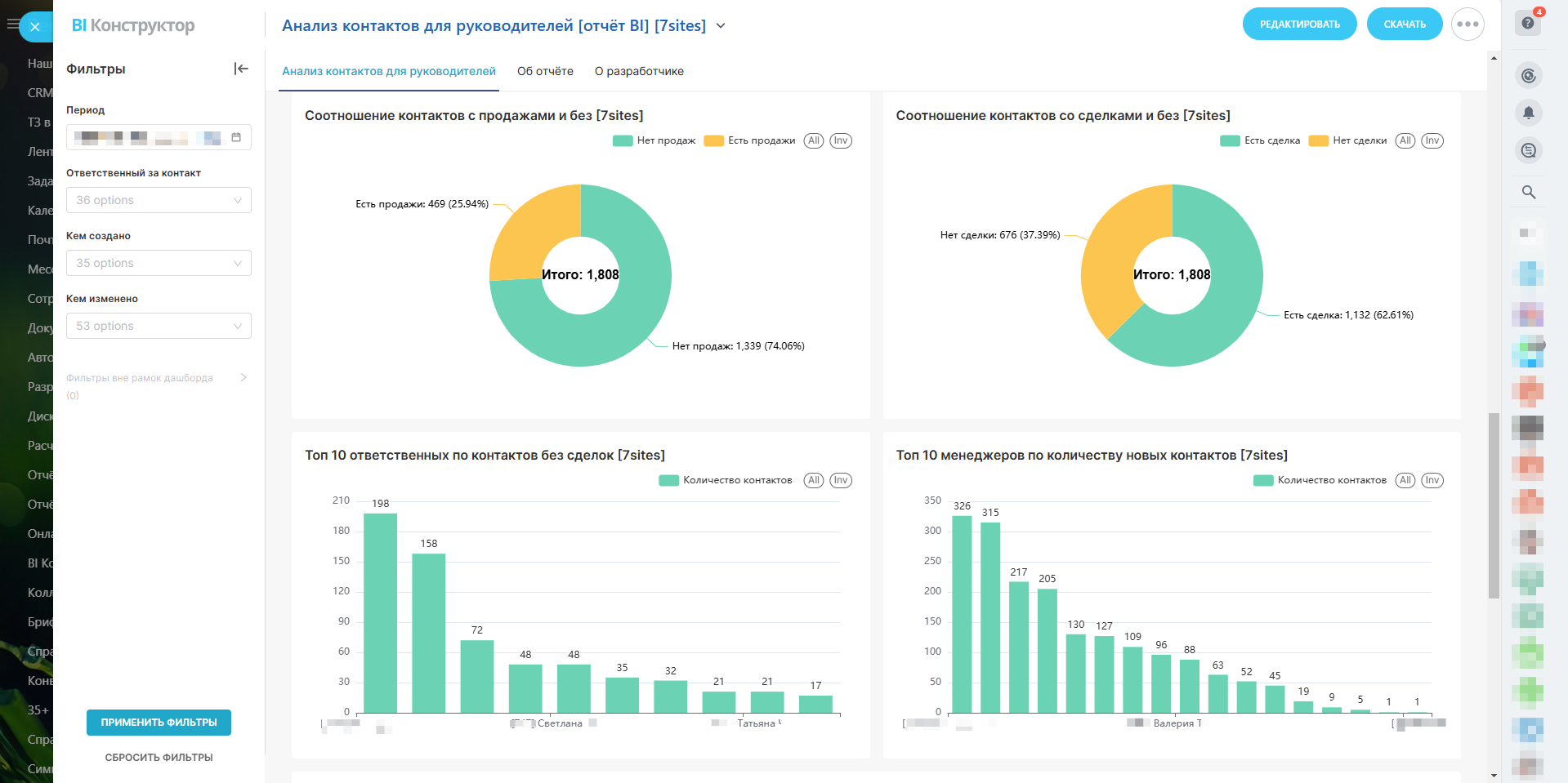 Топ-листы: Выделение самых прибыльных и проблемных контактов, а также менеджеров по результативности (новые контакты, контакты без сделок).