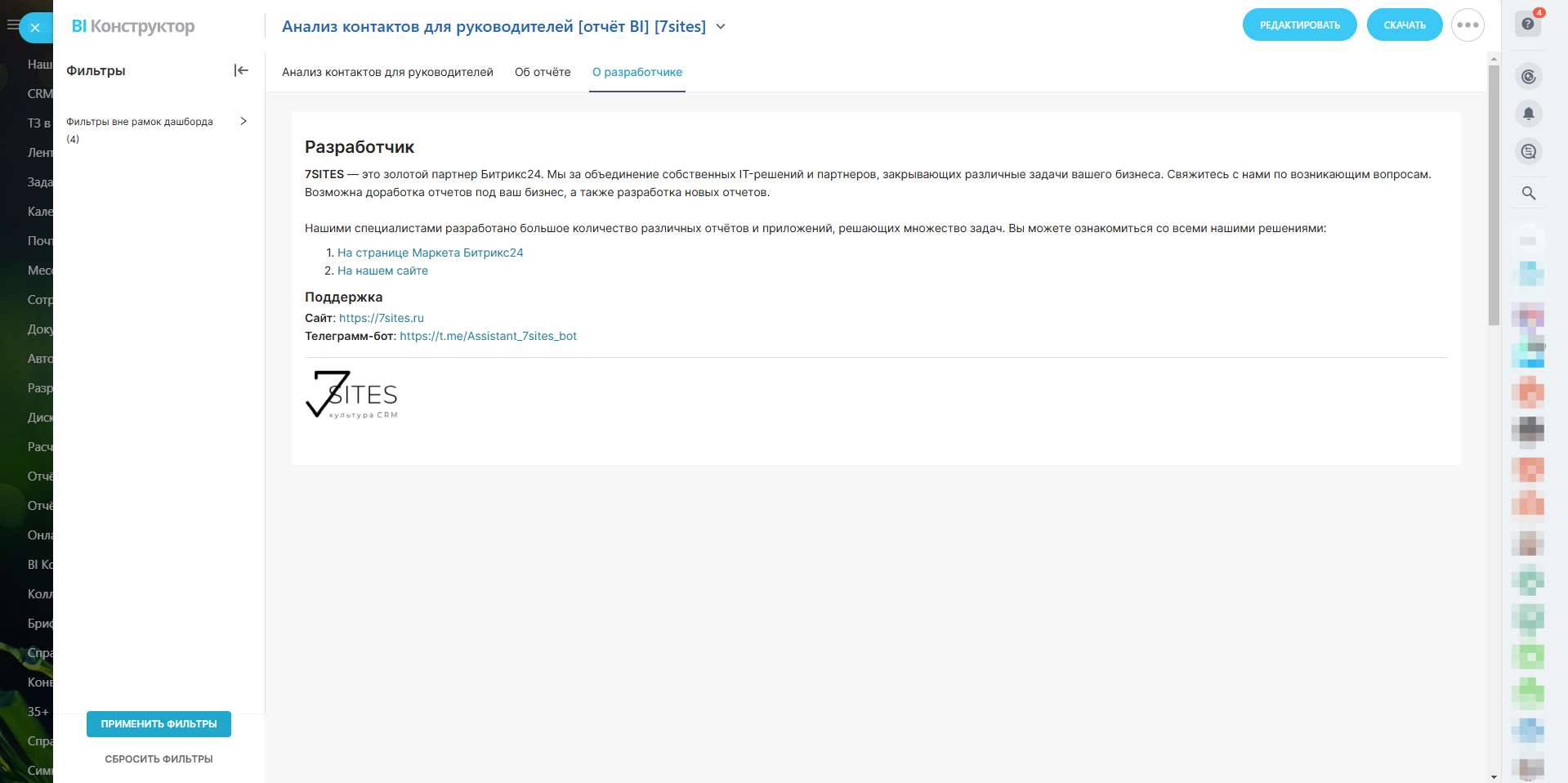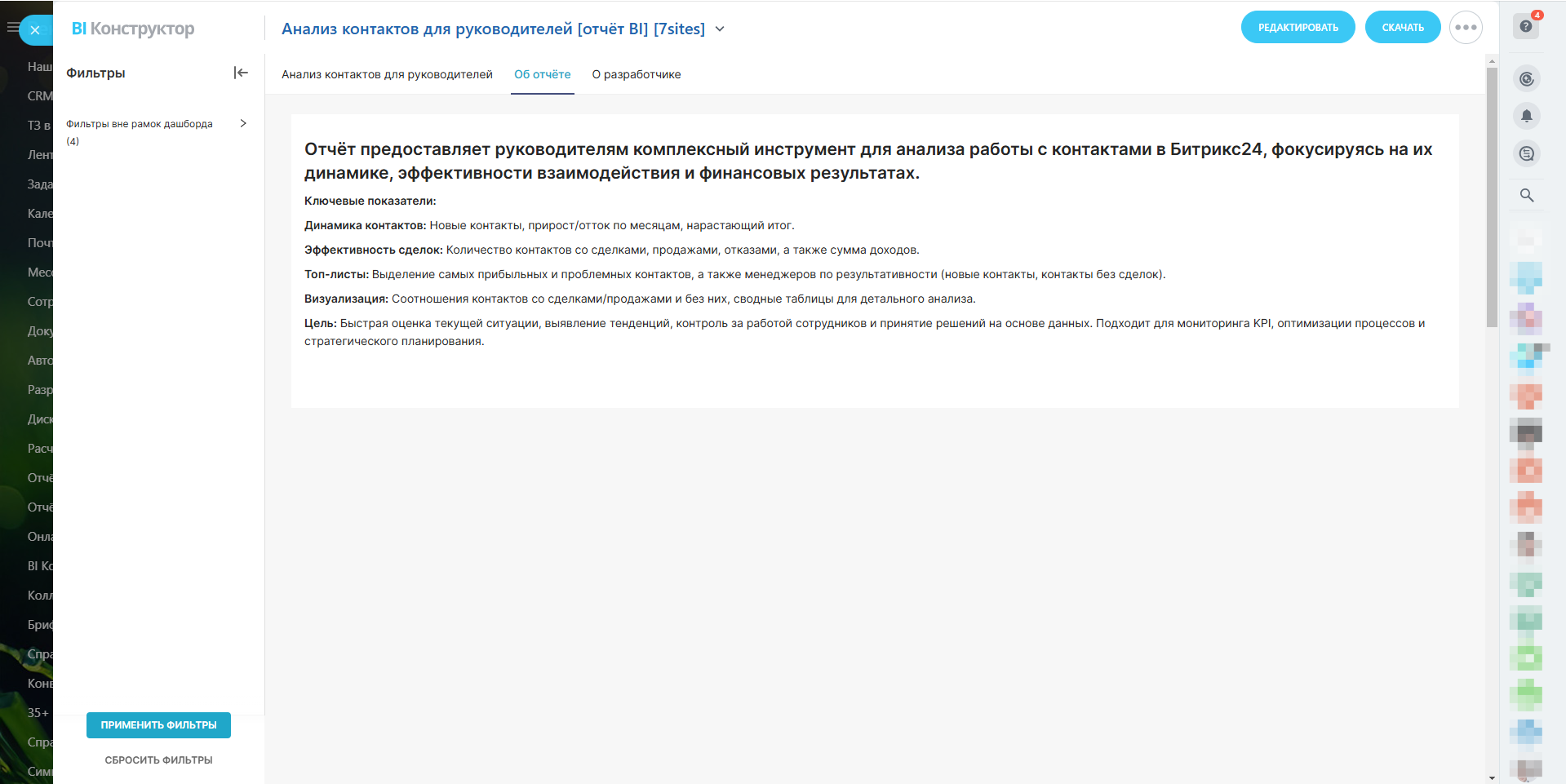 Эффективность сделок: Количество контактов со сделками, продажами, отказами, а также сумма доходов.
