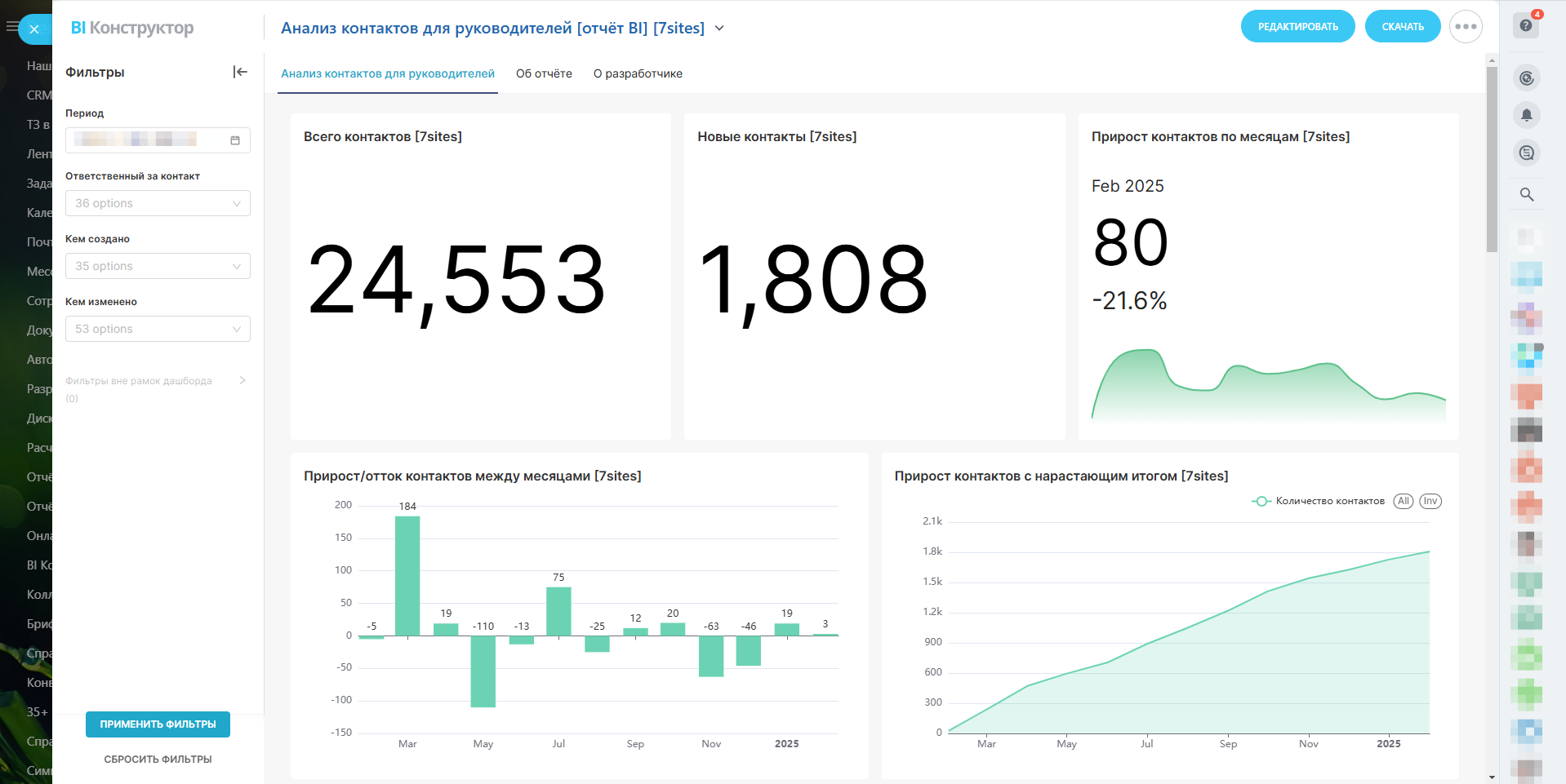 Динамика контактов: Новые контакты, прирост/отток по месяцам, нарастающий итог.