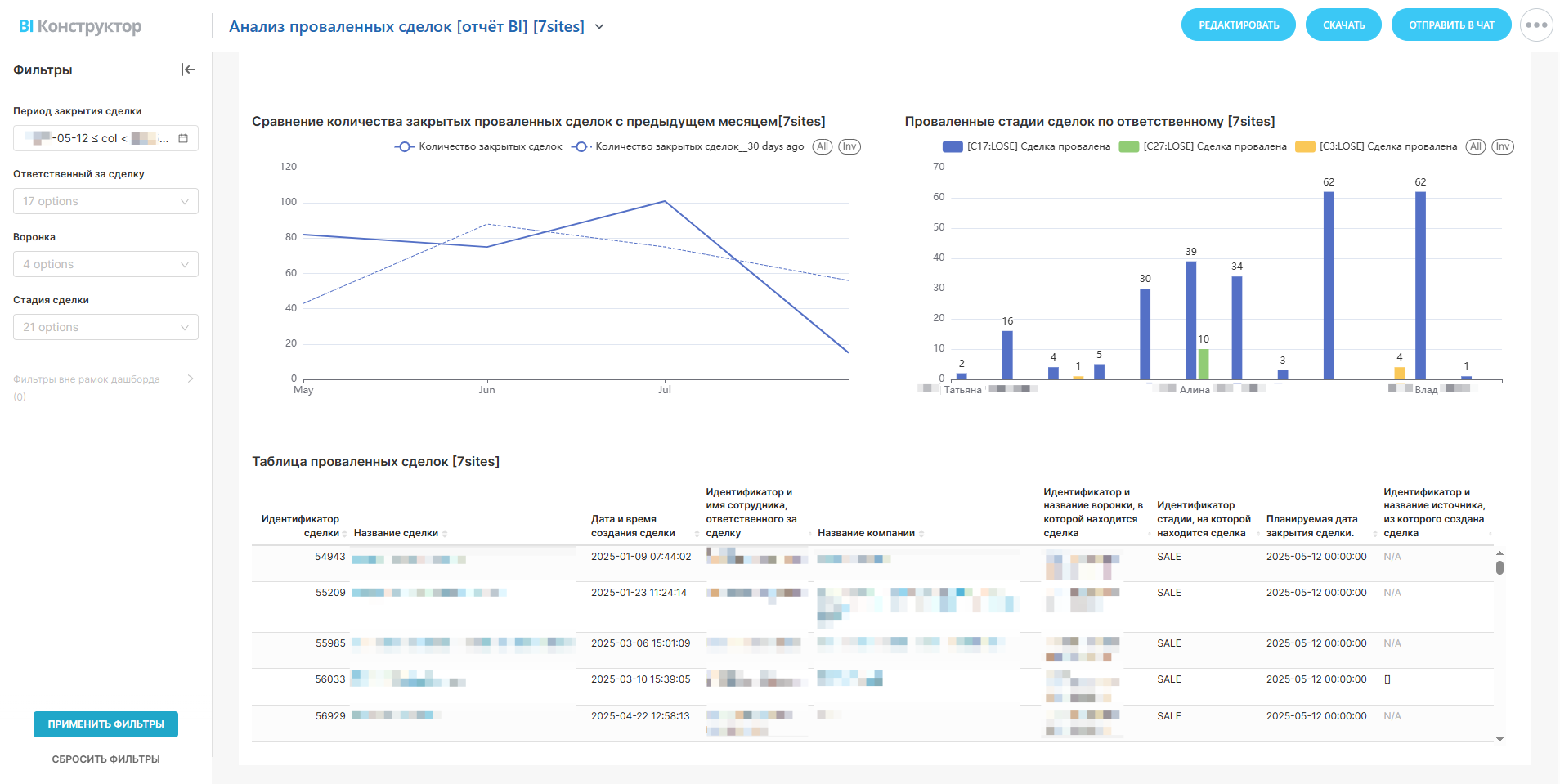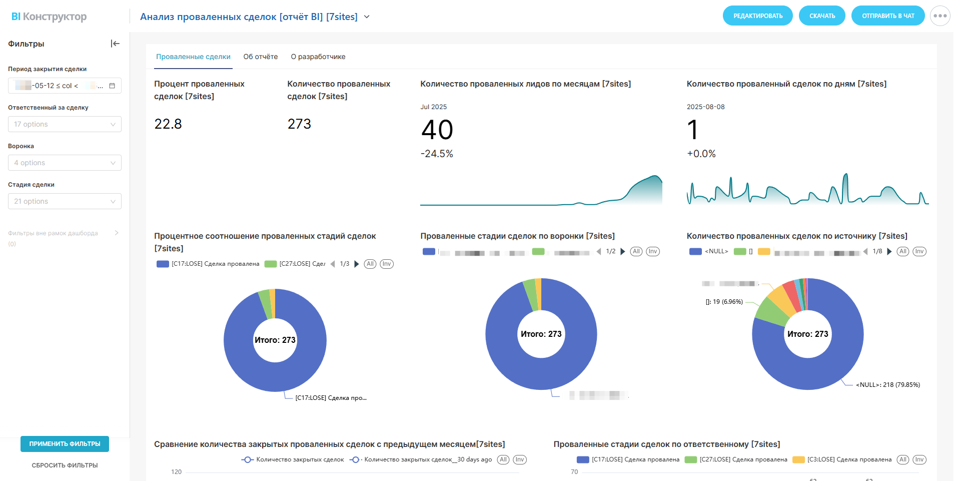 Отчет "Анализ проваленных стадий сделок" представляет собой важный инструмент для анализа проблем в управлении процессами продаж. Он помогает командам выявить слабые места в воронке продаж, улучшить стратегию продаж и увеличить процент успешных завершений сделок. Данный отчет позволяет не только увидеть текущее состояние дел, но и выработать рекомендации для устранения проблем.