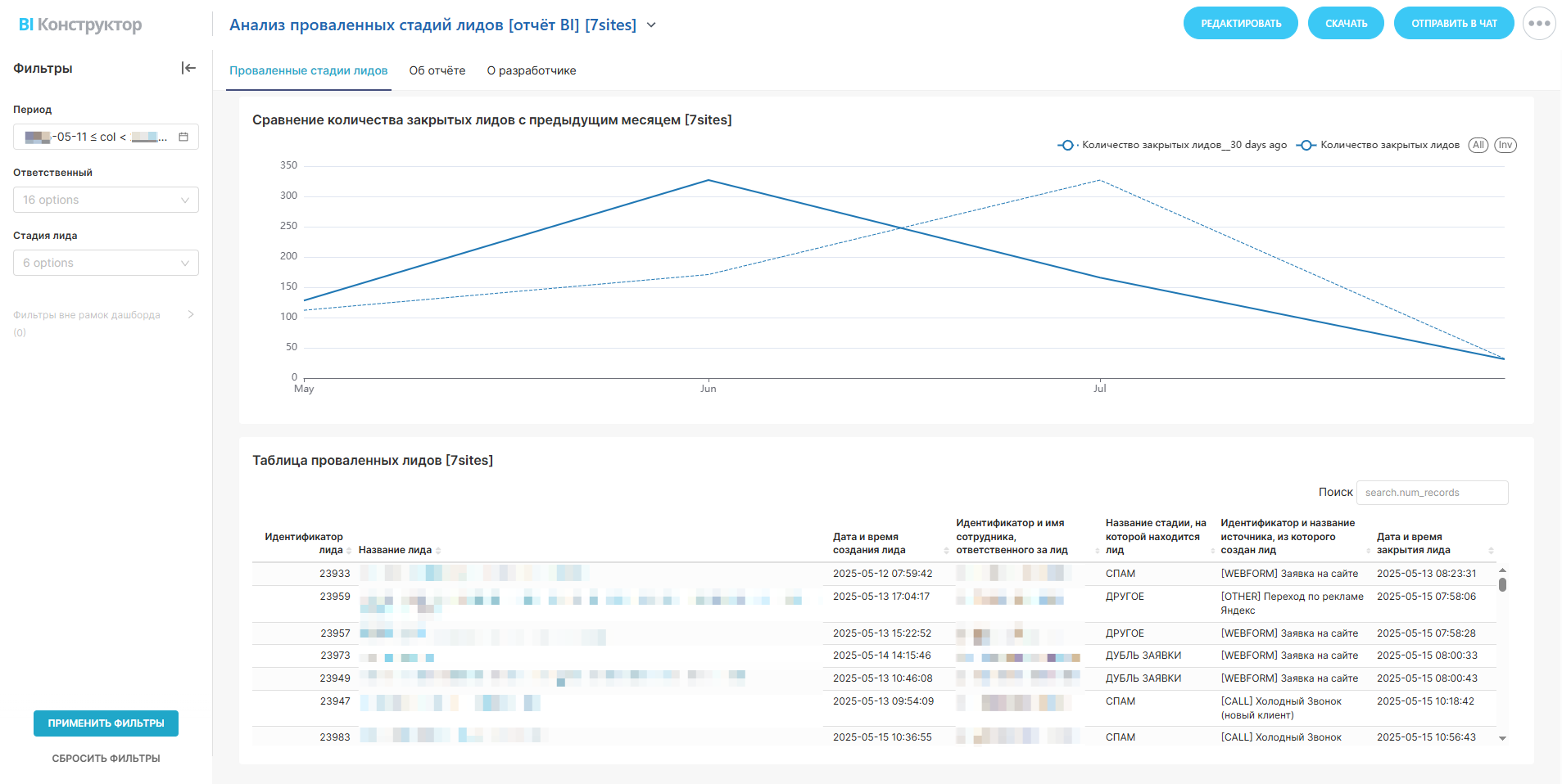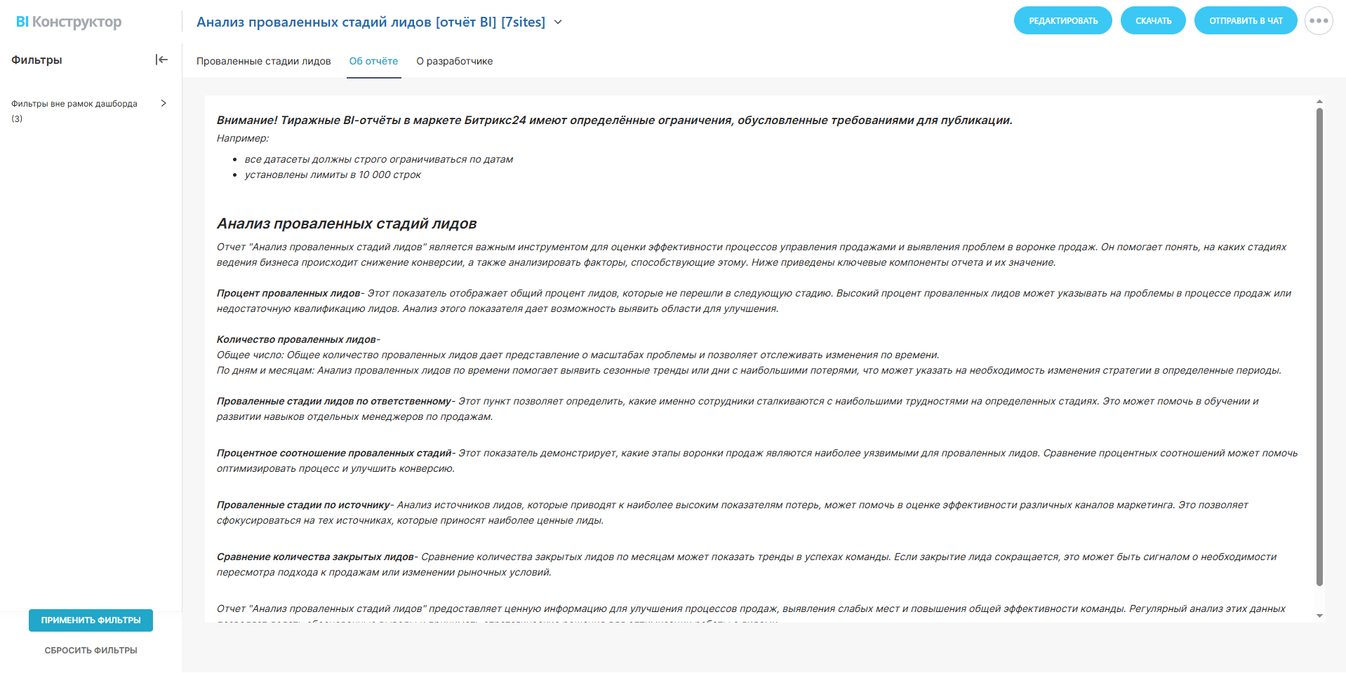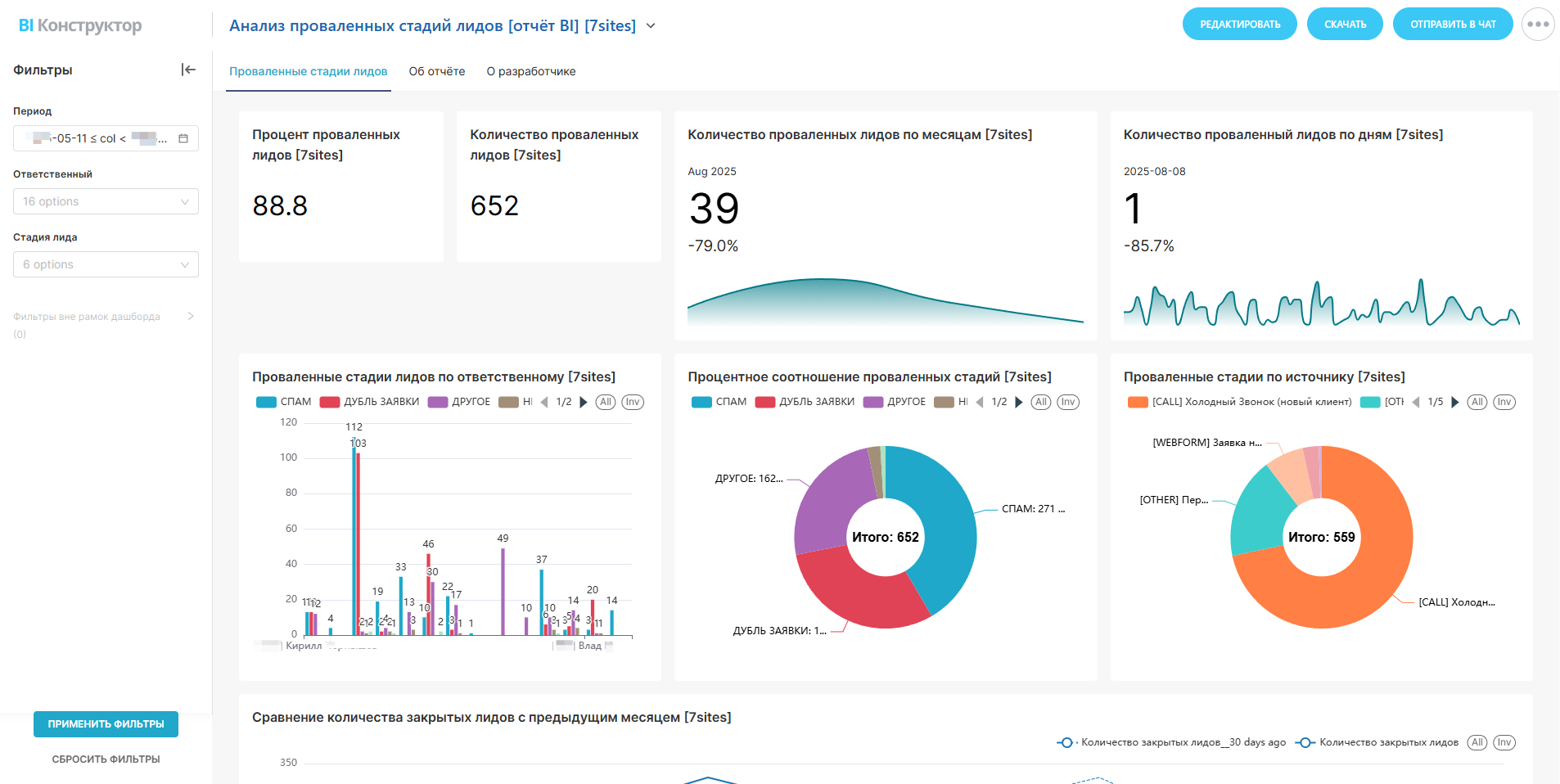 Отчет "Анализ проваленных стадий лидов" предоставляет ценную информацию для улучшения процессов продаж, выявления слабых мест и повышения общей эффективности команды. Регулярный анализ этих данных позволяет делать обоснованные выводы и принимать стратегические решения для оптимизации работы с лидами.