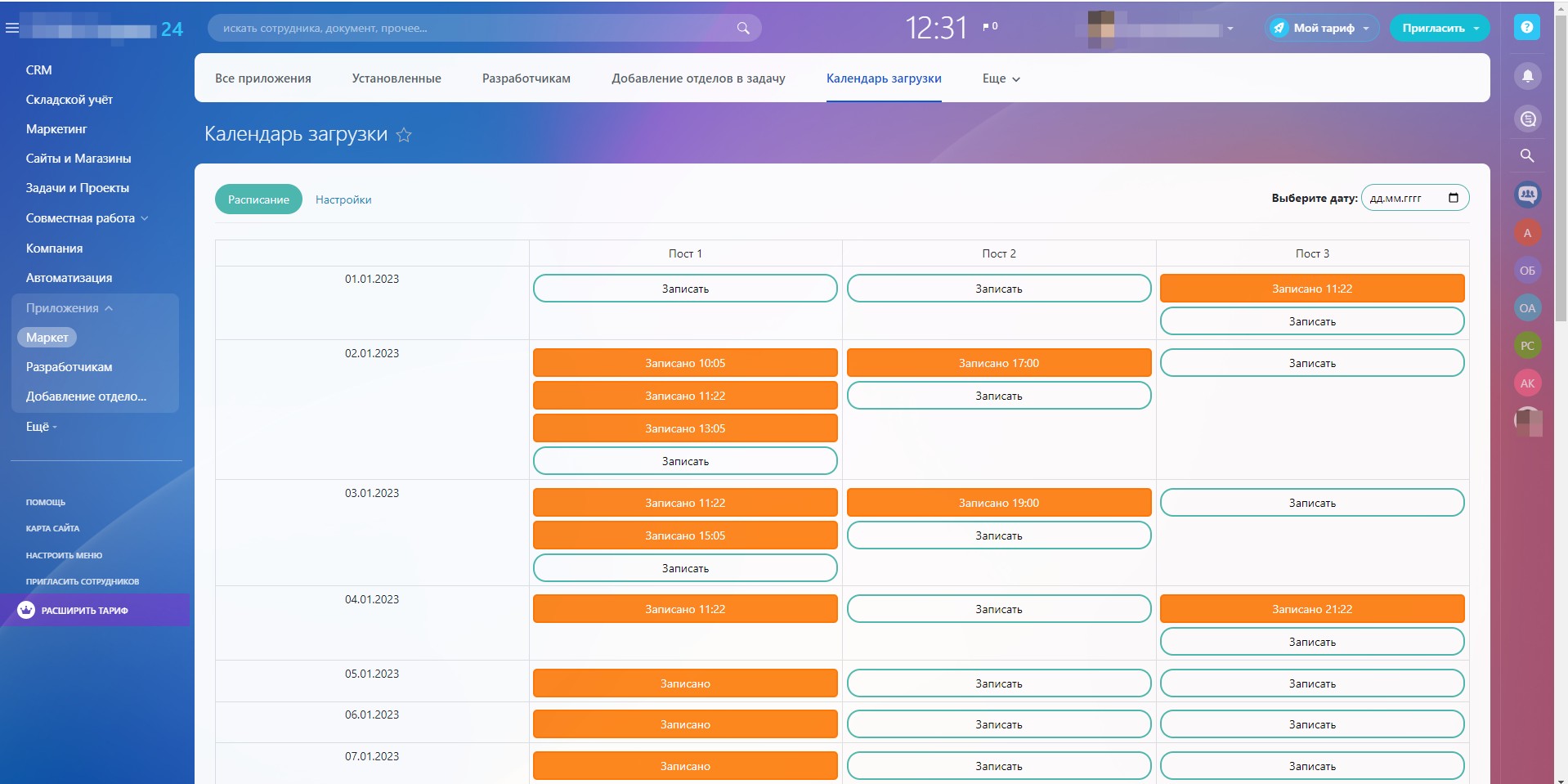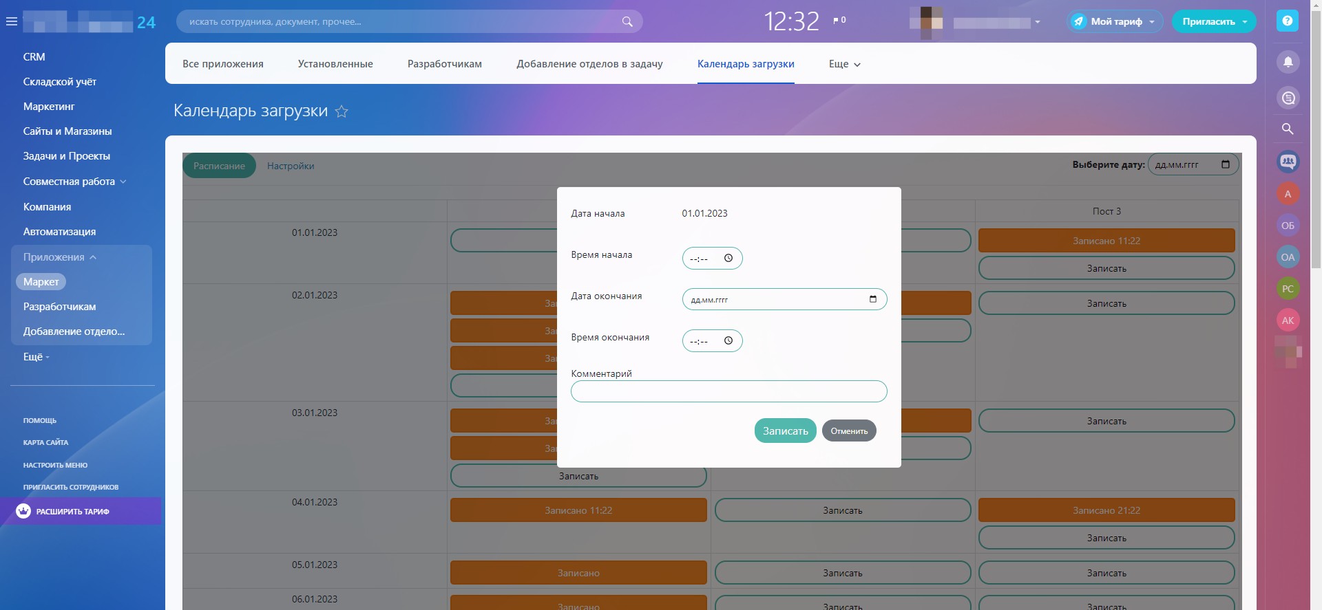 Приложение позволяет создавать неограниченное количество календарей загрузки. Позволяет организовать возможность записи любого типа данных, например: