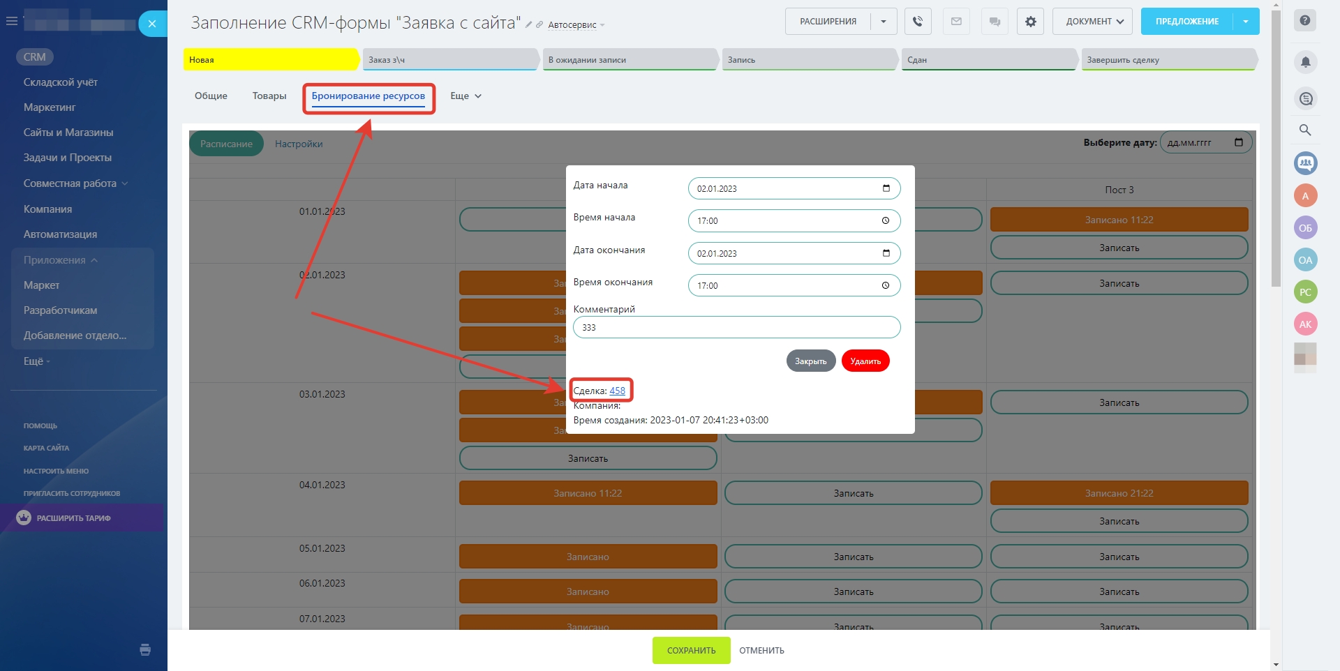 Приложение может встраиваться в карточку сделки или компании. В этом случае запись можно производить прямо внутри карточки Сделки или Компании, а в карточке самой записи будет отображаться привязанная сущность.