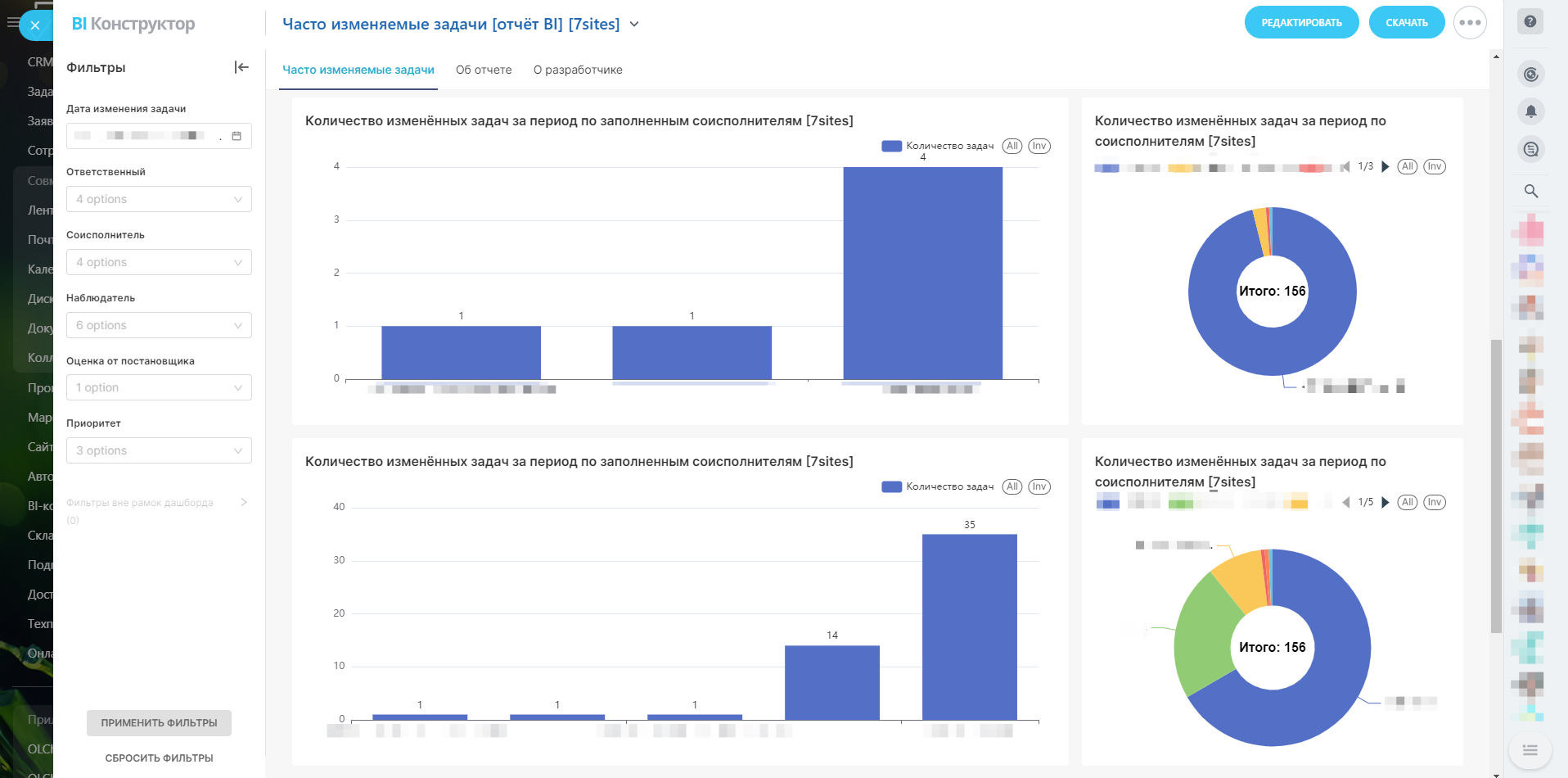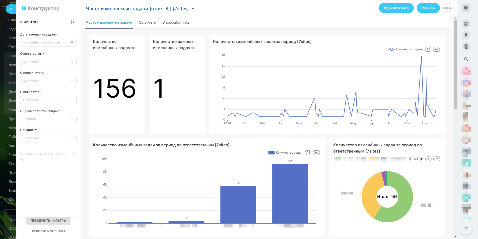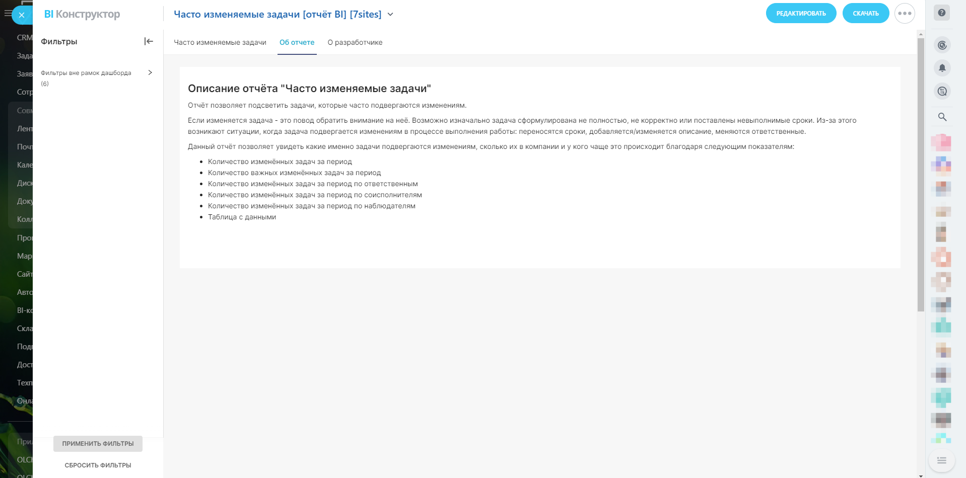 Данный отчёт позволяет увидеть какие именно задачи подвергаются изменениям, сколько их в компании и у кого чаще это происходит благодаря следующим показателям: