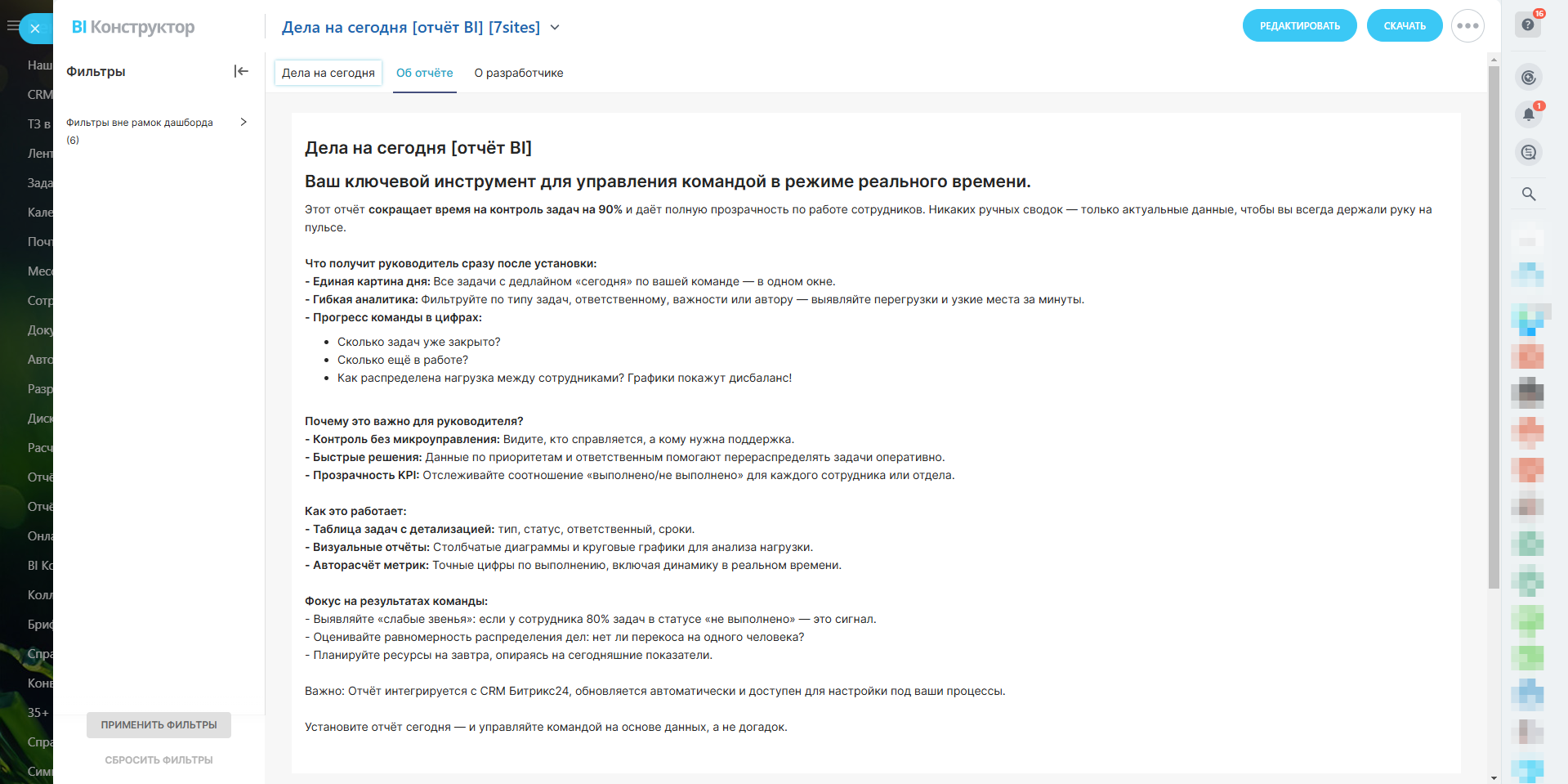 Этот отчёт сокращает время на контроль дел на 90% и даёт полную прозрачность по работе сотрудников. Никаких ручных сводок — только актуальные данные, чтобы вы всегда держали руку на пульсе.