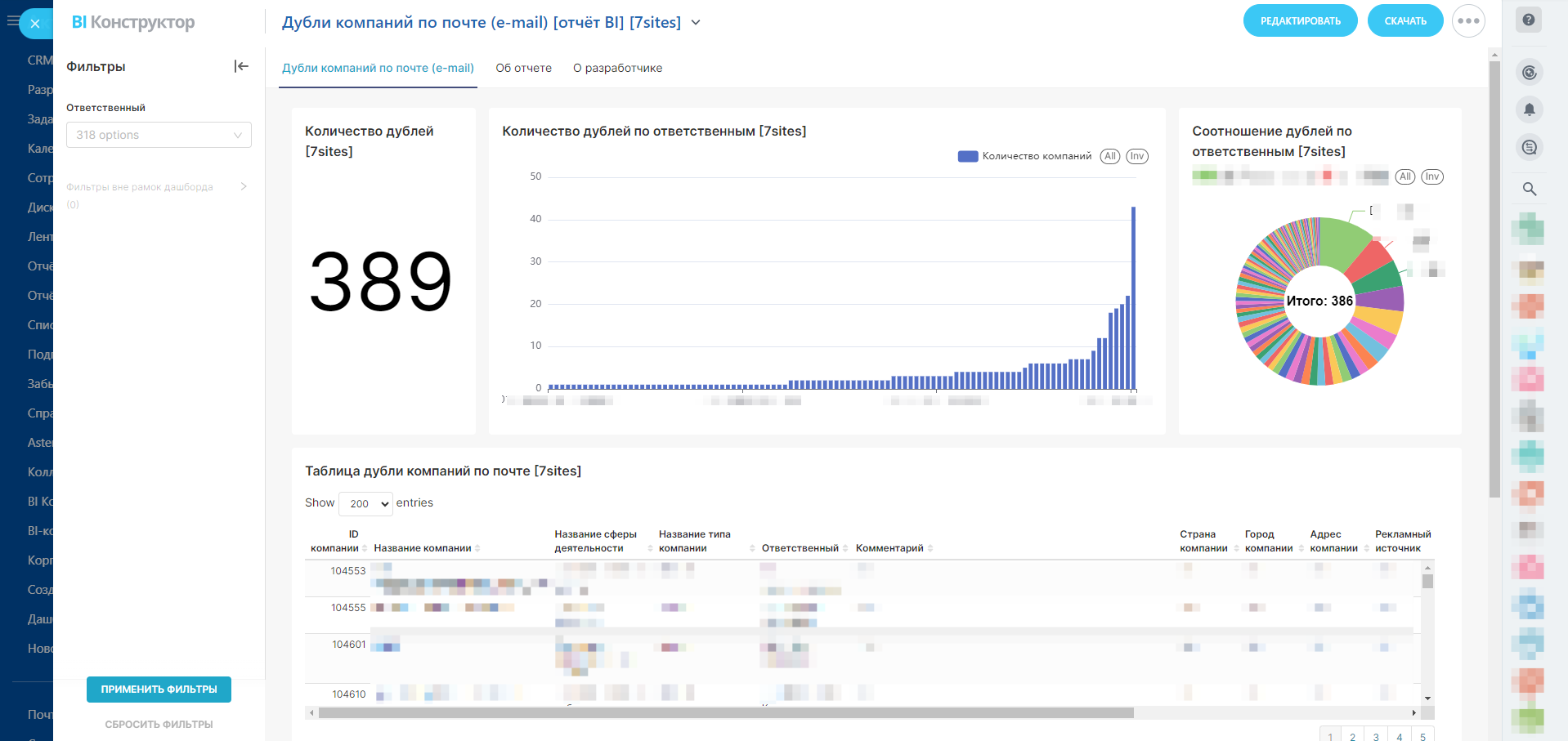 В отличие от стандартных средств поиска дублей, в отчёте можно сравнивать количество дублей как по ответственному в визуально удобном виде, так и в виде классической таблицы. Это даёт возможность сузить поиск причин образования дублей.
