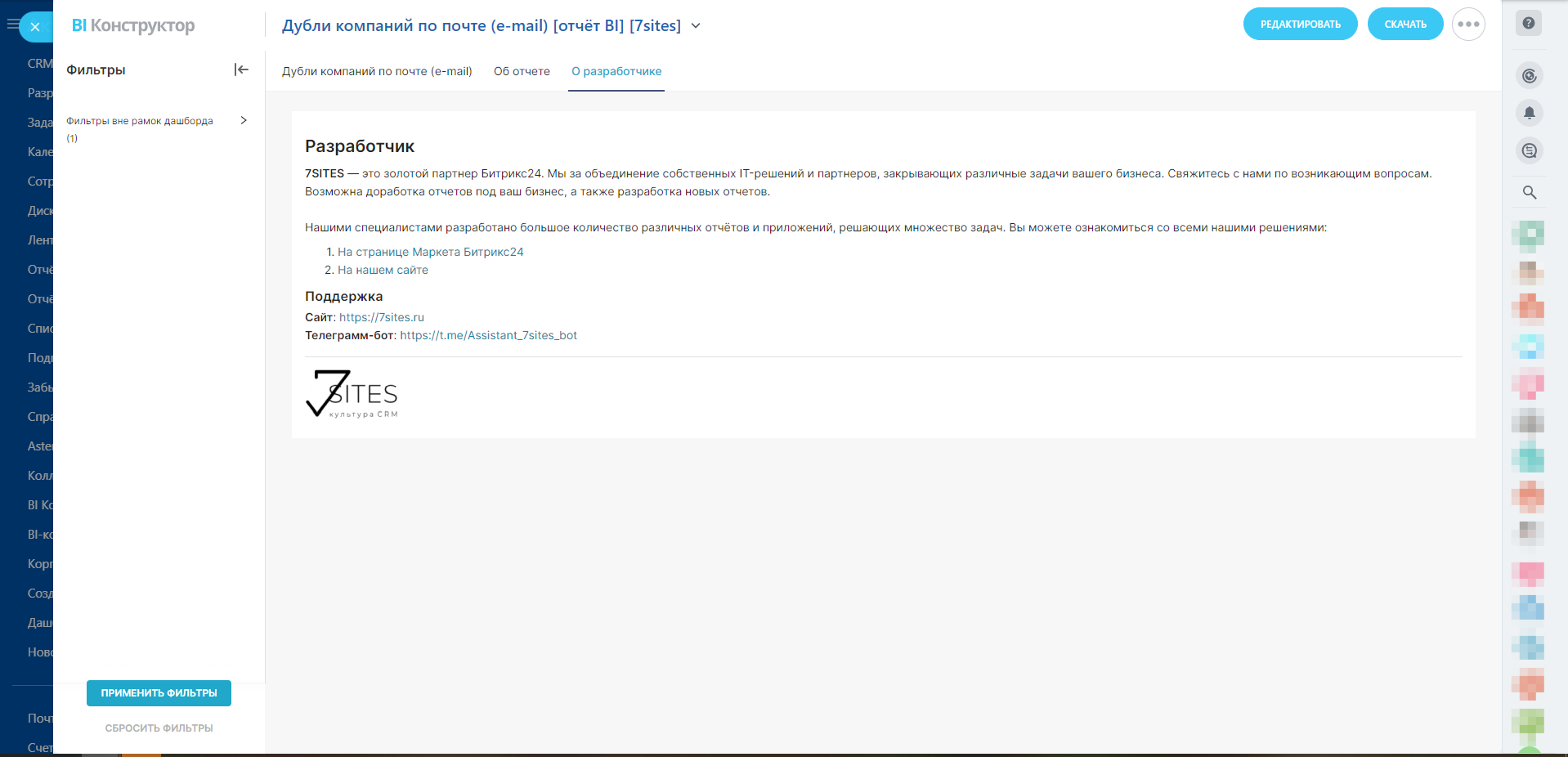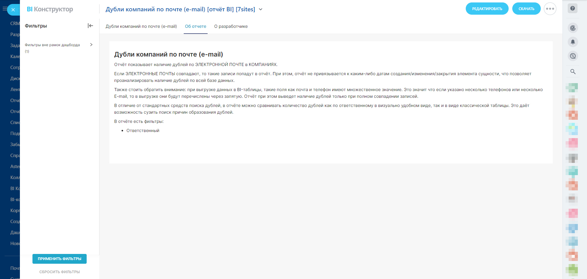 Также стоить обратить внимание: при выгрузке данных в BI-таблицы, такие поля как почта и телефон имеют множественное значение. Это значит что если указано несколько телефонов или несколько E-mail, то в выгрузке они будут перечислены через запятую. Отчёт при этом выведет наличие дублей только при полном совпадении записей.