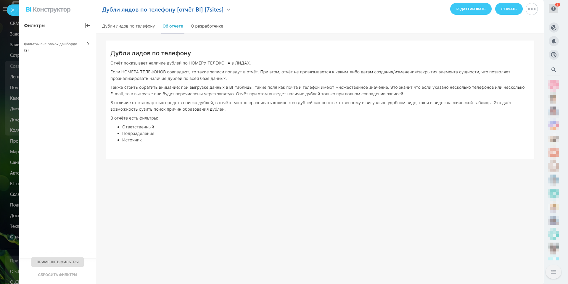 Также стоить обратить внимание: при выгрузке данных в BI-таблицы, такие поля, как почта и телефон имеют множественное значение. Это значит, что если указано несколько телефонов или несколько E-mail, то в выгрузке они будут перечислены через запятую. Отчёт при этом выведет наличие дублей только при полном совпадении записей.