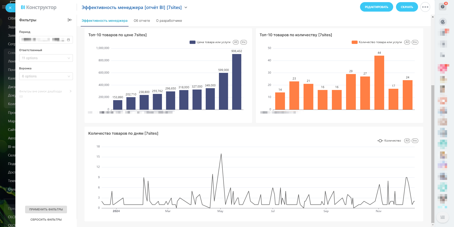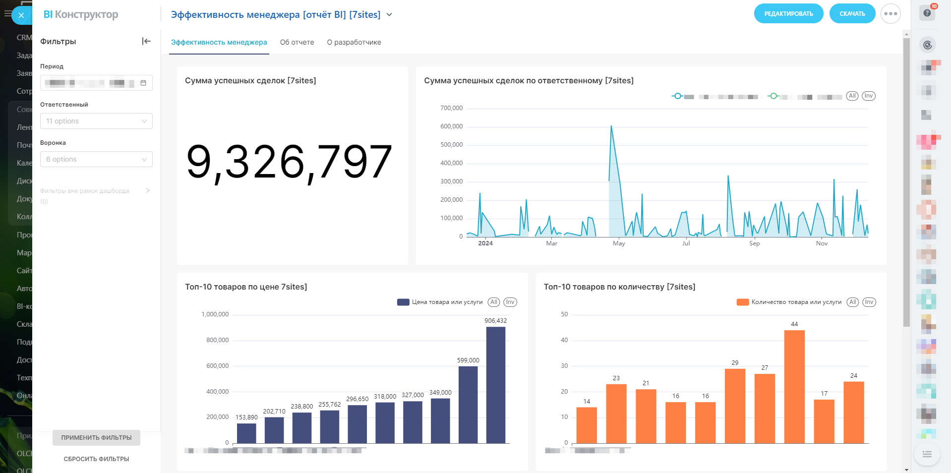 Вы можете отслеживать данные по конкретным периодам, ответственным менеджерам или воронкам продаж, что делает отчёт максимально адаптивным под ваши нужды.