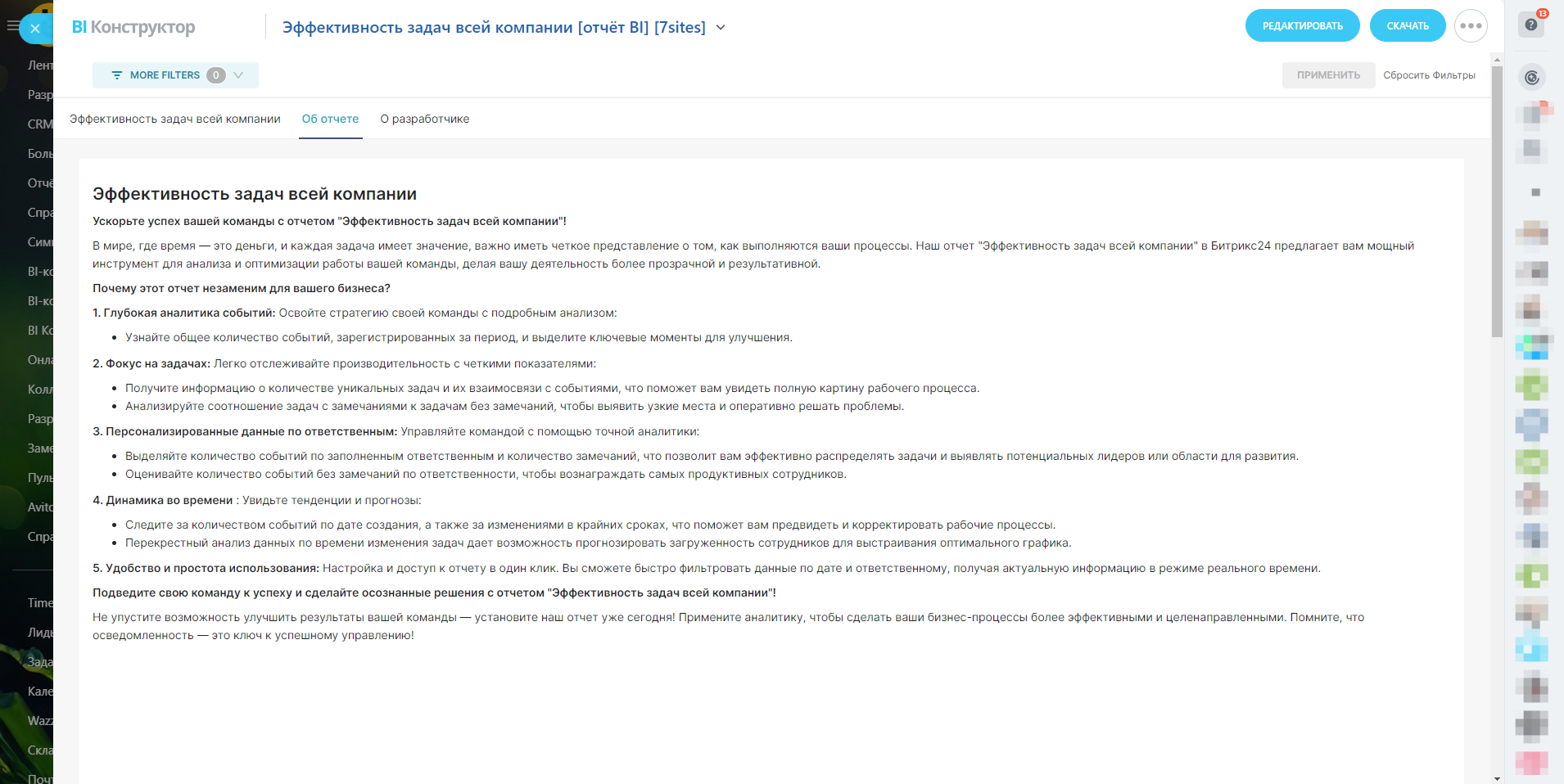 В мире, где время — это деньги, и каждая задача имеет значение, важно иметь четкое представление о том, как выполняются ваши процессы. Наш отчет "Эффективность задач всей компании" в Битрикс24 предлагает вам мощный инструмент для анализа и оптимизации работы вашей команды, делая вашу деятельность более прозрачной и результативной.