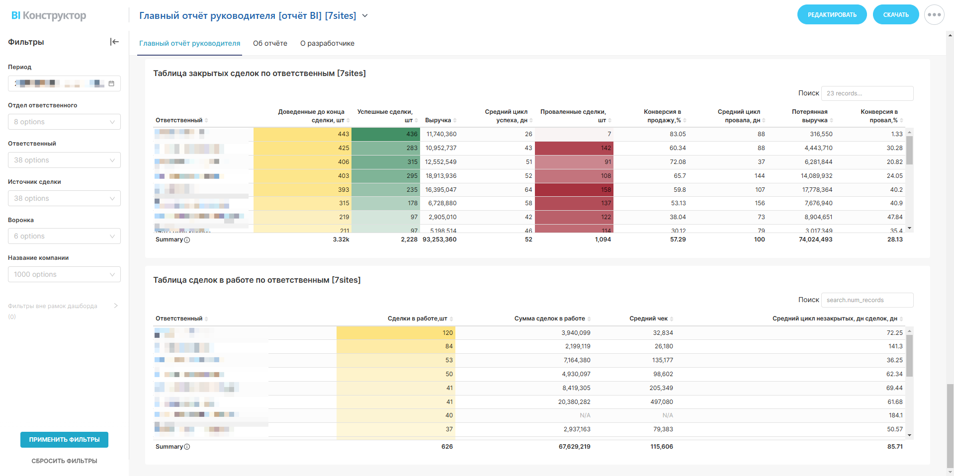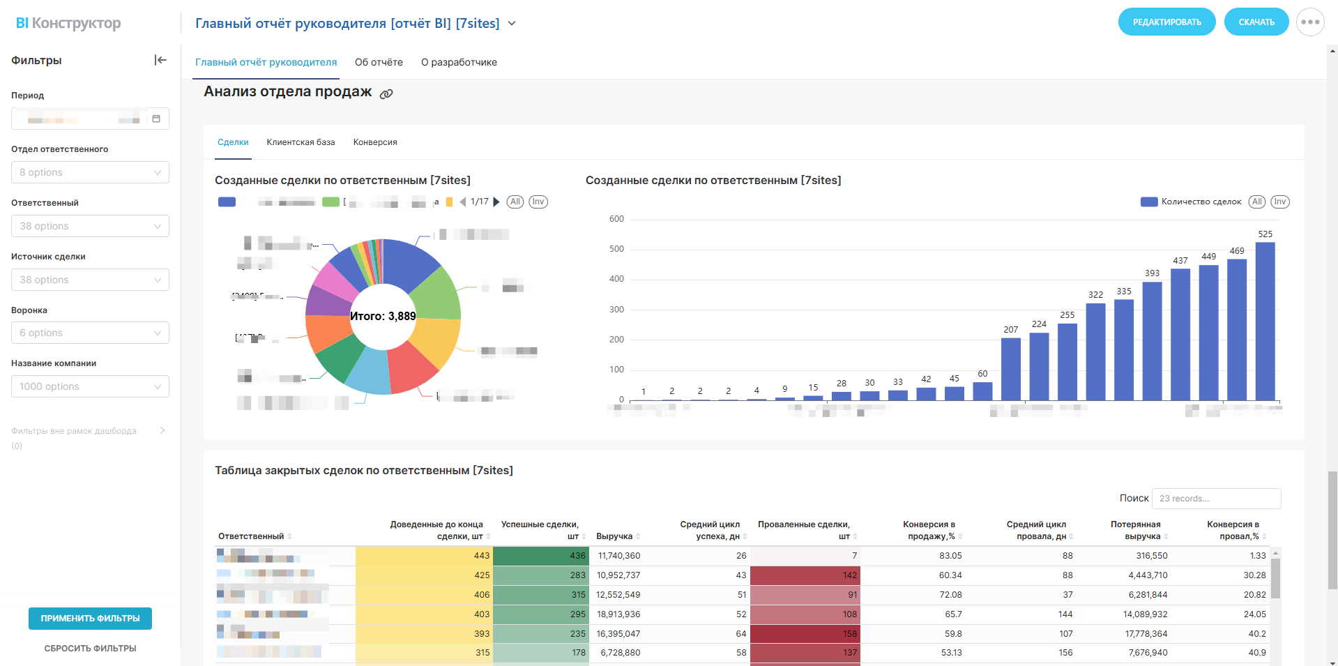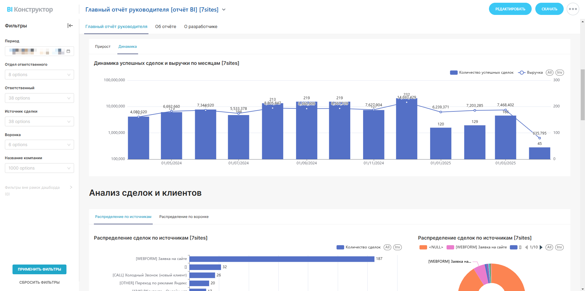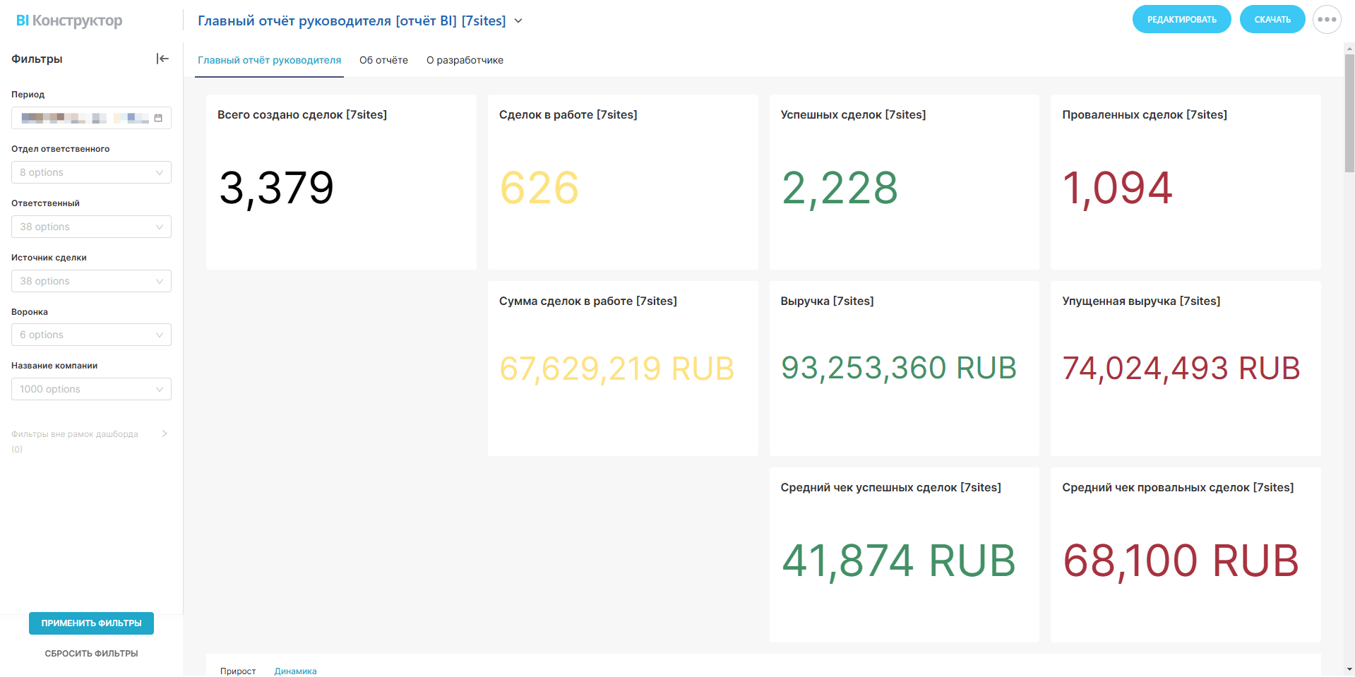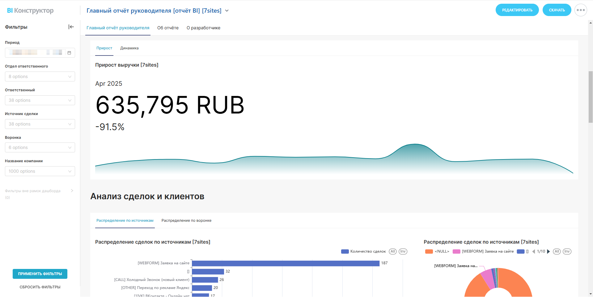 Фильтры под ваш запрос: Посмотрите данные за любой период, по отделам, менеджерам или конкретным компаниям.
