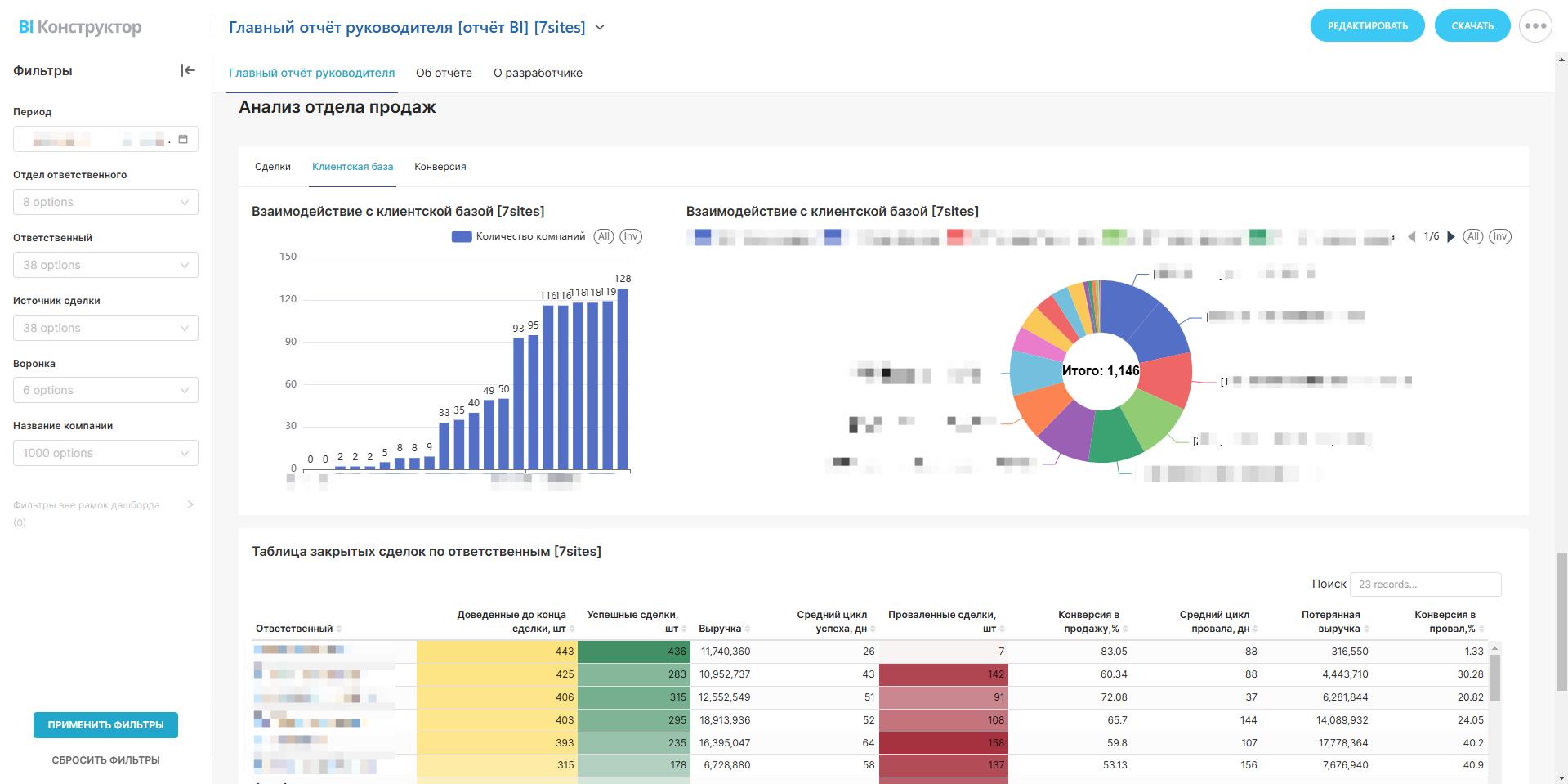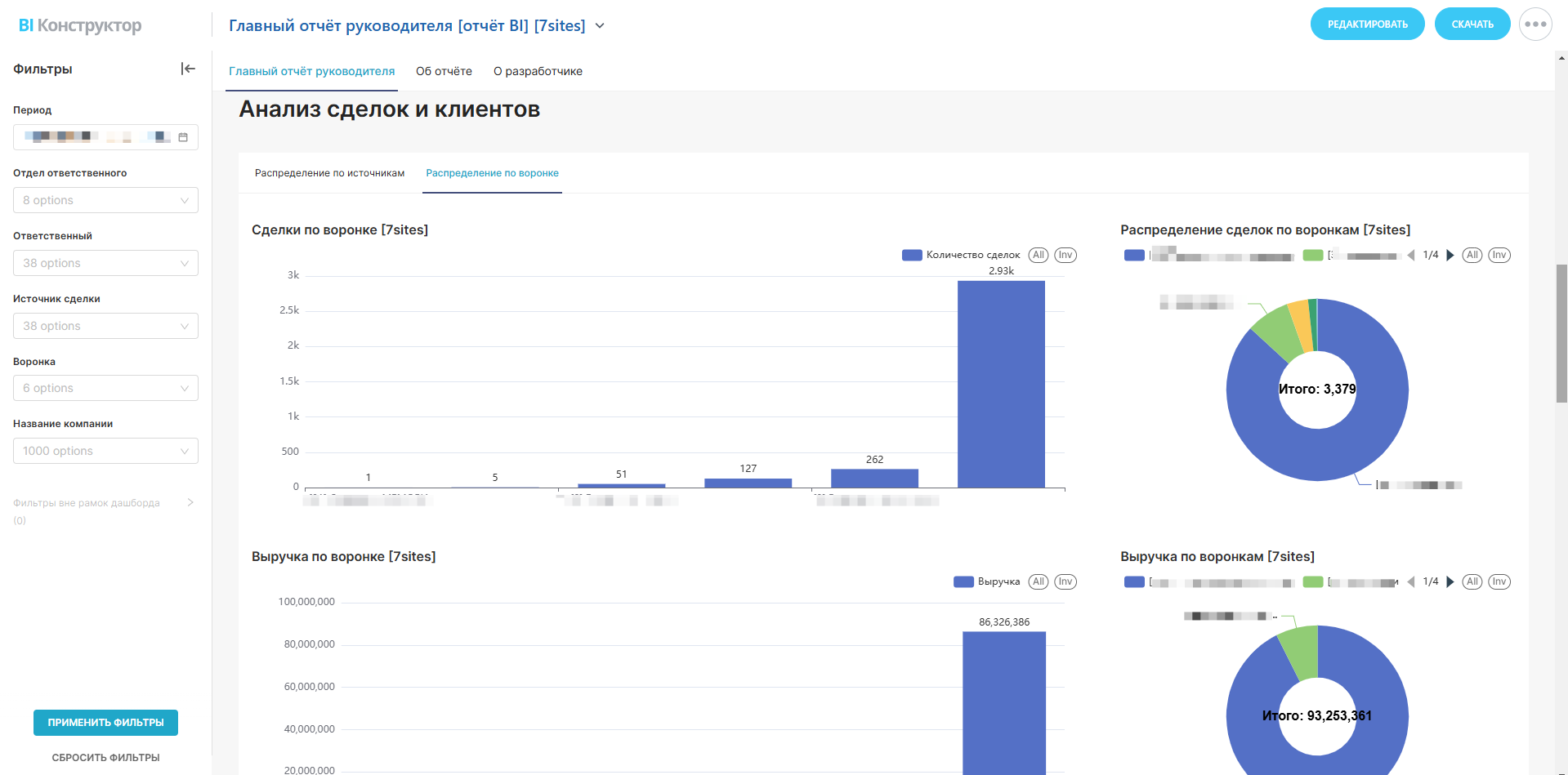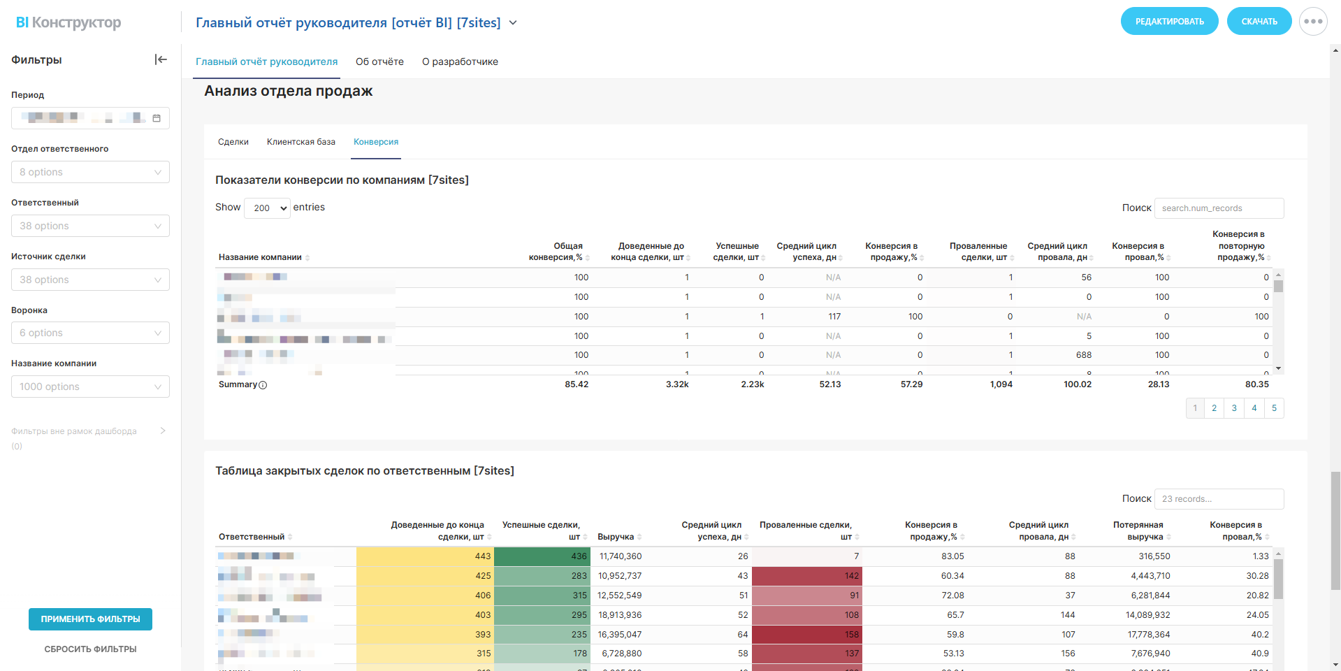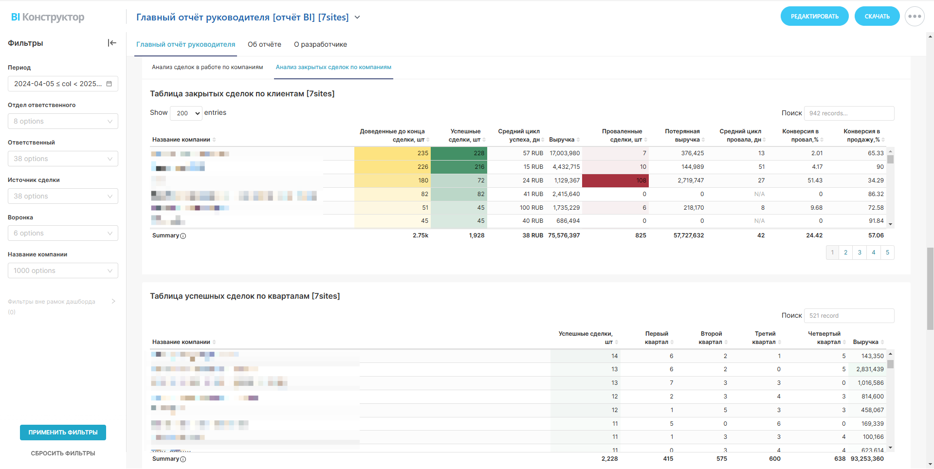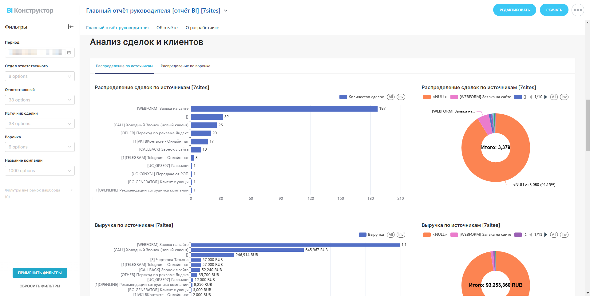 Фильтры под ваш запрос: Посмотрите данные за любой период, по отделам, менеджерам или конкретным компаниям.