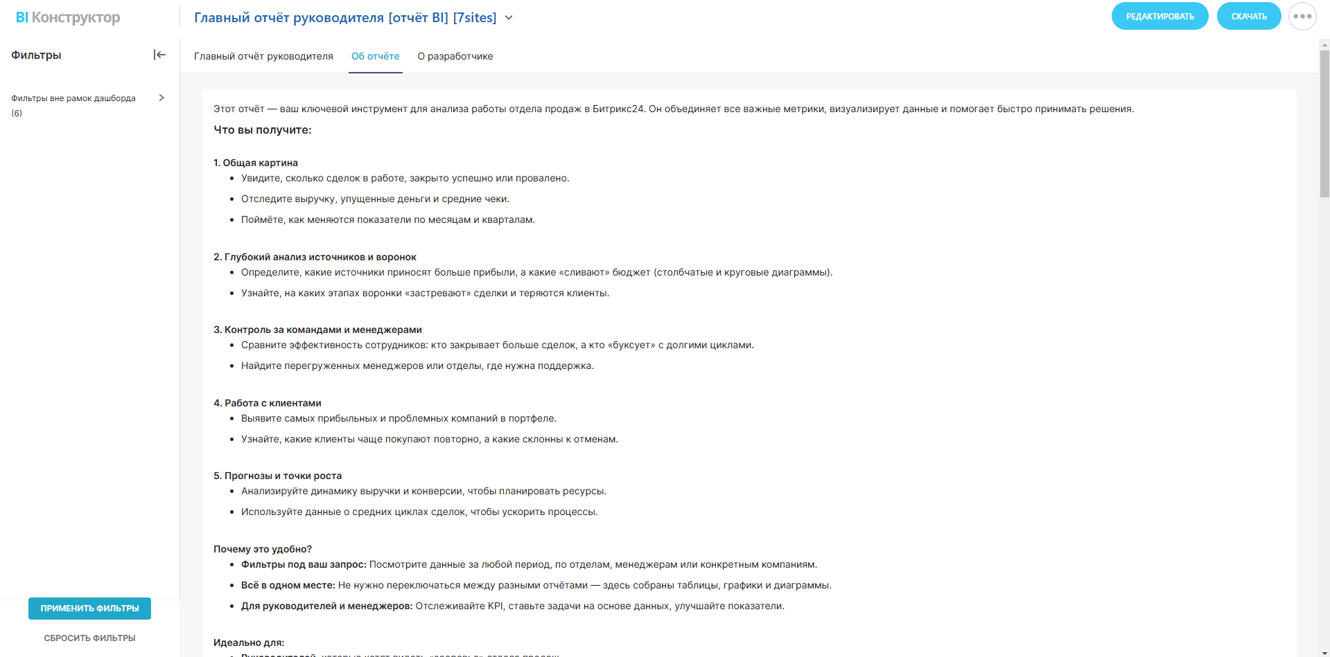 Этот отчёт — ваш ключевой инструмент для анализа работы отдела продаж в Битрикс24. Он объединяет все важные метрики, визуализирует данные и помогает быстро принимать решения.