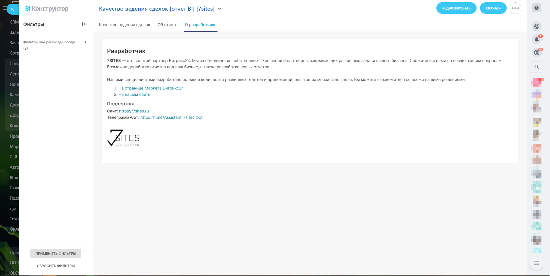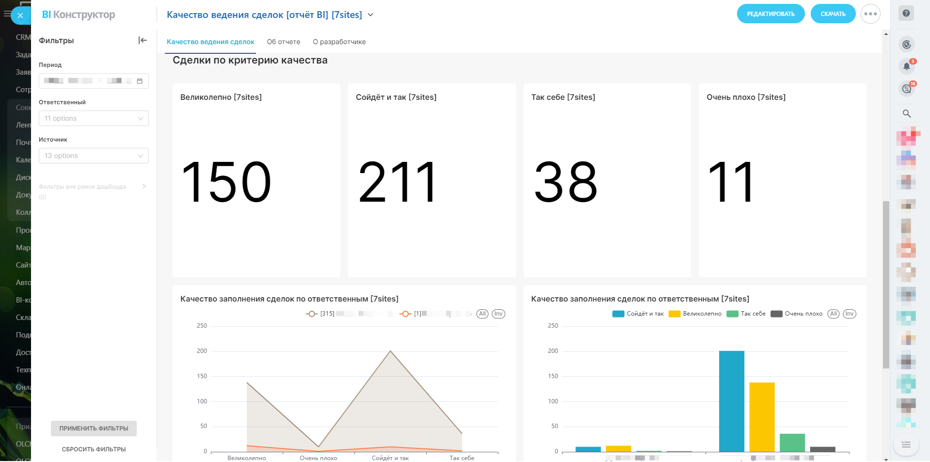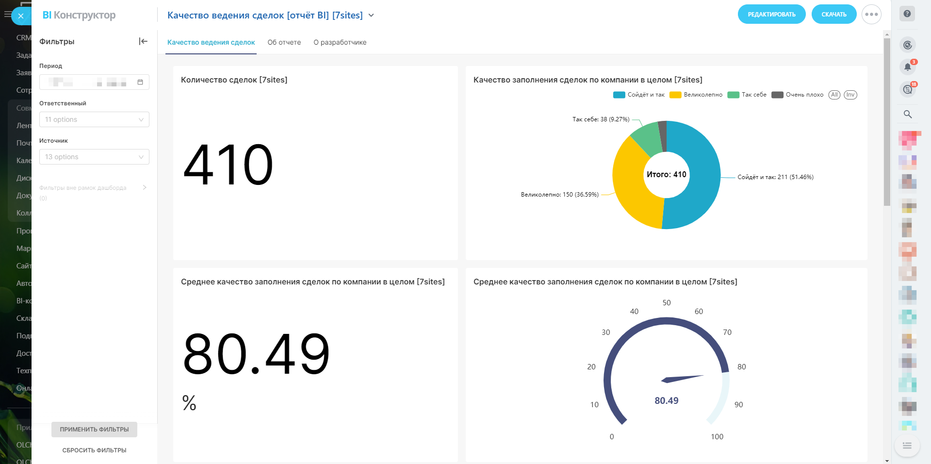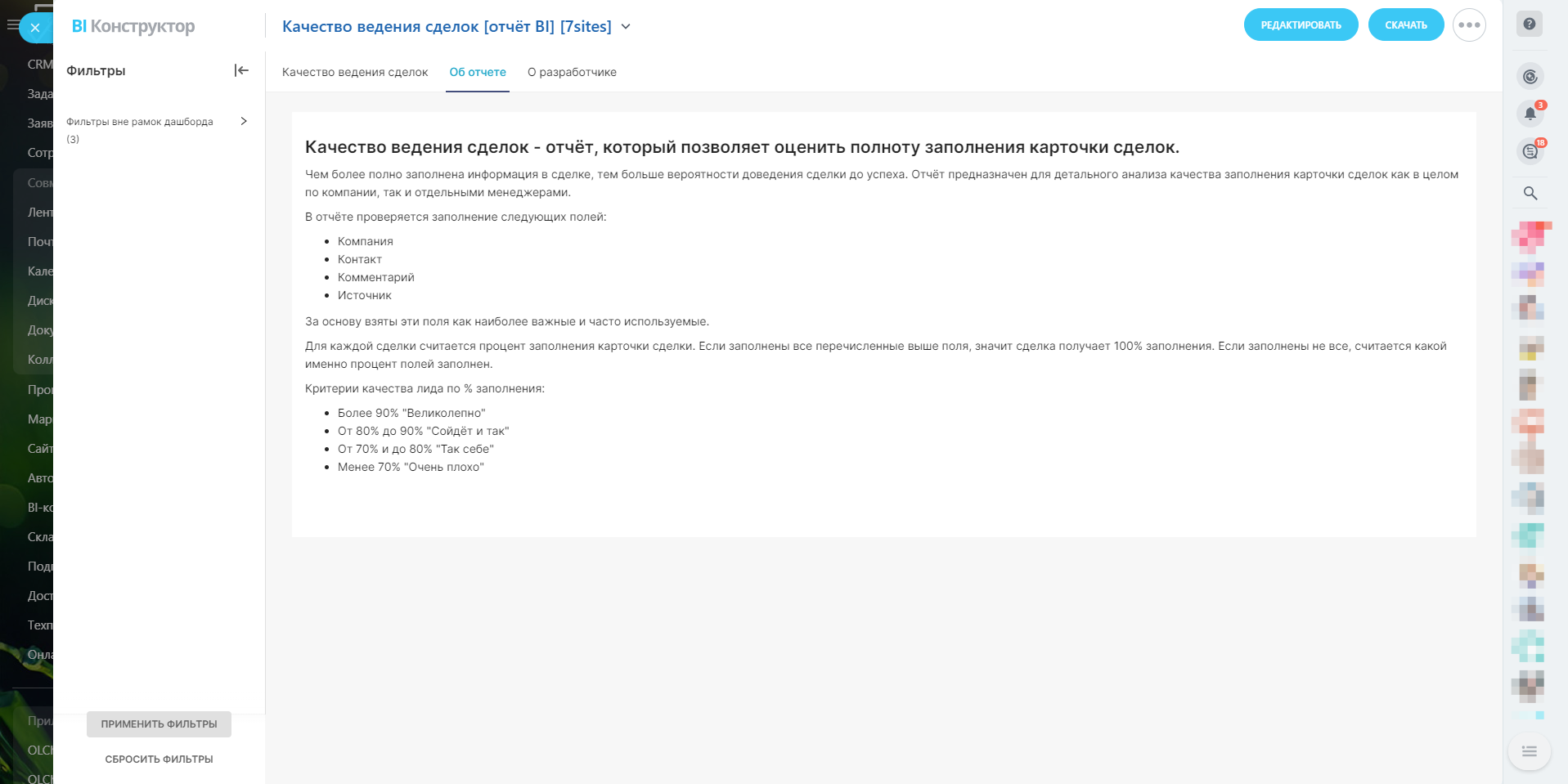 Чем более полно заполнена информация в сделке, тем больше вероятности доведения сделки до успеха. Отчёт предназначен для детального анализа качества заполнения карточки сделок как в целом по компании, так и отдельными менеджерами.
