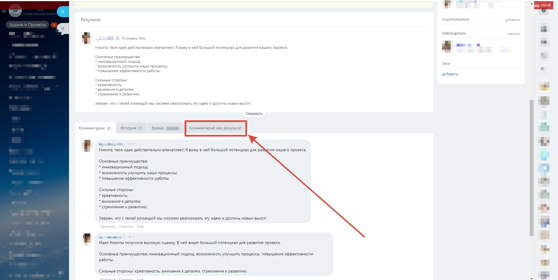Позволяет отмечать комментарий как результат любым участникам задачи