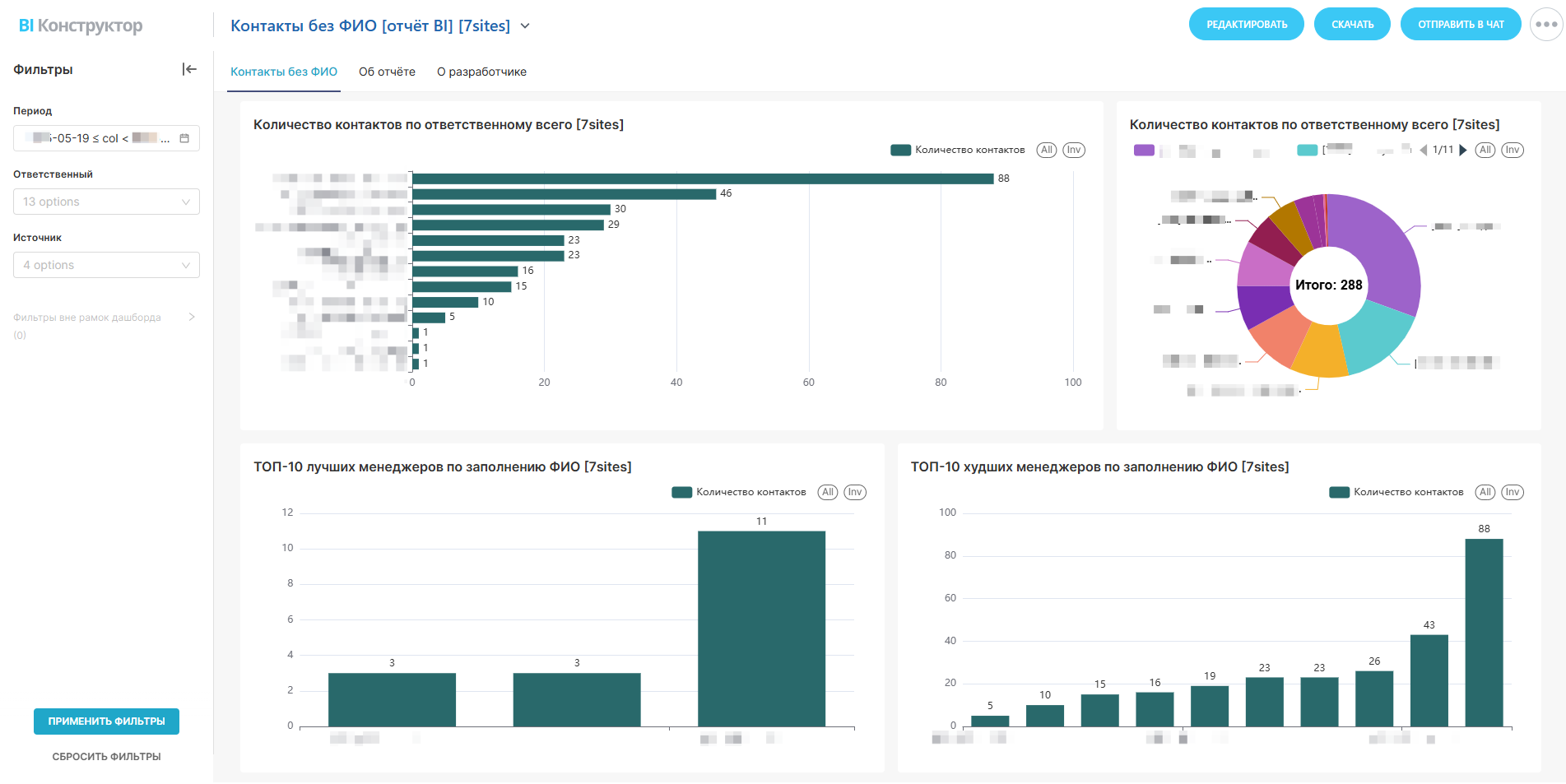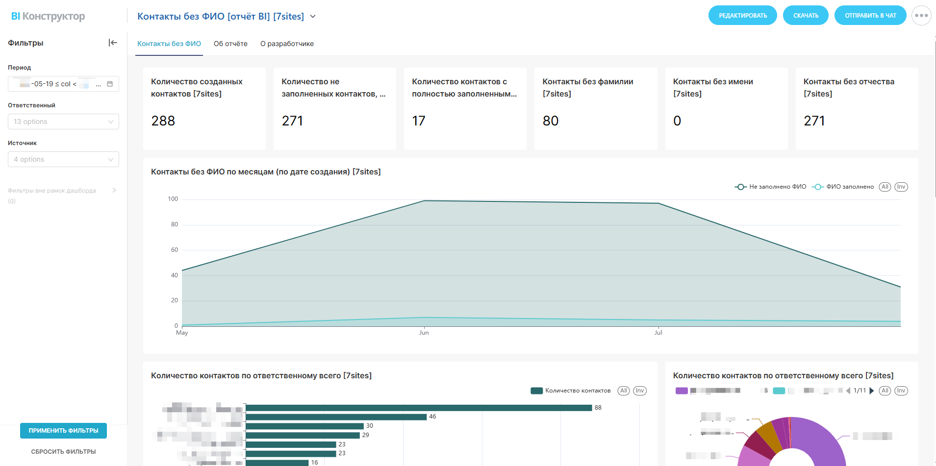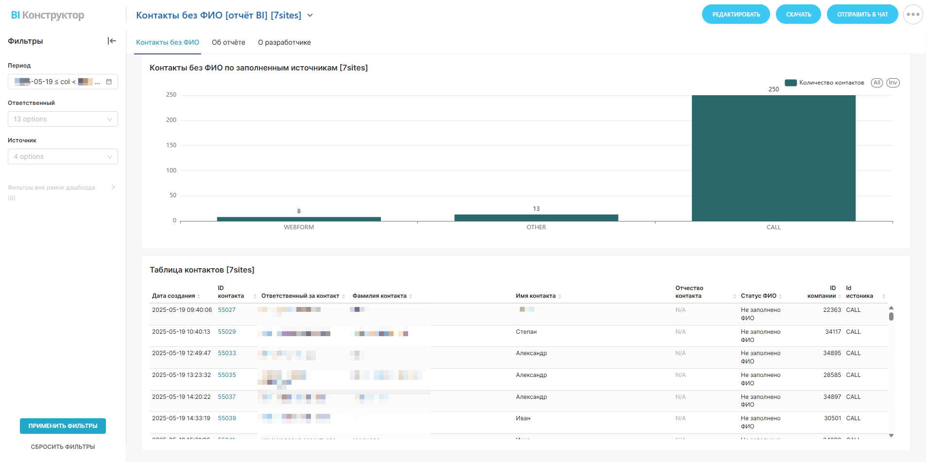 - Контакты без ФИО по заполнённым источникам: В этом разделе будет представлена информация о контактах без ФИО, сгруппированных по источникам их создания. Это позволит понять, с каких источников приходит больше всего неполных данных.