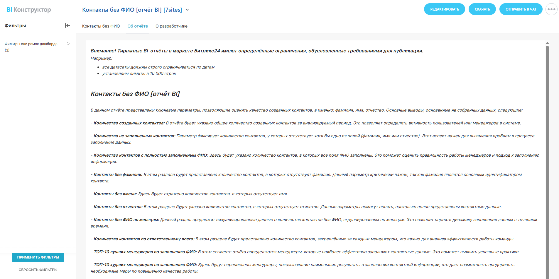 - ТОП-10 худших менеджеров по заполнению ФИО: Здесь будут перечислены менеджеры, показывающие наименьшие результаты в заполнении контактной информации, что даст возможность предпринять необходимые меры по повышению качества работы.