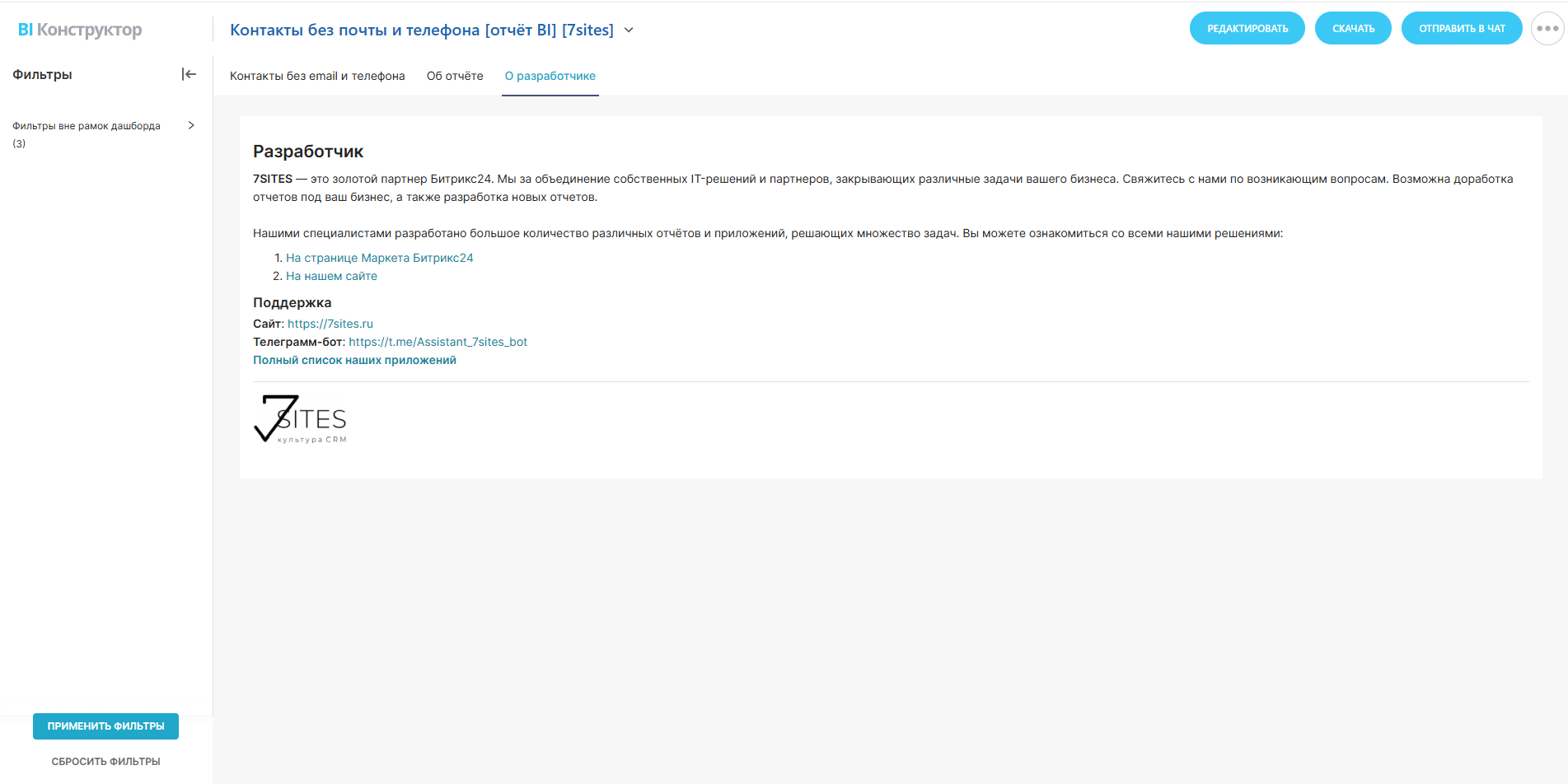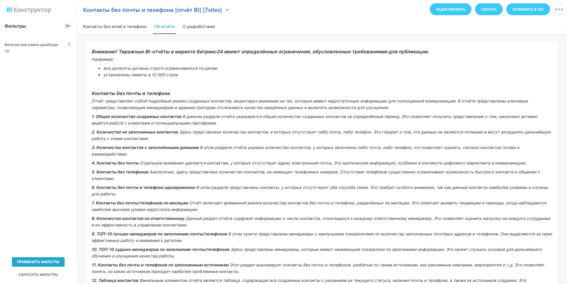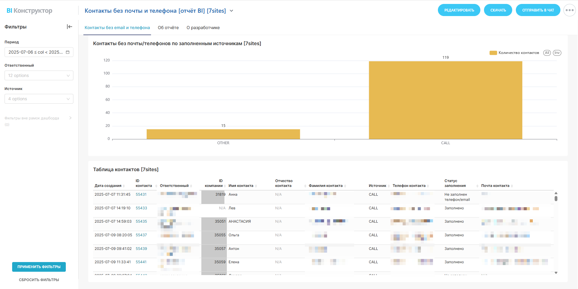 12. Таблица контактов. Финальным элементом отчёта является таблица, содержащая все созданные контакты с указанием их текущего статуса, наличия почты и телефона, а также их источников создания. Это предоставляет возможность детального анализа и оперативного реагирования на проблемы с данными.