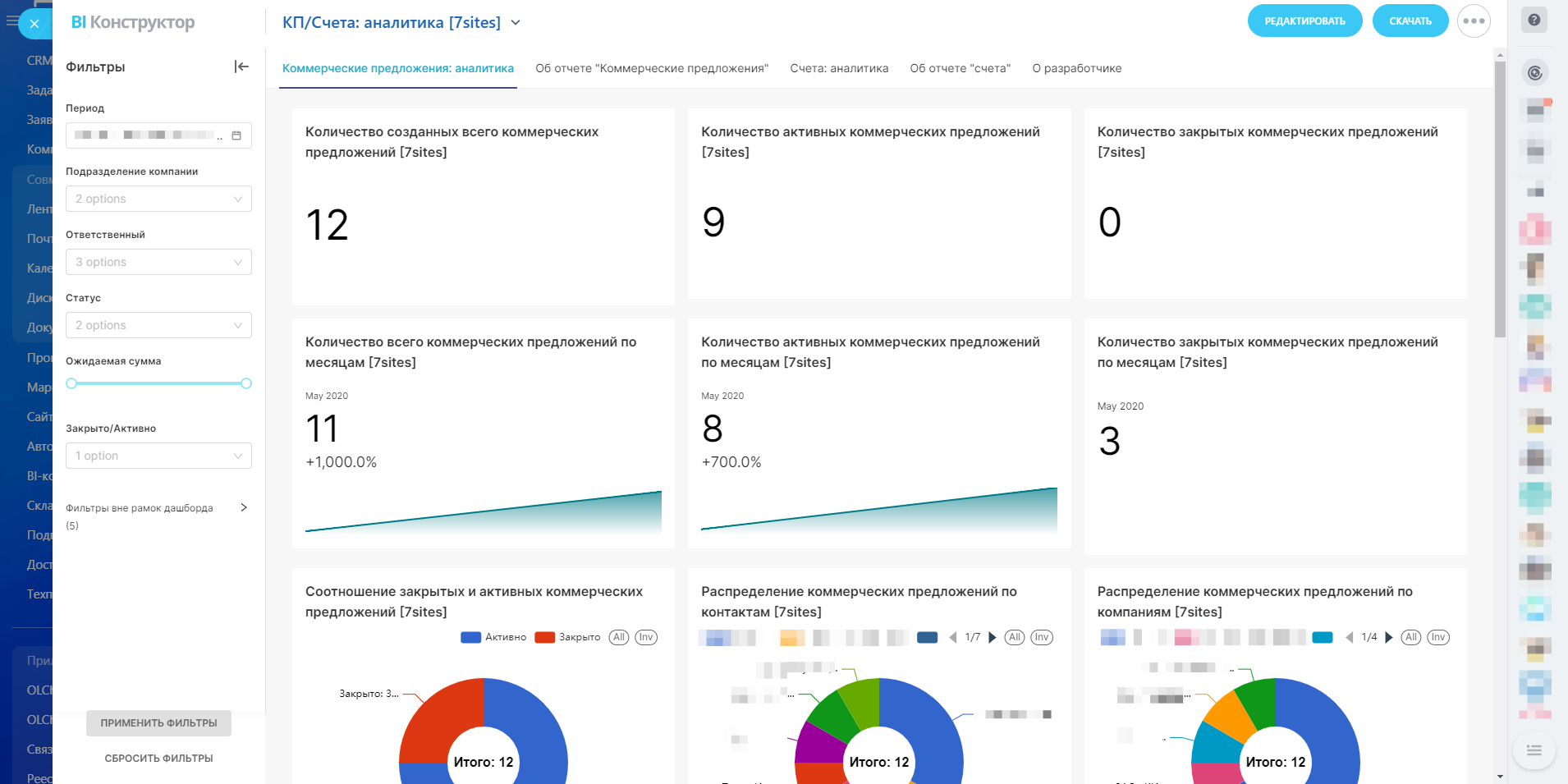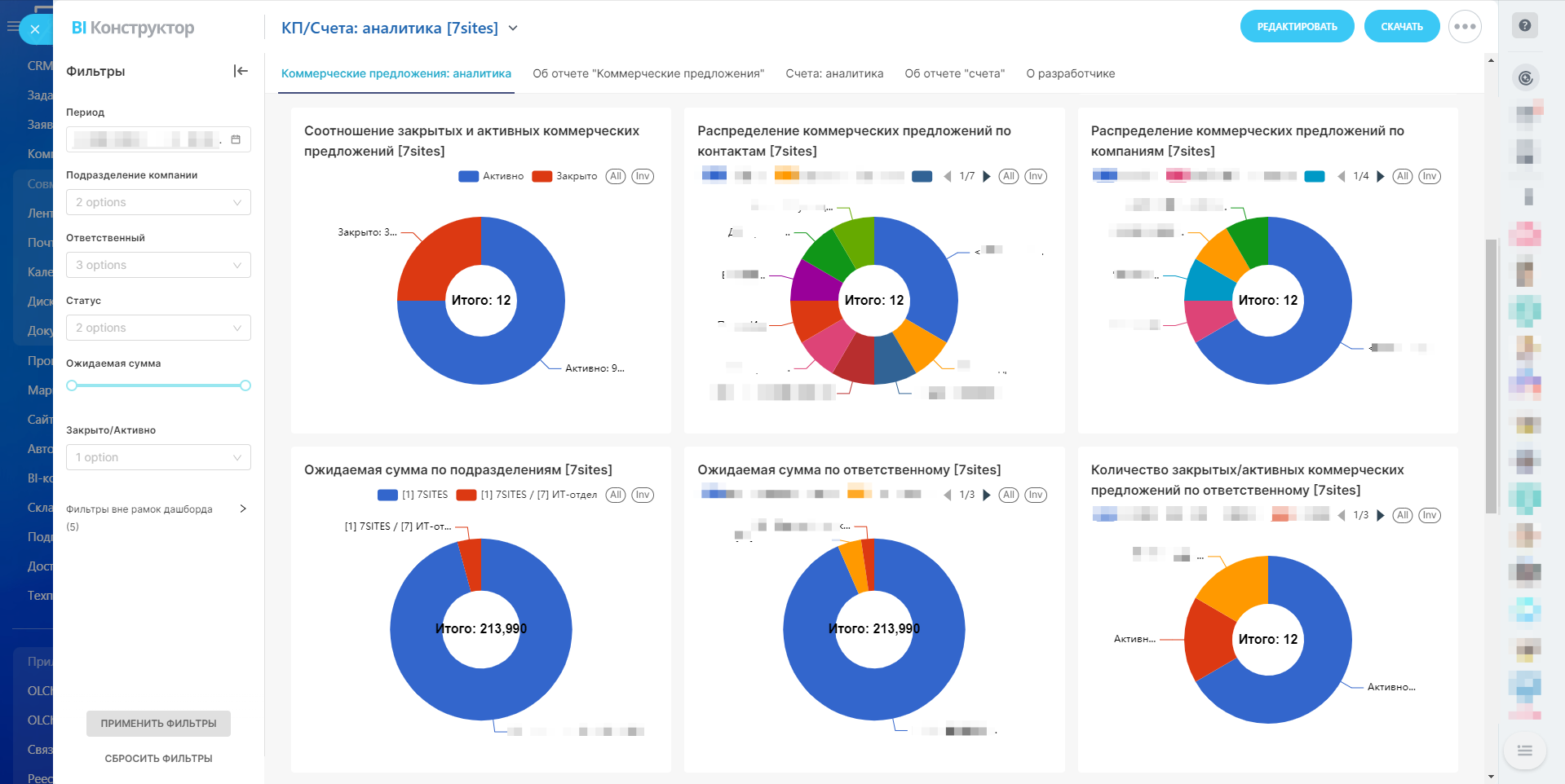 Распределение коммерческих предложений по контактам. Круговая диаграмма визуализирует, как распределяются коммерческие предложения по различным контактам. Это позволяет понять, какие клиенты наиболее активно участвуют в процессе.