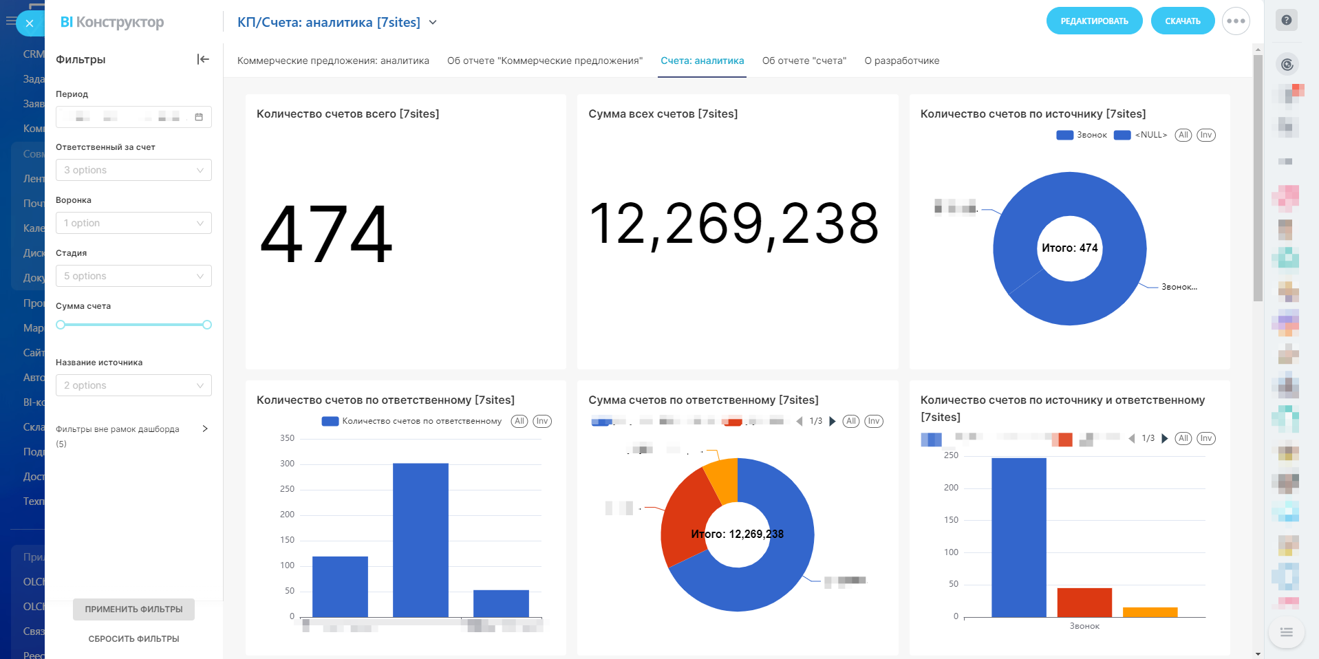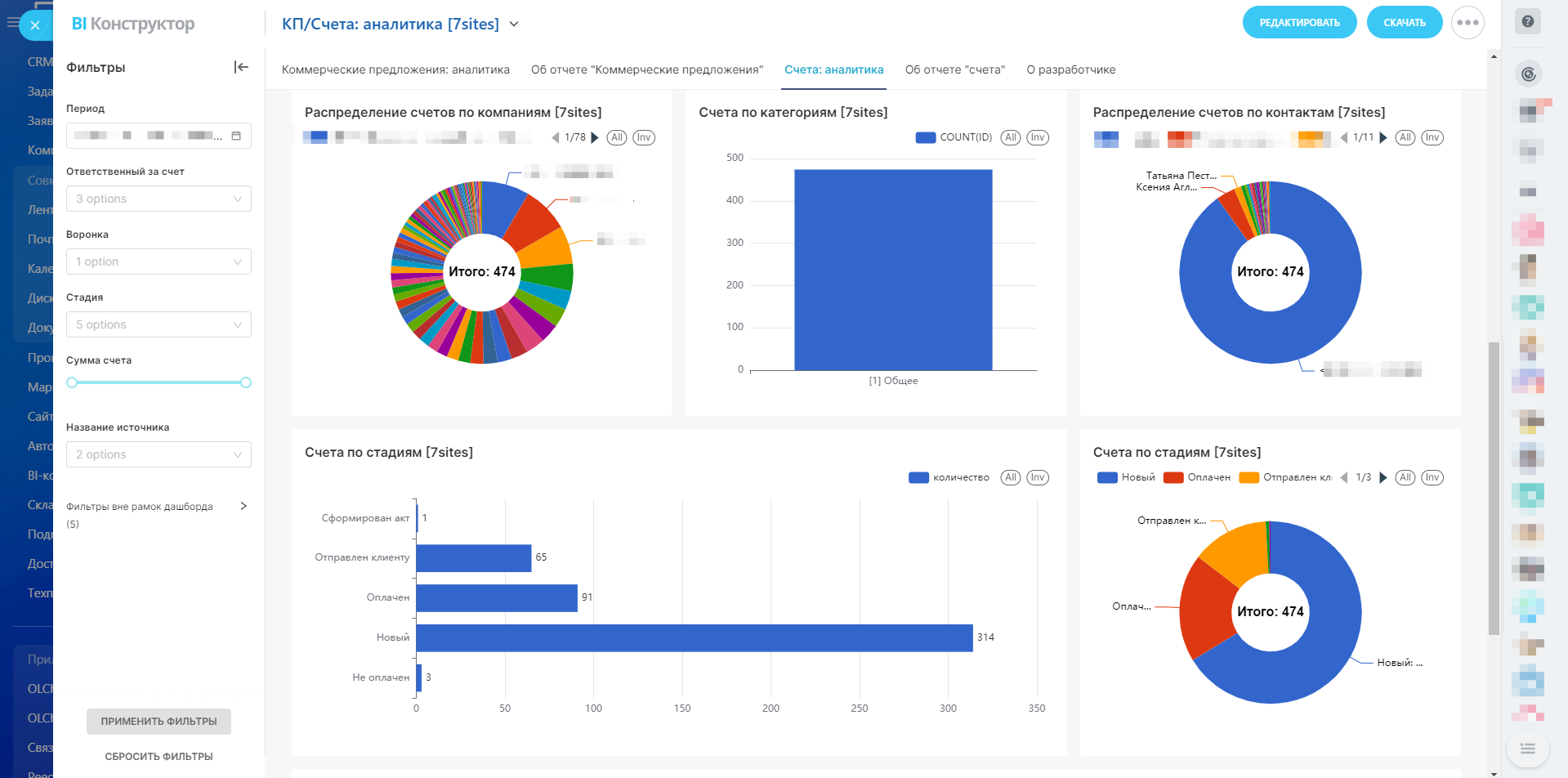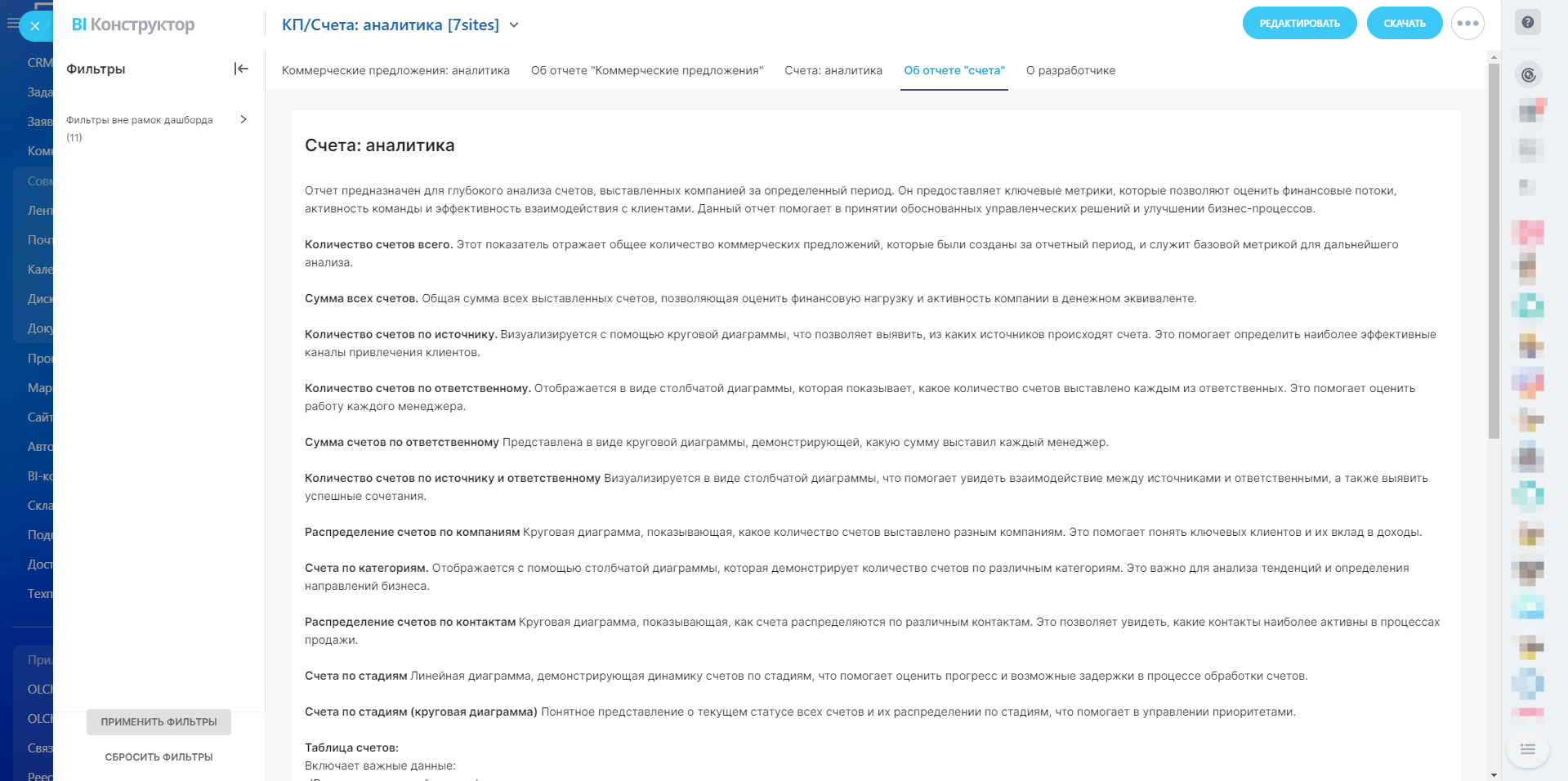 Счета: аналитикаОтчет предназначен для глубокого анализа счетов, выставленных компанией за определенный период. Он предоставляет ключевые метрики, которые позволяют оценить финансовые потоки, активность команды и эффективность взаимодействия с клиентами. Данный отчет помогает в принятии обоснованных управленческих решений и улучшении бизнес-процессов.